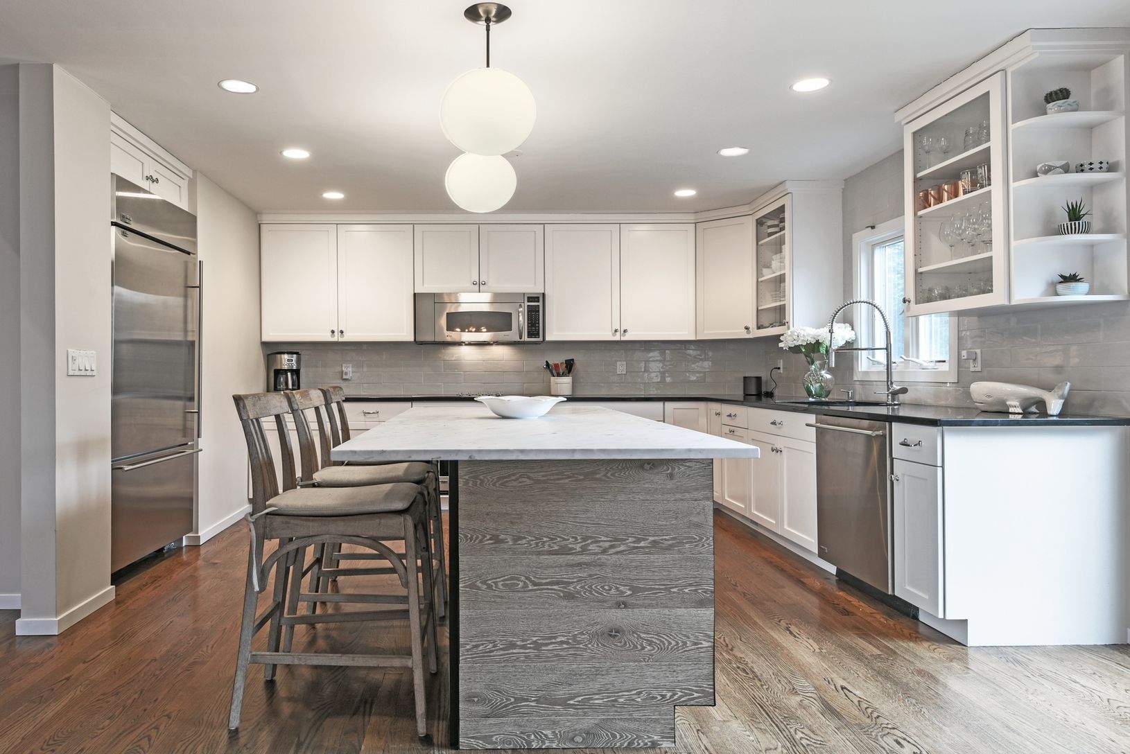Located in the charming Village of Quogue, this home has been recently renovated by an award winning design firm. The new kitchen includes a spacious entertaining island with a wine refrigerator and a marble counter top. The open living room features high ceilings and sliding doors that bring in lots of light and allow for easy access out to the heated pool, har-tru tennis court and the large Trex deck including an electric awning. A new wo