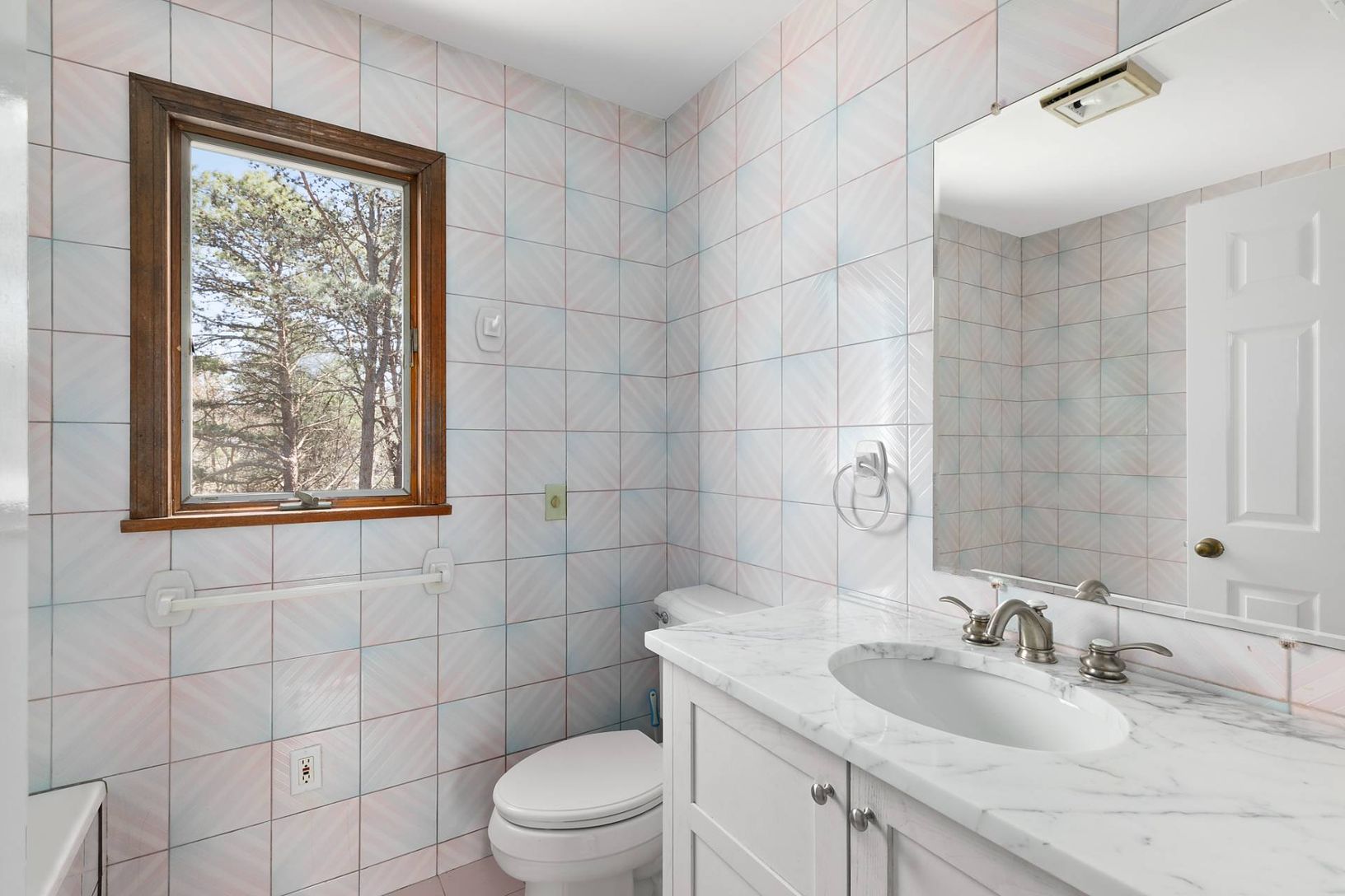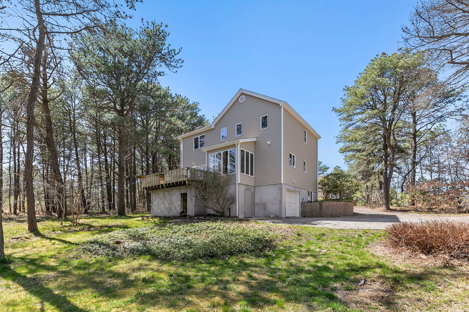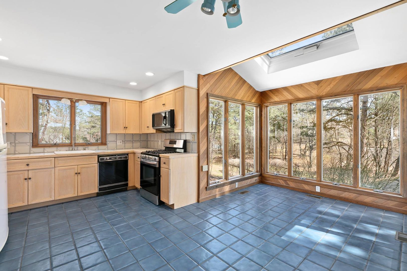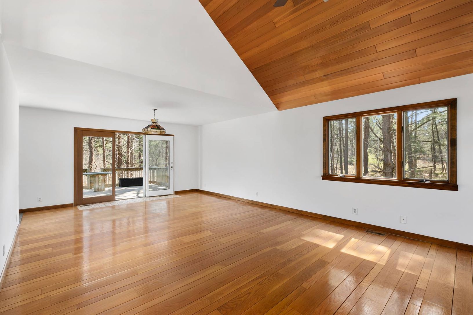 This traditional home in Shinnecock Hills is located at the end of a cul-de-sac and is ideally located close the Bay Beaches and a 6 minute drive to Southampton Village. The open floor plan of the living room with fireplace, dinning room and eat in kitchen are perched over a park like setting of just under 1 acre of land. A large stone fireplace is the centerpiece of the a well proportioned living room with vaulted cedar ceiling. The first flo