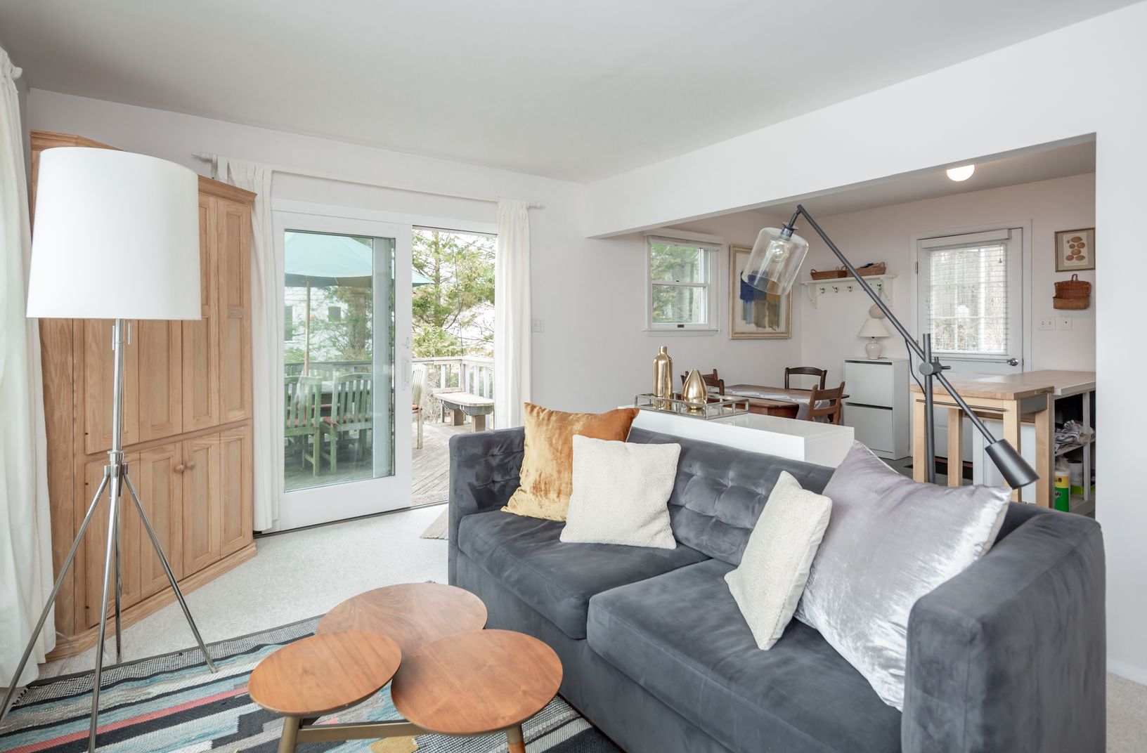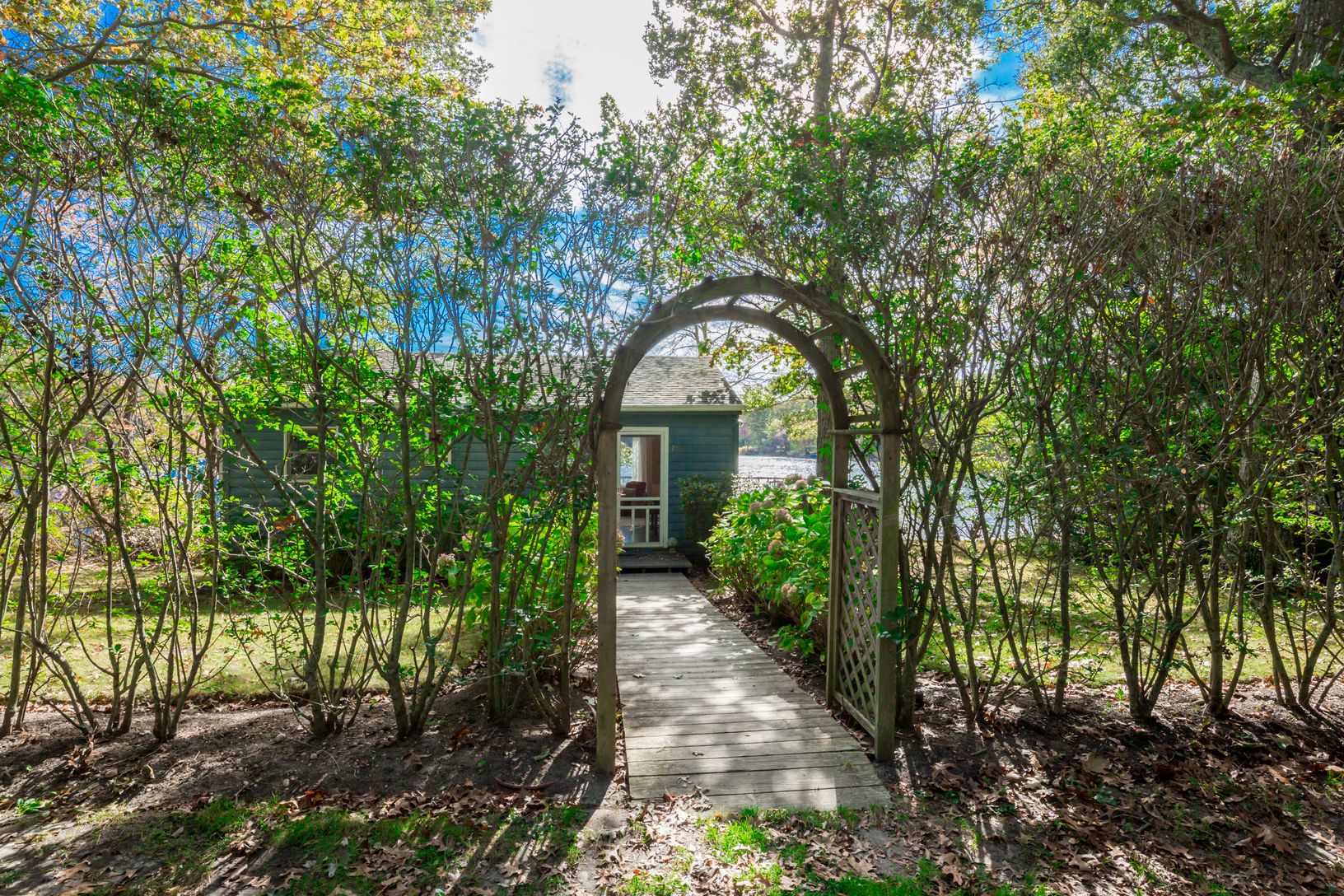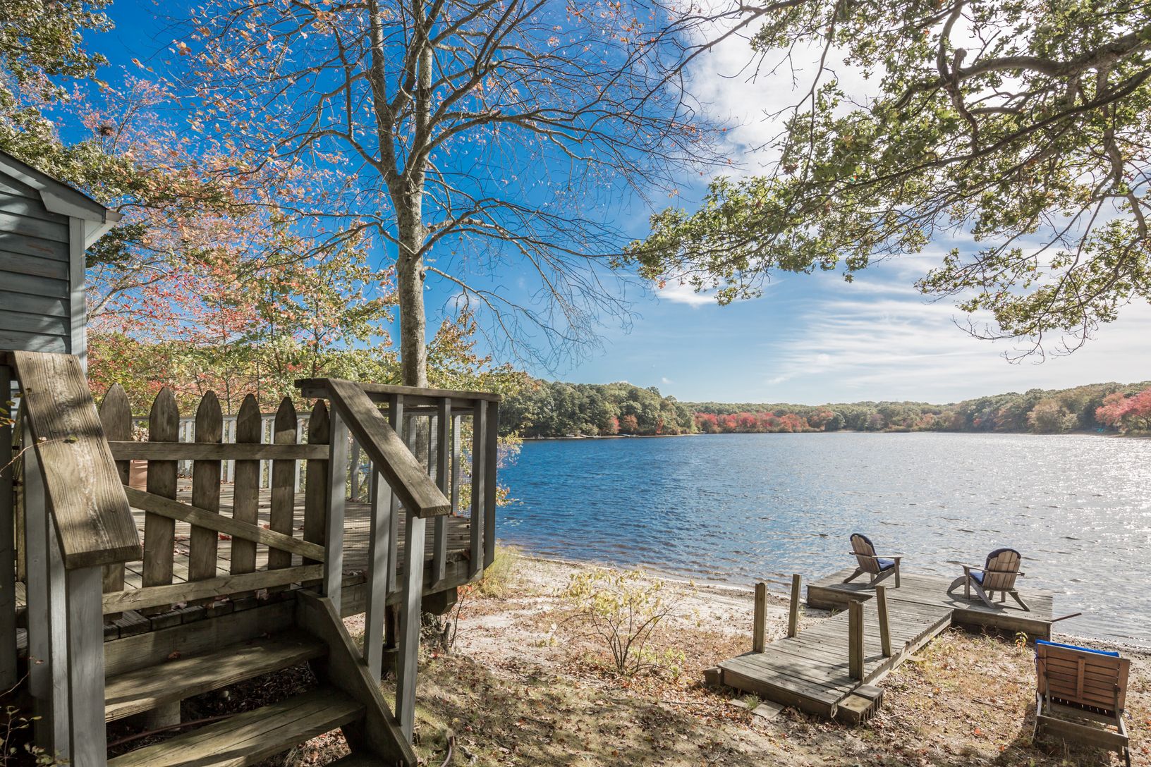 Original 1950s "summer cottage" has been modernized over the decades, is extremely well-maintained, and offers two-bedrooms, a full bath, and best of all: An 85+/- ft waterfront with dock on Little Fresh Pond. The 650 sq.ft. open plan living space with kitchen and dining can be expanded. In the warm seasons, the house opens up to offer more living space - a wraparound deck with grill serves as a larger dining area. The private back deck works