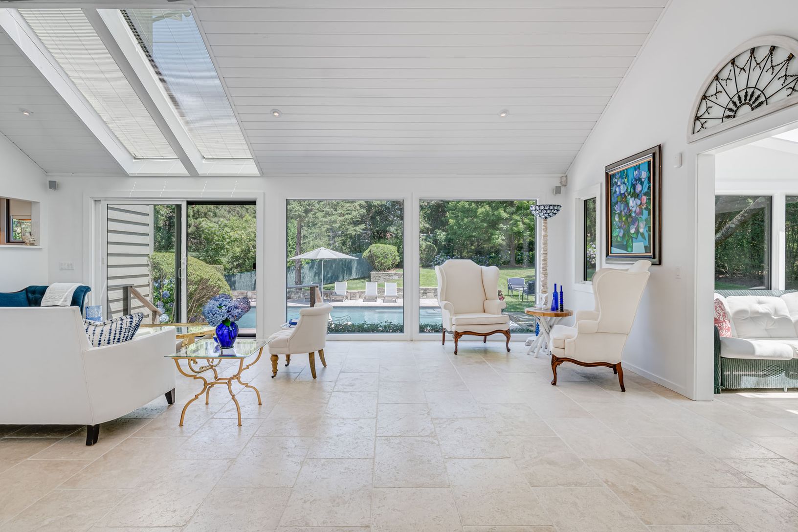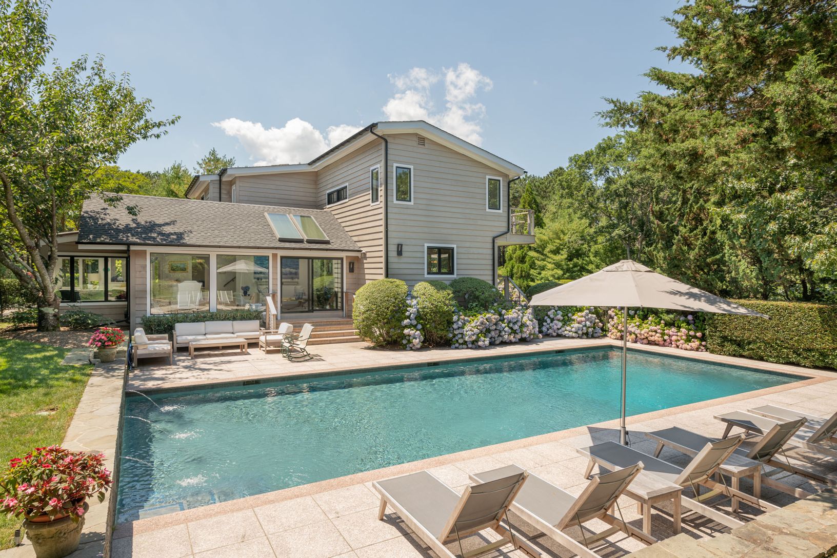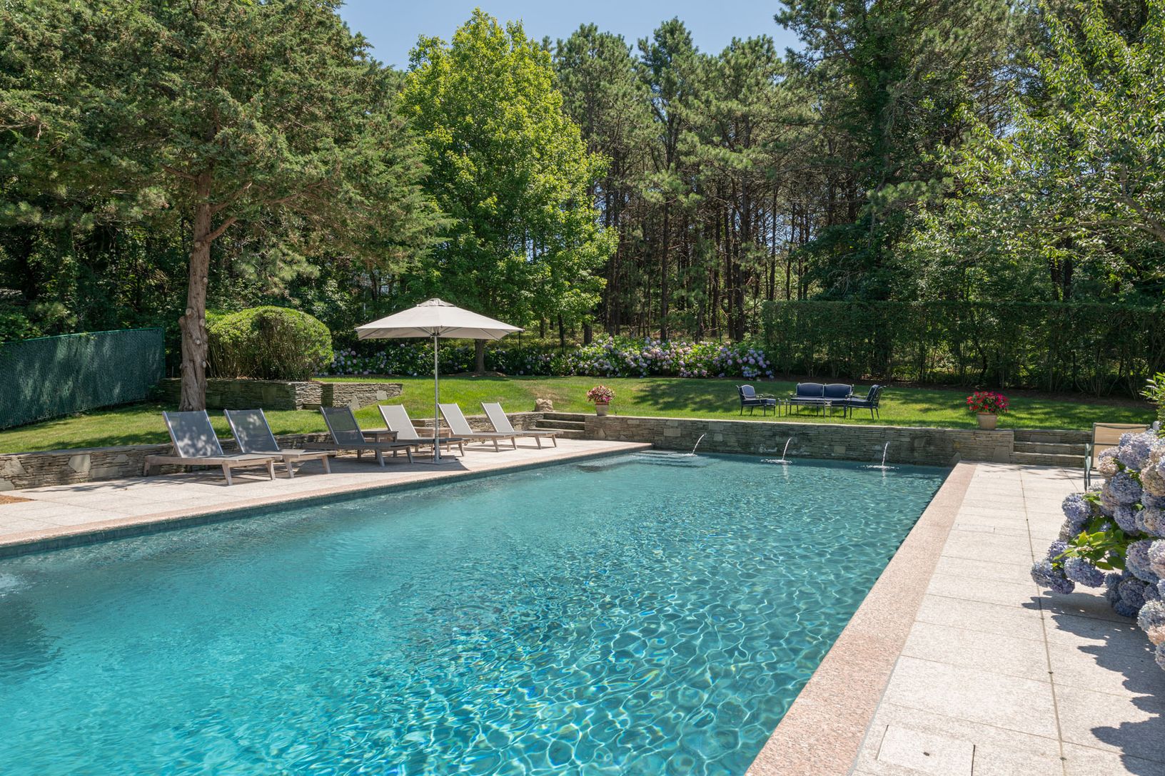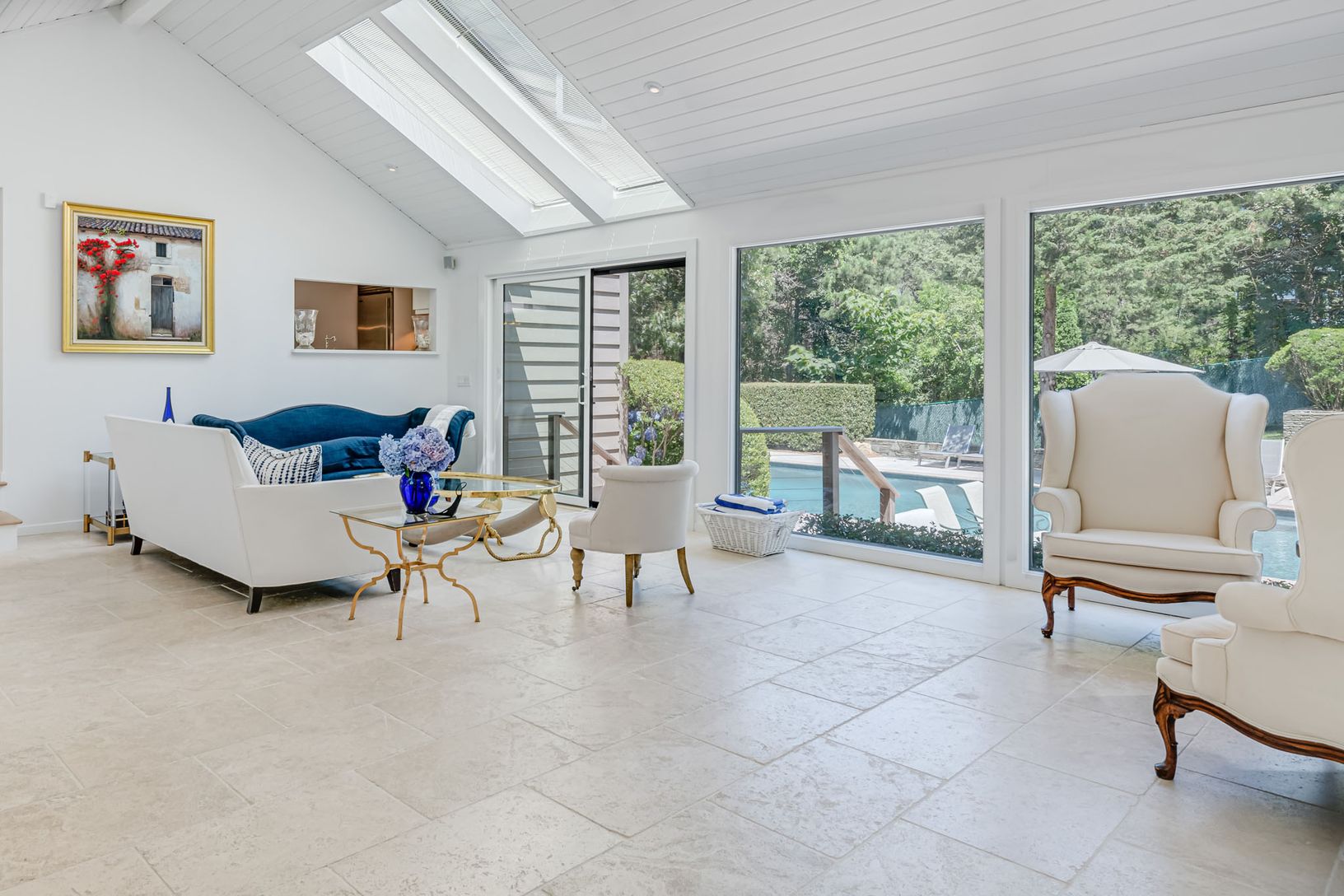 Every design detail has been meticulously considered at this immaculate, sun-filled modern on a gorgeously landscaped super-private shy acre in the Southampton Highlands. The vaulted living room with floor to ceiling doors overlooks the expansive granite patio with multiple seating areas, exquisite plantings and a 48-foot heated gunite pool accented with stacked stone and cascading fountains. The open floor plan also offers a charming sunroom