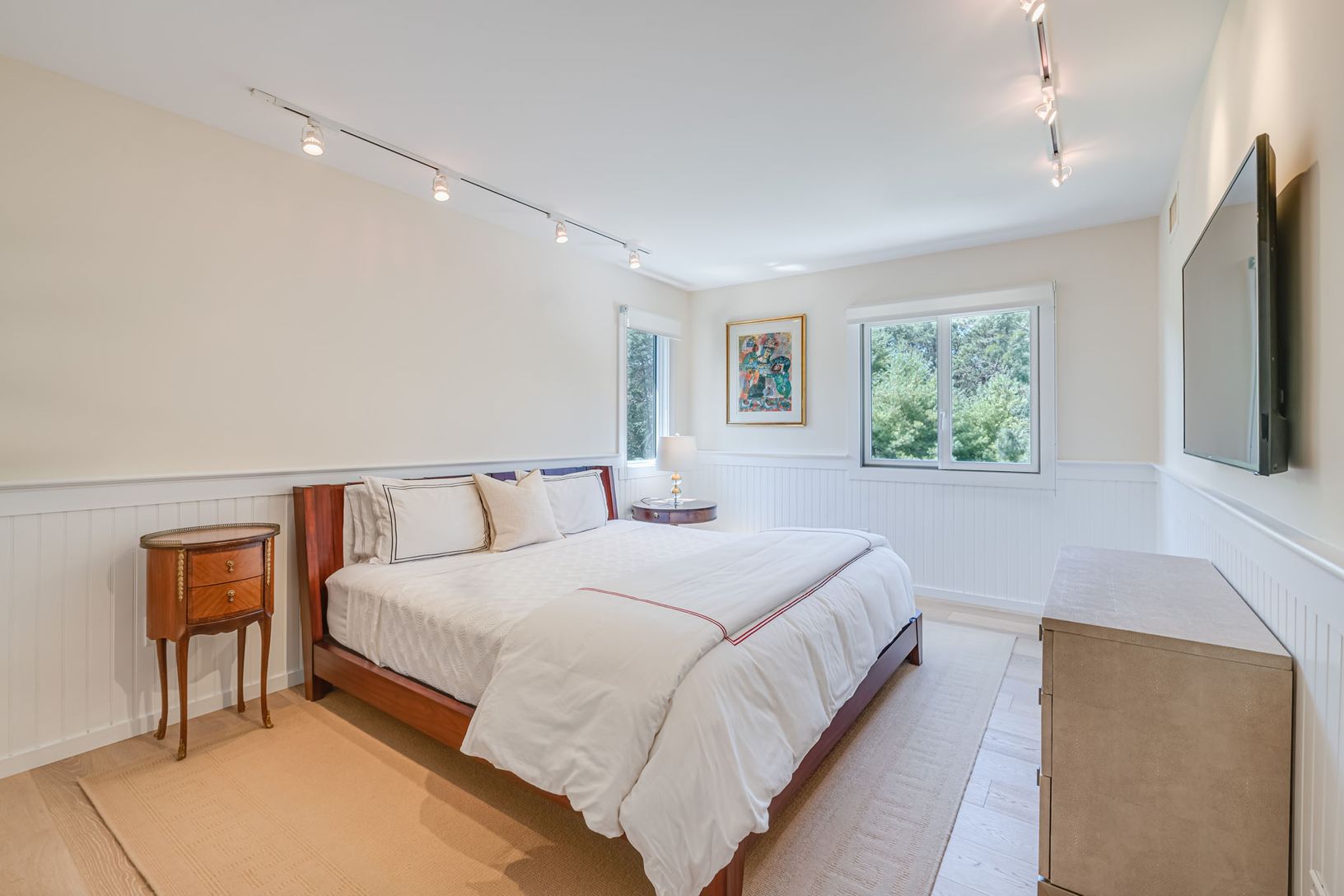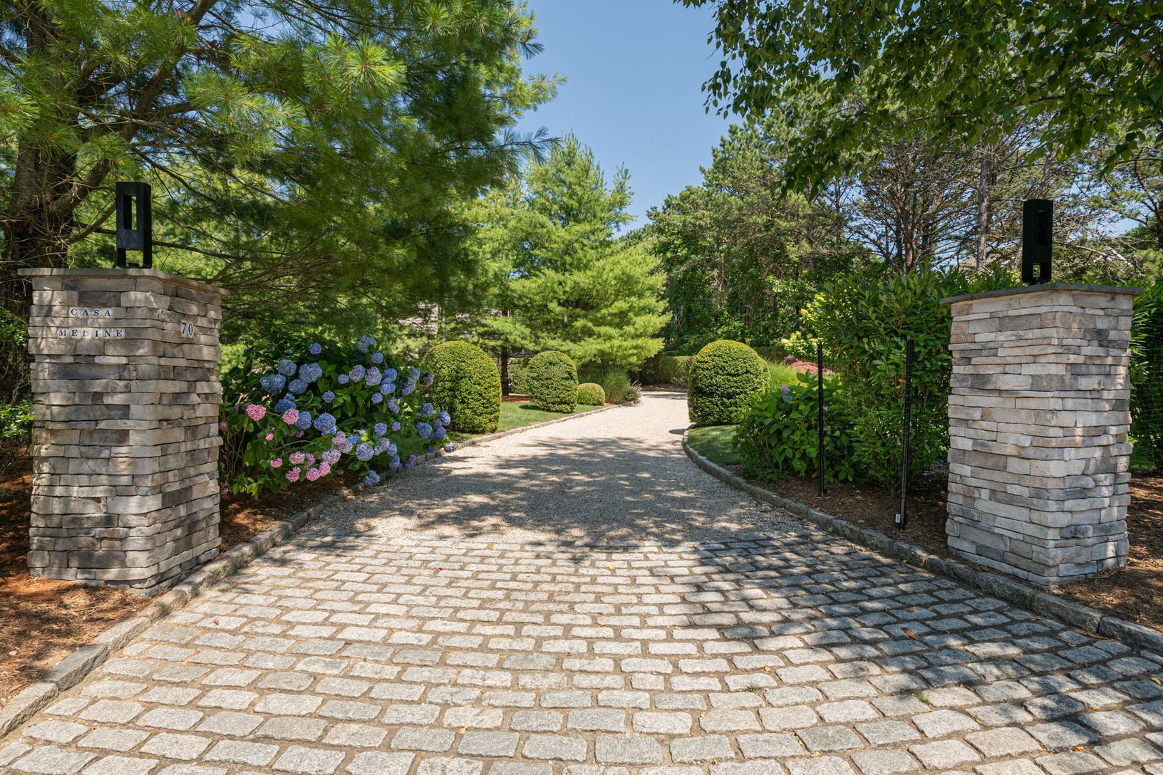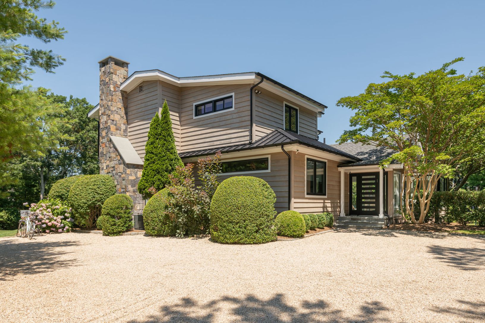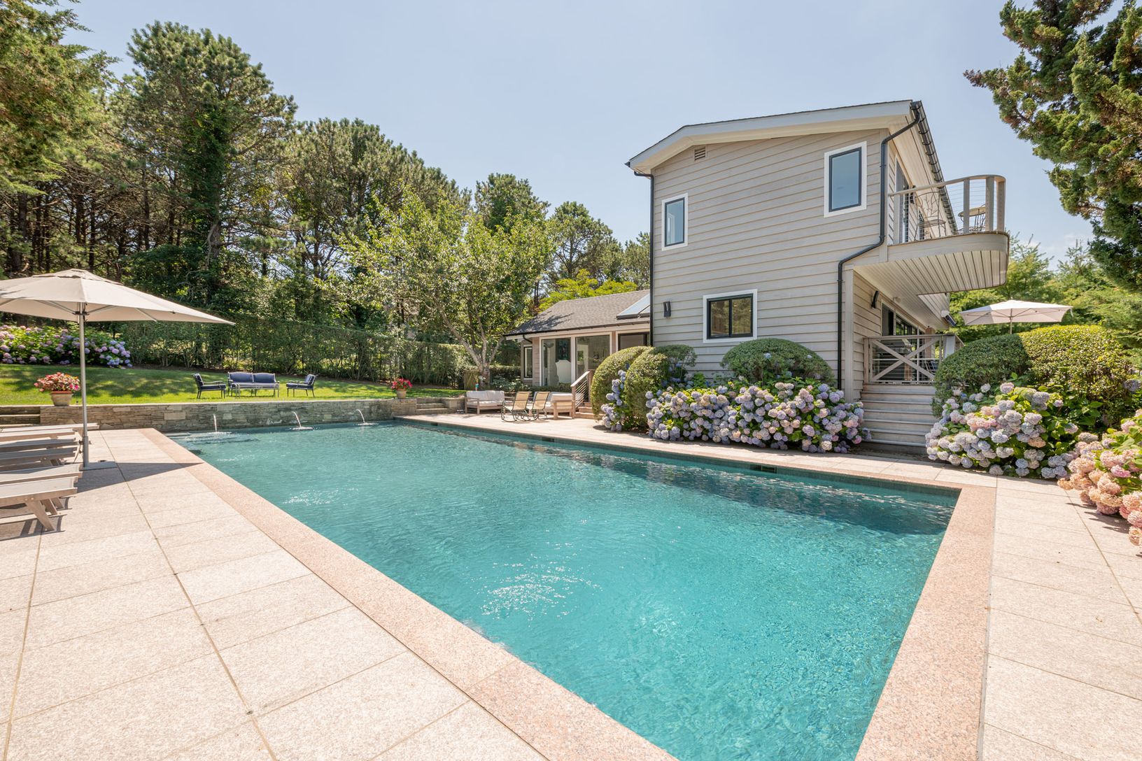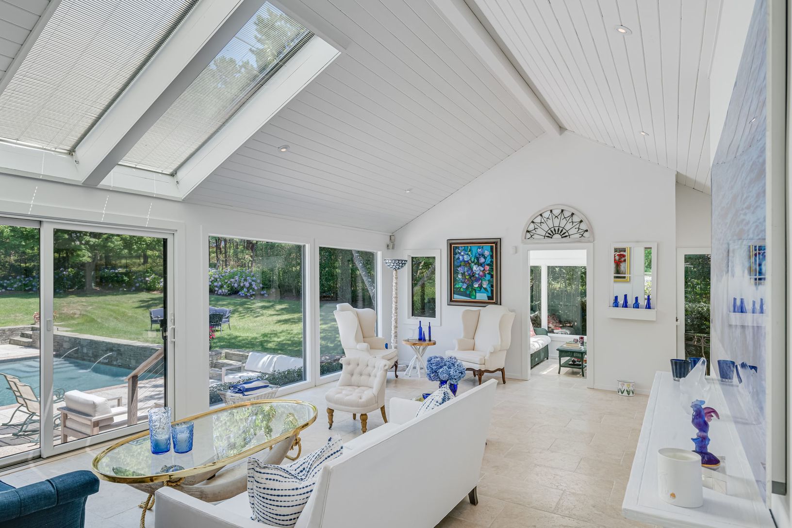 Every design detail has been meticulously considered at this immaculate, sun-filled modern on a gorgeously landscaped super-private shy acre in the Southampton Highlands. The vaulted living room with floor to ceiling doors overlooks the expansive granite patio with multiple seating areas, exquisite plantings and a 48-foot heated gunite pool accented with stacked stone and cascading fountains. The open floor plan also offers a charming sunroom