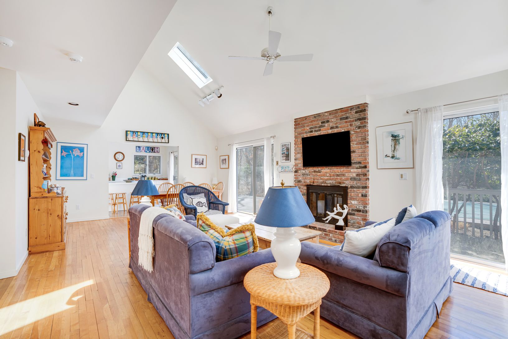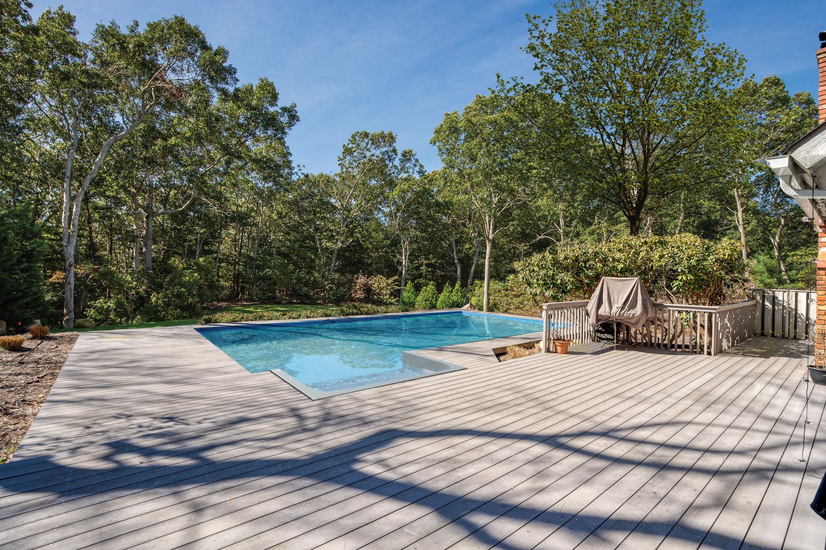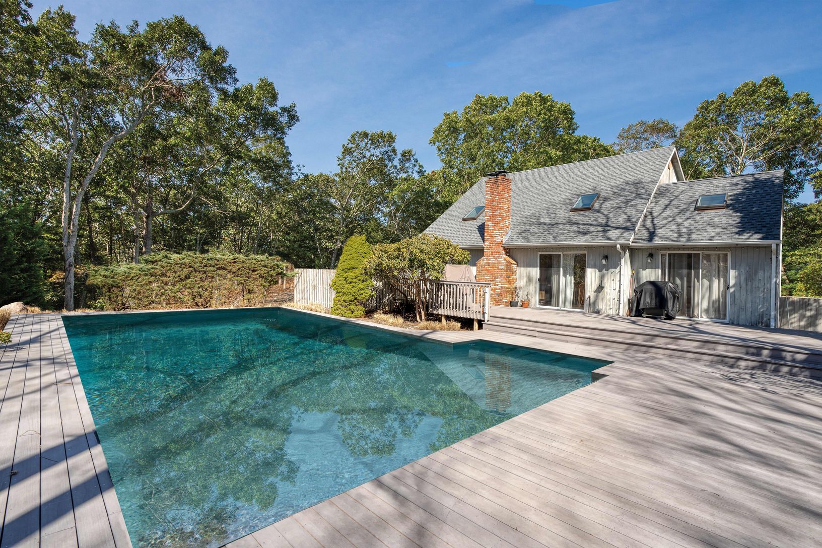 Minutes to Amagansett’s quaint Main Street, world class ocean beaches, and top tier farm stands, this classic 4 bedroom saltbox style beach house with expansive deck and south-facing, heated pool is tucked away on a secluded acre-plus on a lane without through traffic. The home begins with a bright and voluminous living room with fireplace and French doors out to the deck and pool area. The open concept floor plan connects the living room with