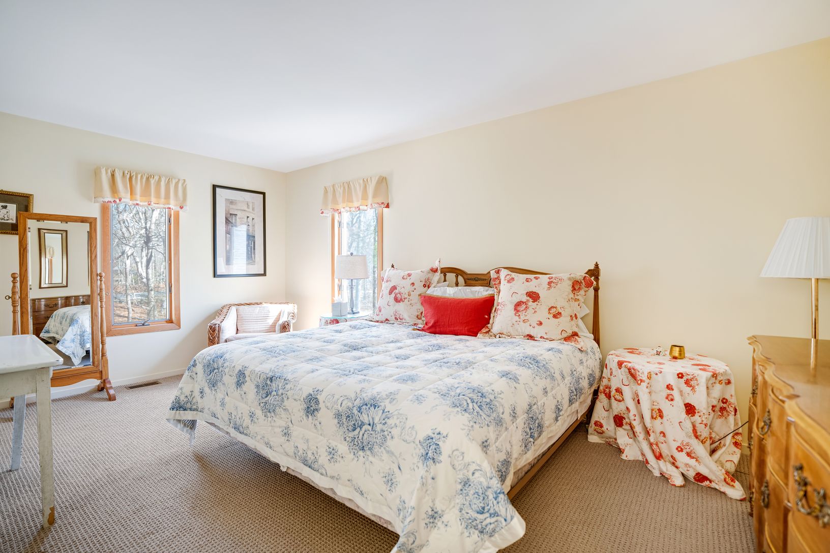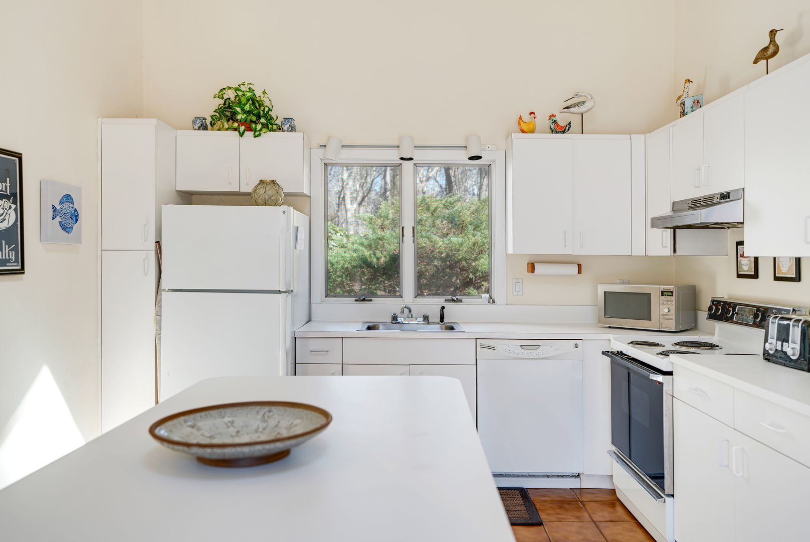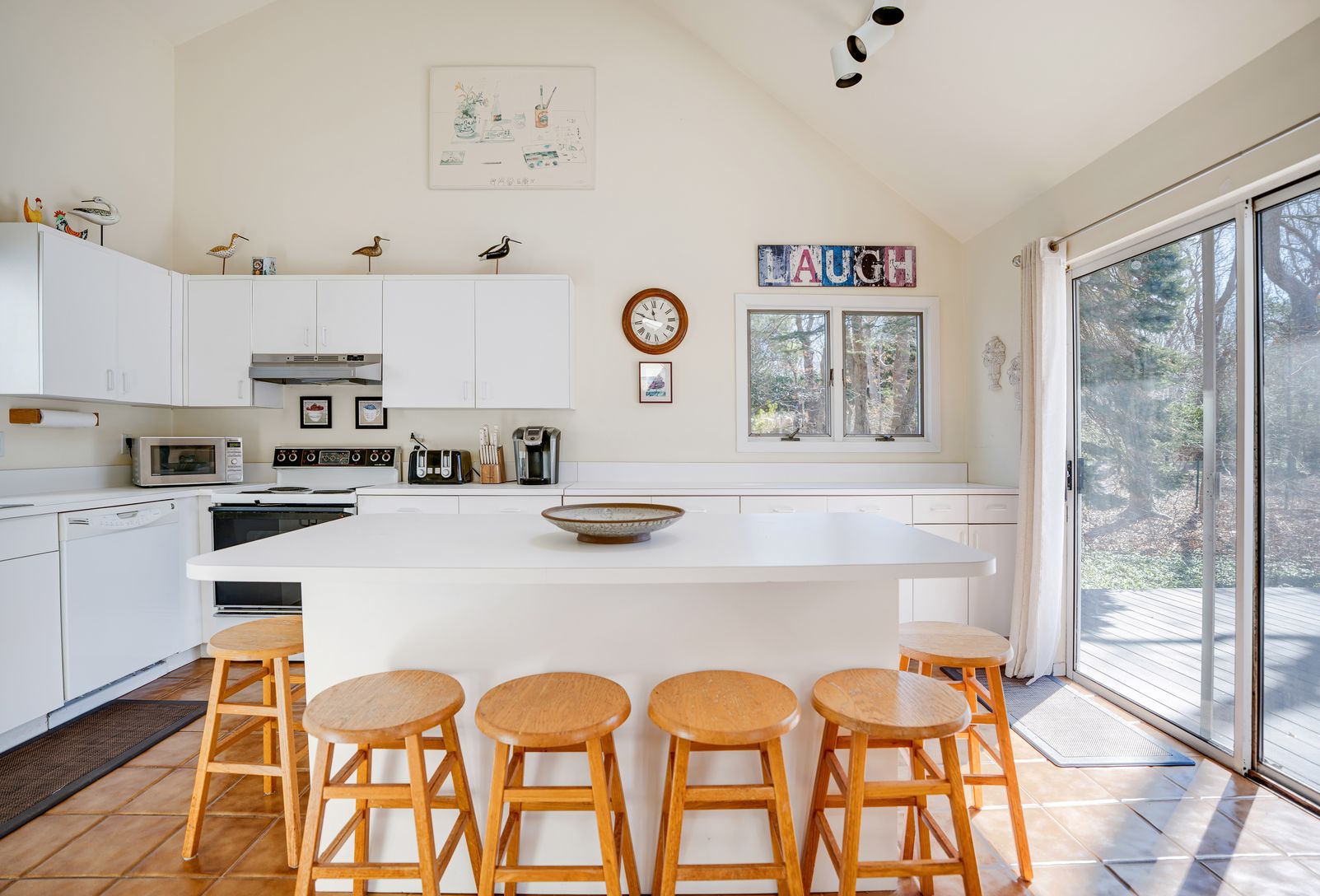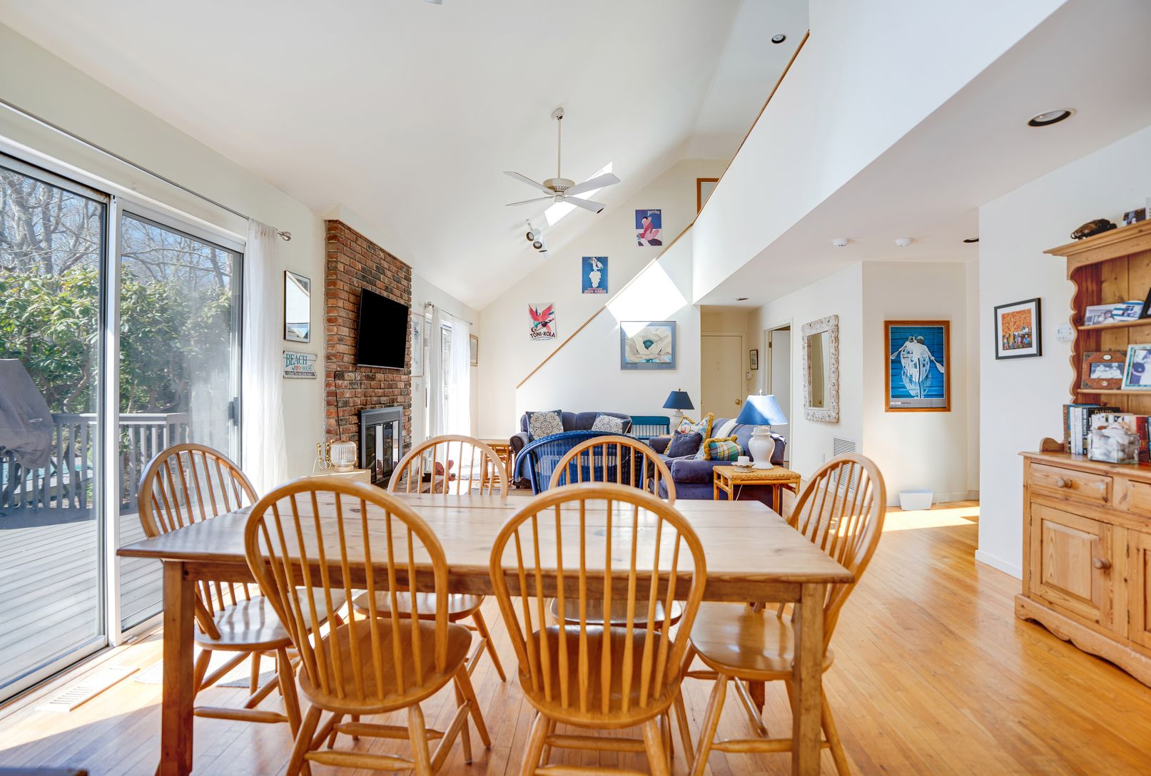 Minutes to Amagansett’s quaint Main Street, world class ocean beaches, and top tier farm stands, this classic 4 bedroom saltbox style beach house with expansive deck and south-facing, heated pool is tucked away on a secluded acre-plus on a lane without through traffic. The home begins with a bright and voluminous living room with fireplace and French doors out to the deck and pool area. The open concept floor plan connects the living room with