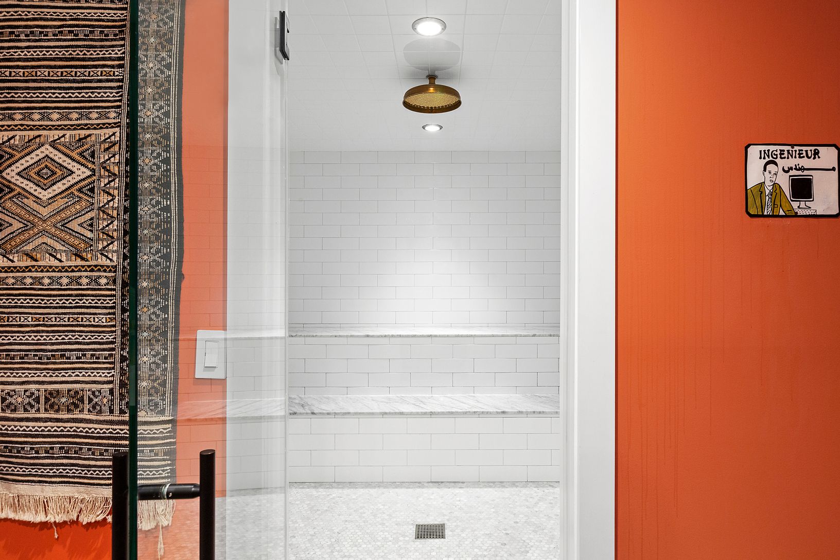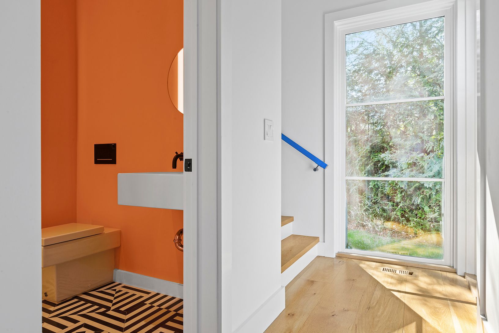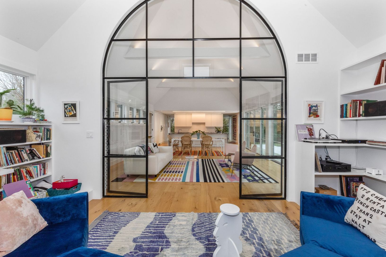 Designer's own modern home is flooded with light and striking architectural details. The first floor has vaulted ceilings and an open kitchen living area with a wall of sliding glass doors to the backyard, visually bringing the swimming pool, patio and colorful gardens inside. The living area flows into a library separated by a floor to ceiling arched custom steel framed glass door, creating an intimate playful space. The first floor also has