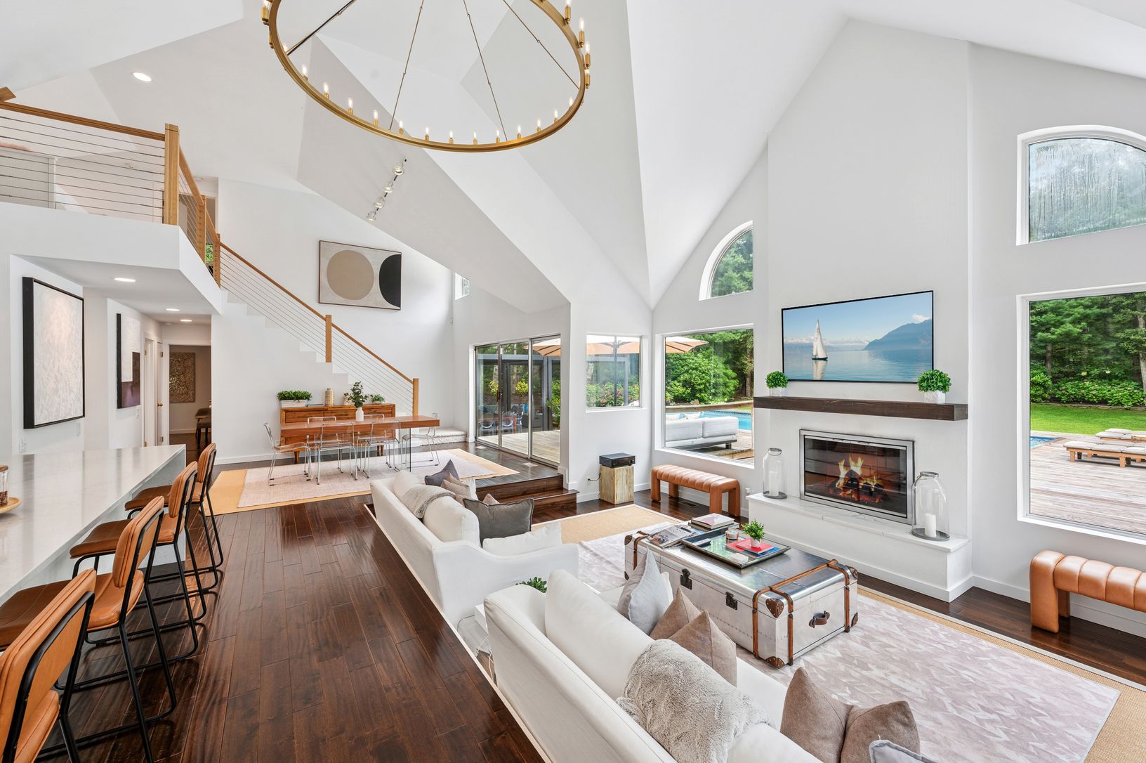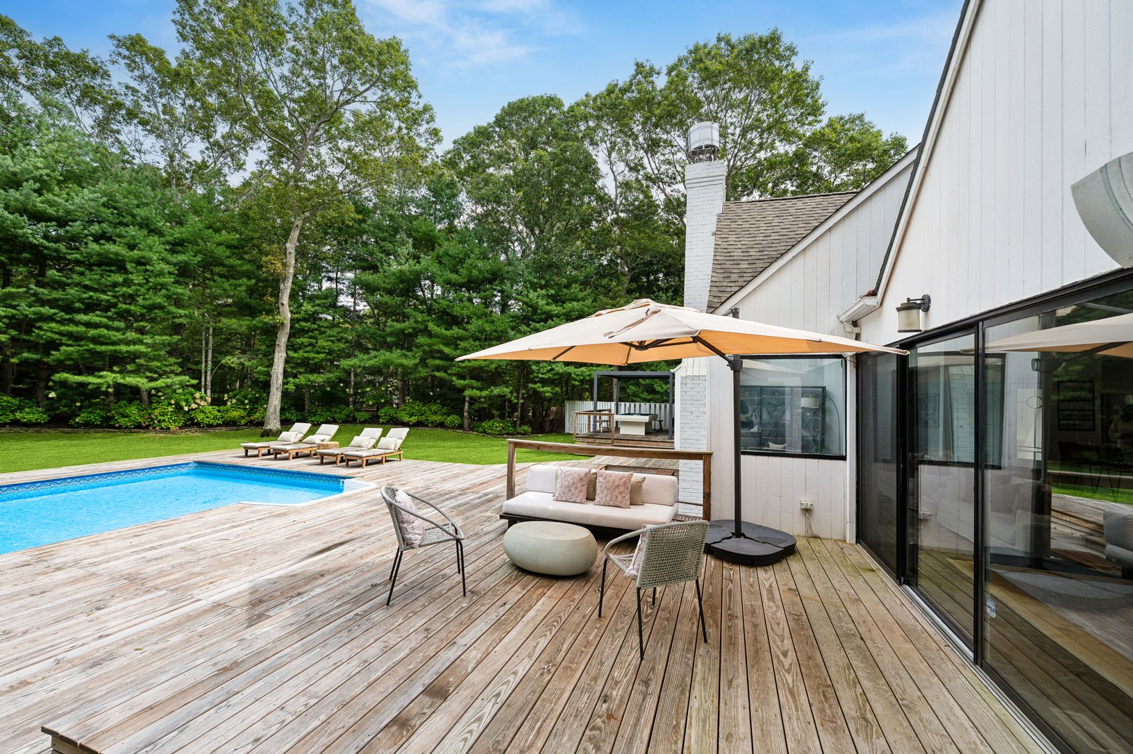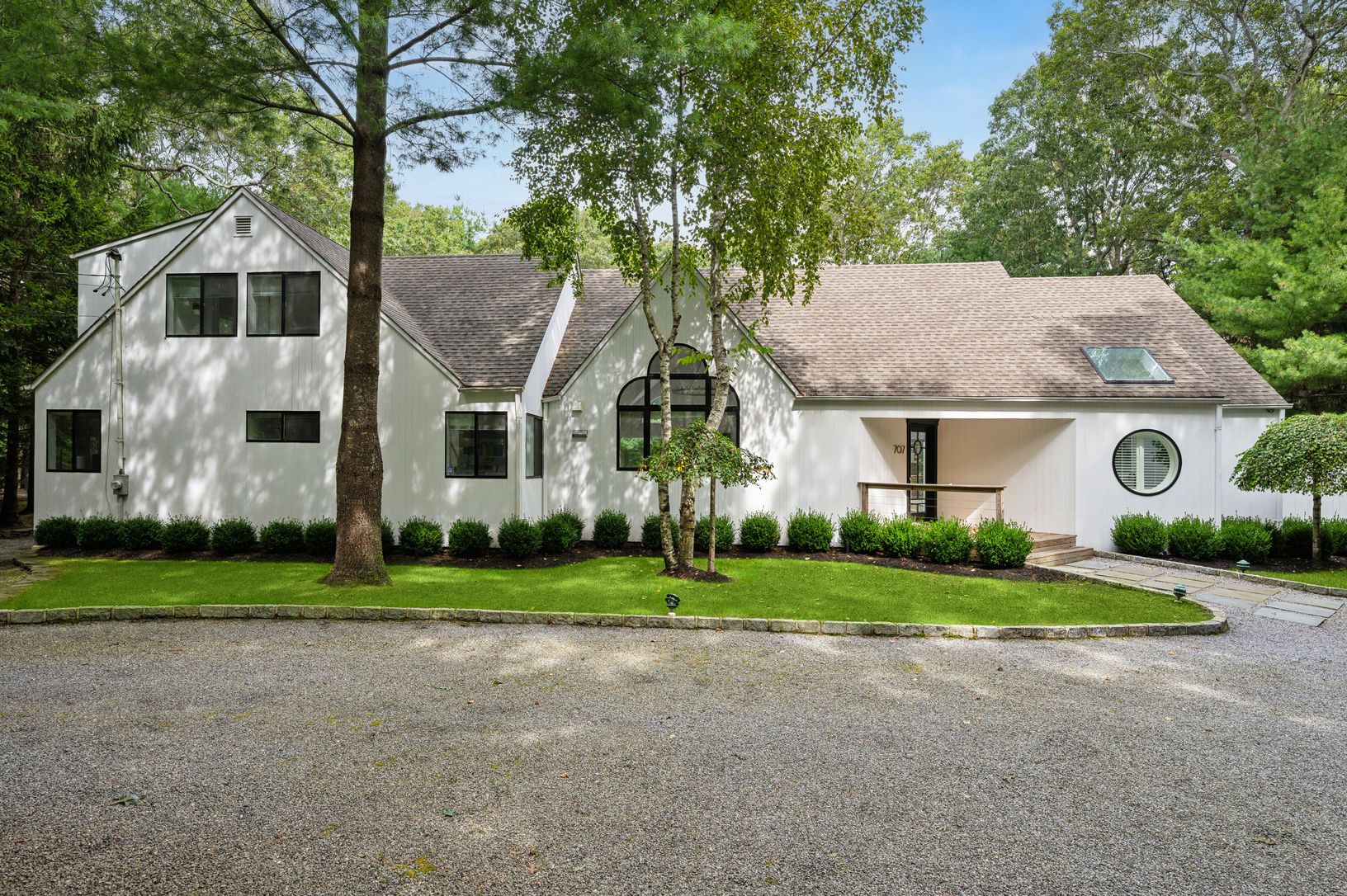 Set behind a circular drive on over 1.5 acres just moments from Three Mile Harbor, this contemporary retreat is designed for relaxed Hamptons living. The airy, open layout connects the living room, great room, and kitchen, with walls of glass and sliders bringing in natural light all day long. The first-floor primary suite is its own private sanctuary, complete with a spacious bath and direct access to a secluded deck. Two additional bedrooms
