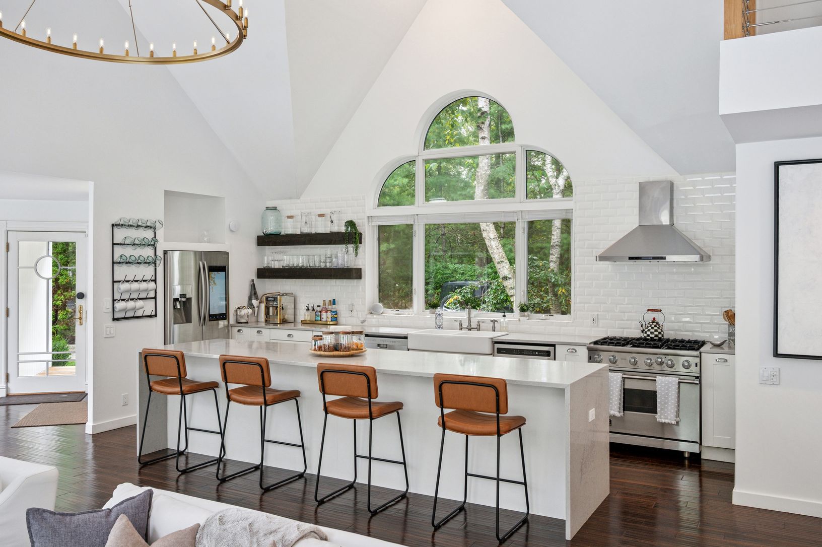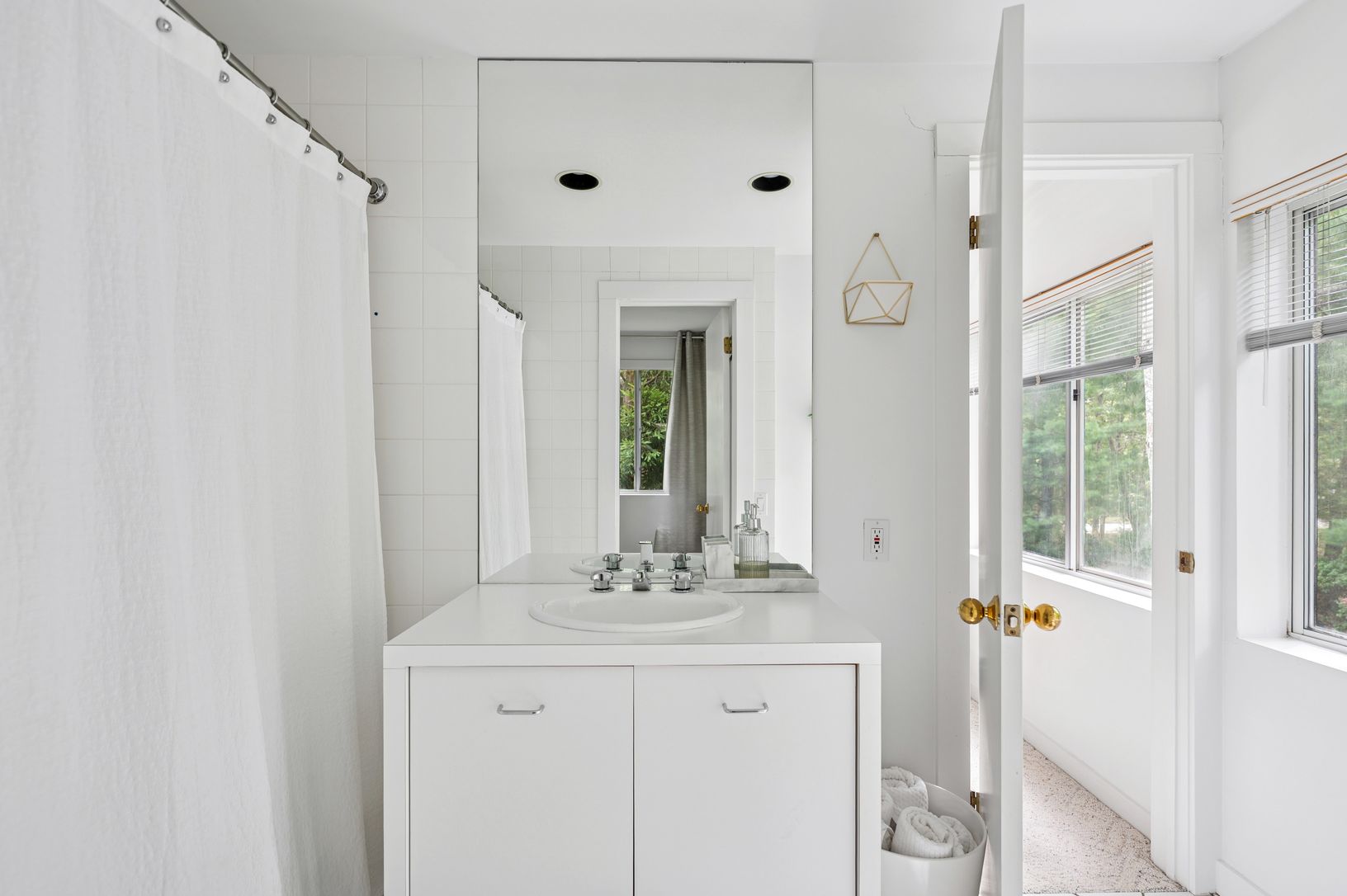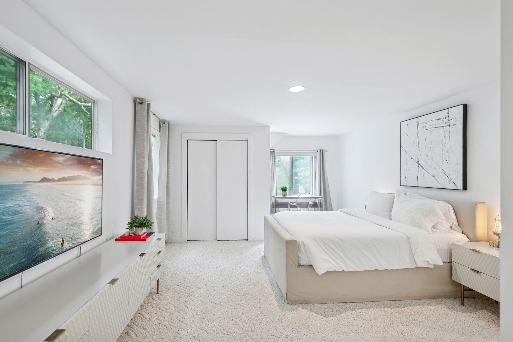 Set behind a circular drive on over 1.5 acres just moments from Three Mile Harbor, this contemporary retreat is designed for relaxed Hamptons living. The airy, open layout connects the living room, great room, and kitchen, with walls of glass and sliders bringing in natural light all day long. The first-floor primary suite is its own private sanctuary, complete with a spacious bath and direct access to a secluded deck. Two additional bedrooms
