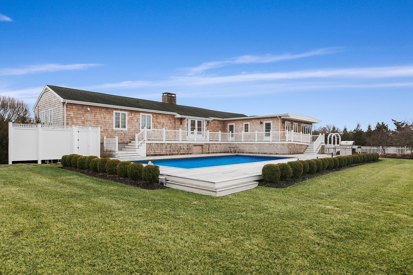 71 Bayfield Lane is located steps from the ocean beaches of Dune Road and a short distance to Westhampton Beach's famed Main Street. This ranch was raised and completely renovated, down to the studs, in 2013. The house features an open layout with a vast great room, eat-in-kitchen, dining area with wood burning fireplace, a master suite wing, an additional 5 bedrooms, two of which are ensuite, and two additional full bathrooms, for a total of