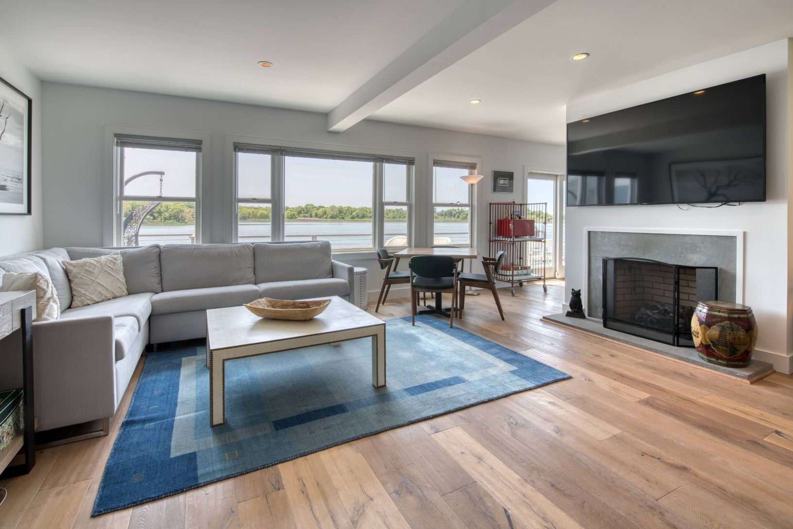 This chic, beachy waterfront home with dock, expanded deck and heated pool offers amazing sunsets and is ideally located on a cul-de sac. First floor features water views from all areas including open concept living room with fireplace and dining area, eat-in kitchen, den, and half-bath with washer/dryer and study. Second floor features Master bedroom suite with with water views, 2nd bedroom with water views, 3rd smaller bedroom and full bath