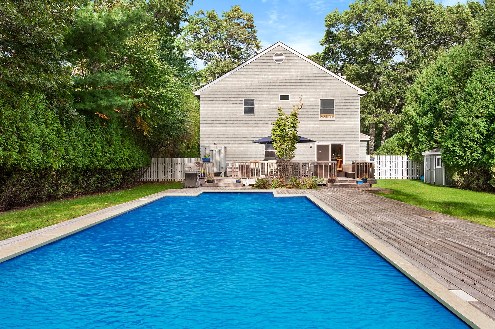 New to Market - 71 Sycamore Drive- A traditional four bedroom and three bath home located minutes from Three Mile Harbor and Gardiner's Bay. Open floor plan on the first floor including living room with wood burning fireplace, kitchen, dining area and en-suite bedroom. The second floor features a master with en-suite bedroom, and two additional bedrooms with shared bath. A private landscaped outdoor area with pool and expansive decking. This
