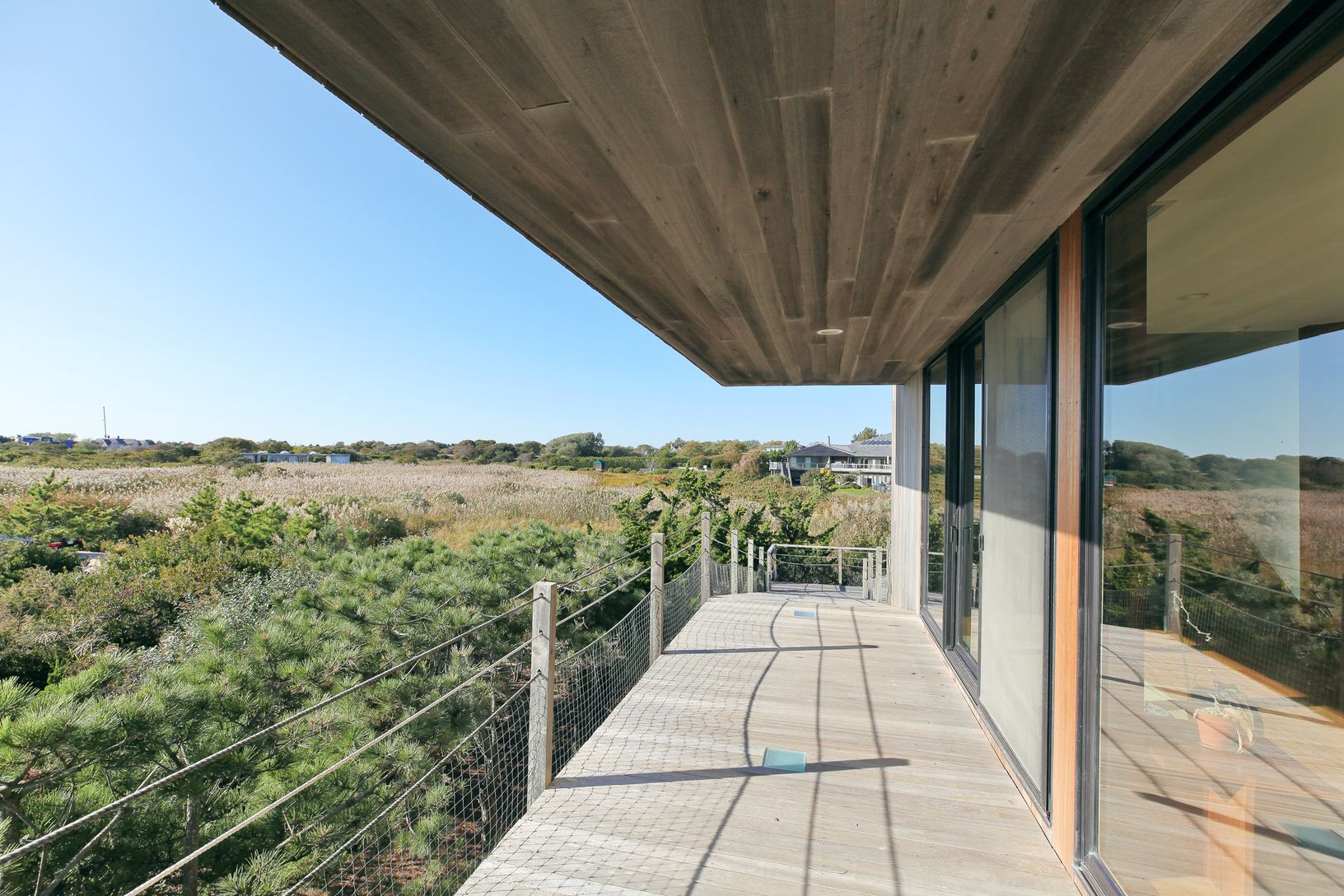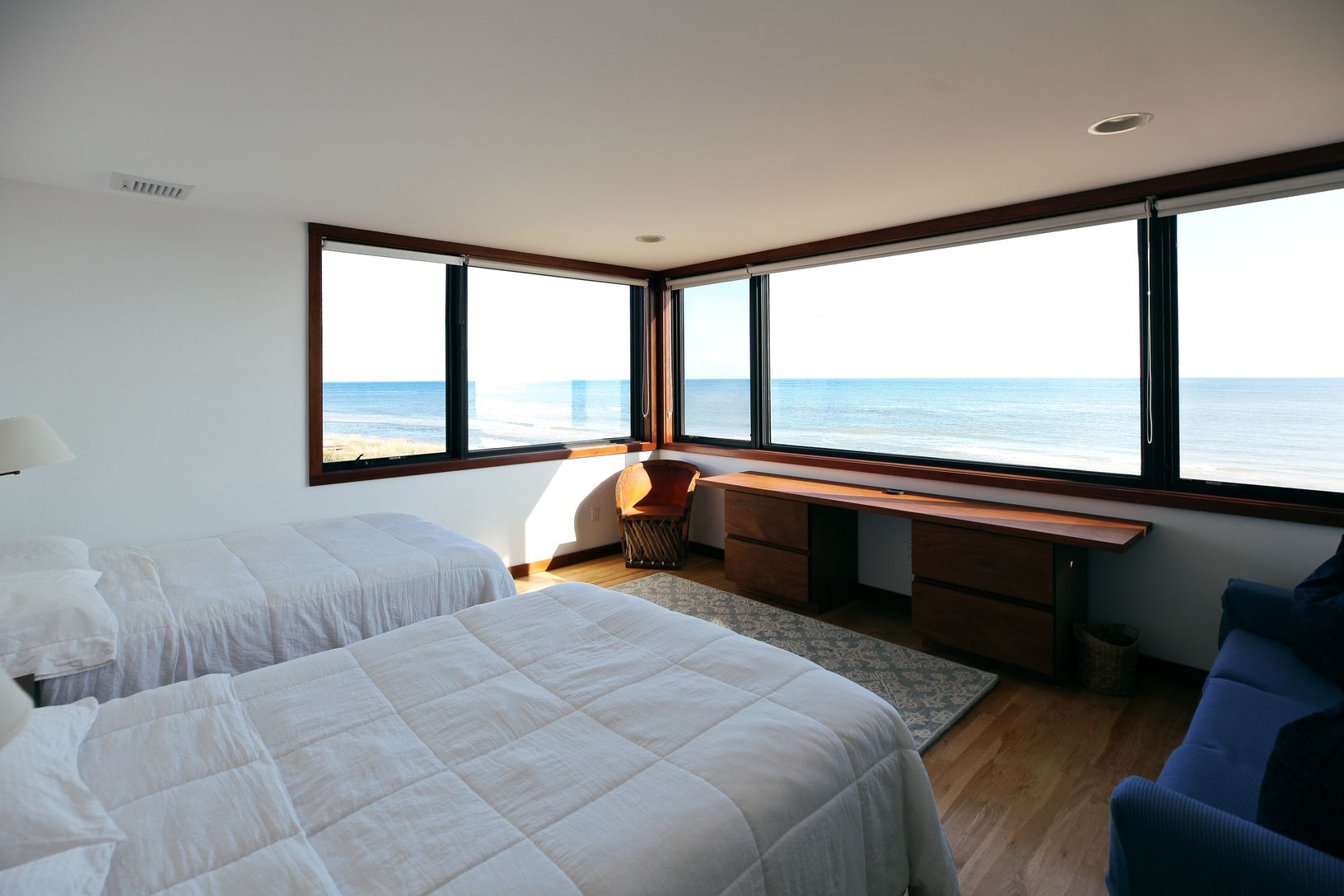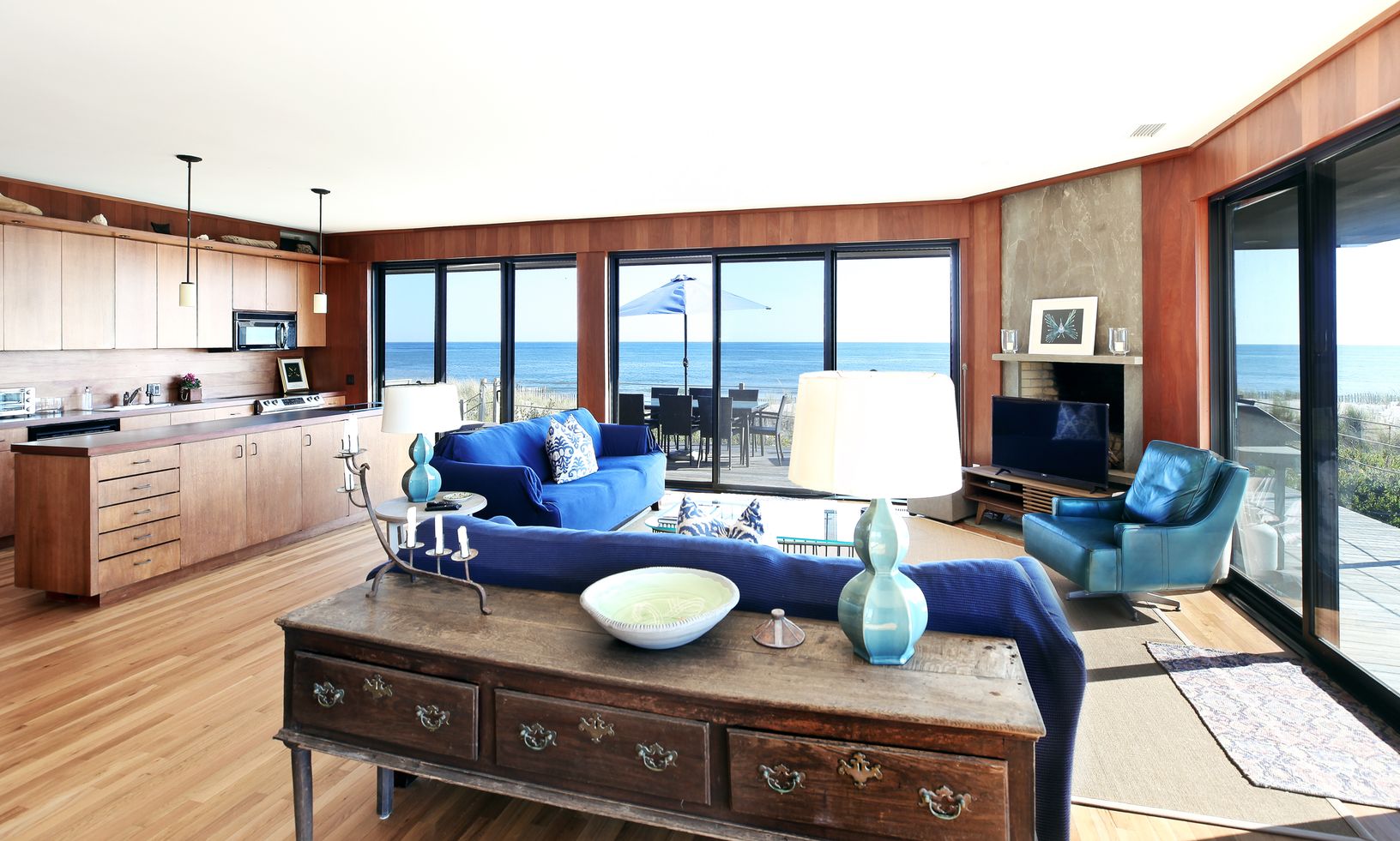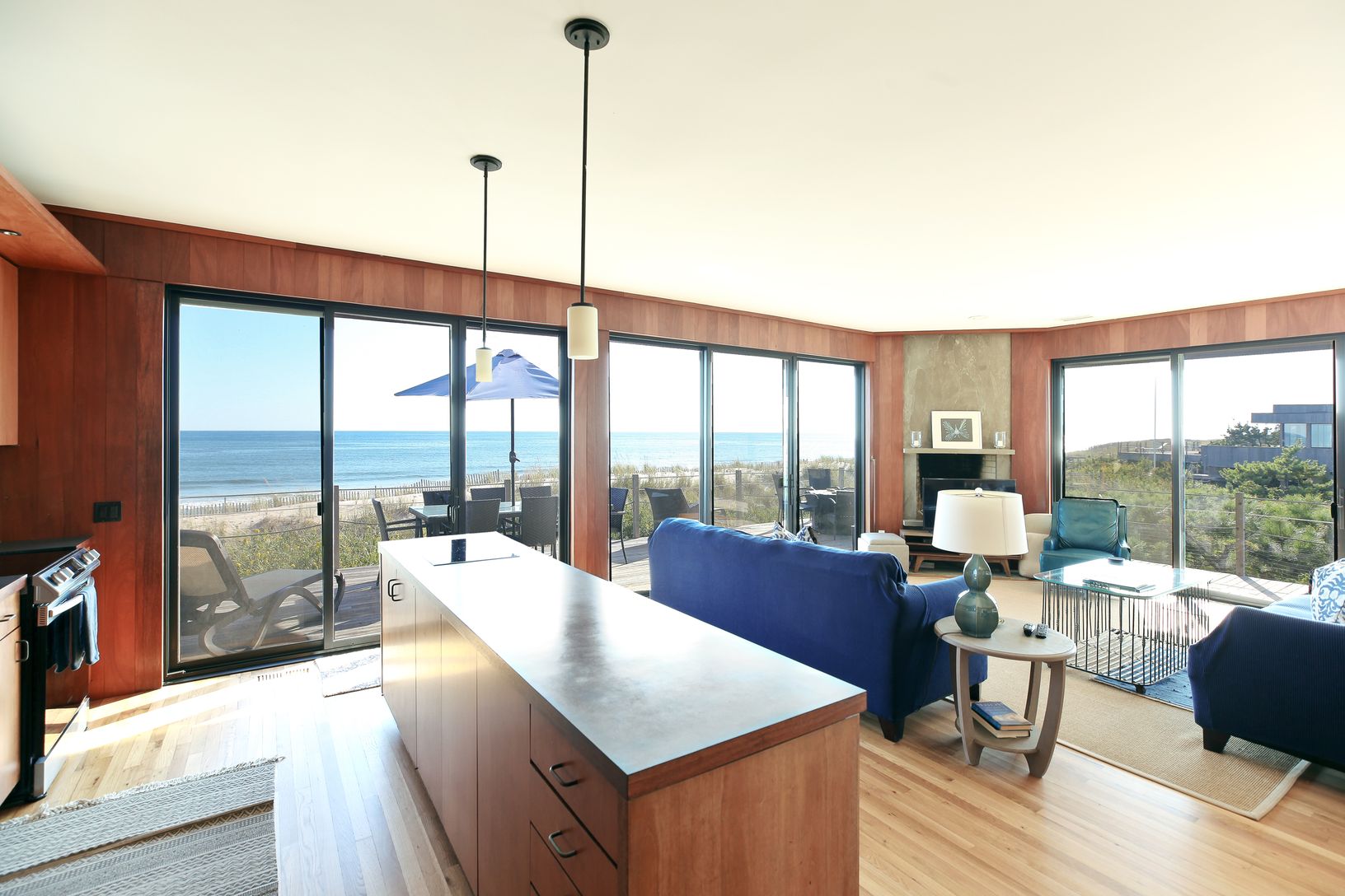 Sagaponack oceanfront retreat available for rent for the first time, with sole access to private tennis court around the corner. Located on a quiet lane with only a few neighboring properties, this contemporary beach house offers easy access to the white sandy stretch below via a private path and stunning ocean vistas from almost every room. The open plan first floor is flooded with light. Sliding doors on two sides open to a wrap around deck