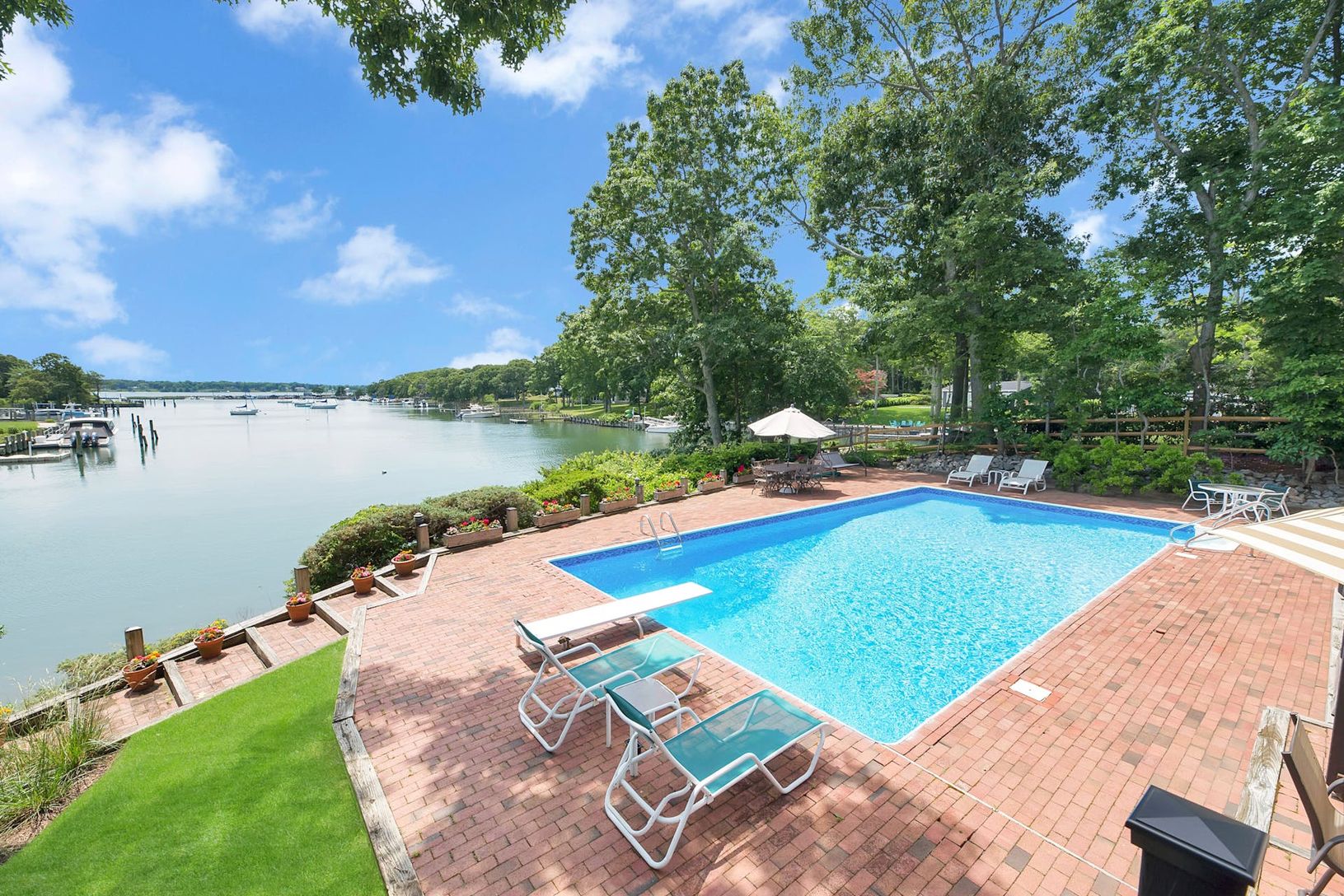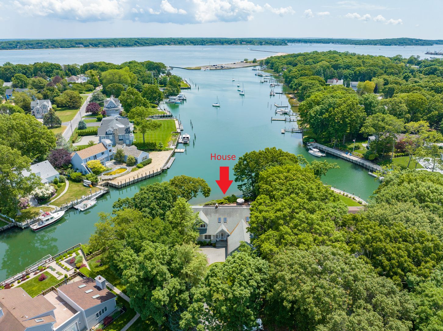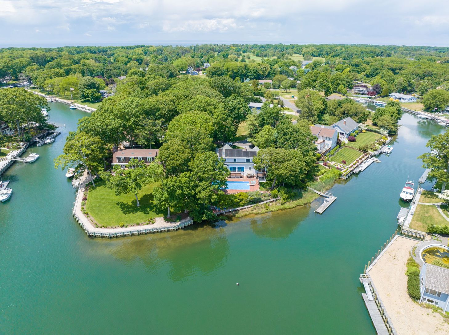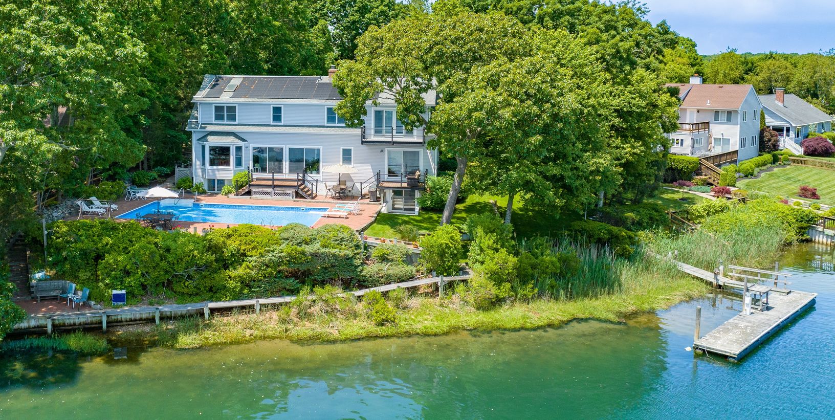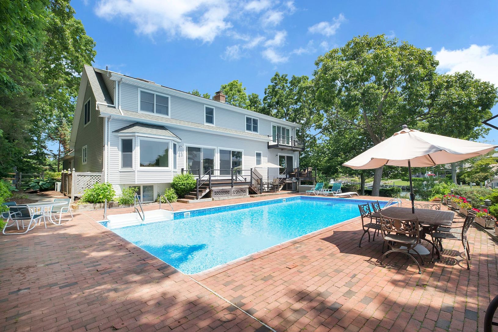 Perfectly Sited Waterfront Home with Heated Pool, Deep Water Dock and Community Bay Beach. Direct Open Views Across Gull Pond to the Bay Beyond. Water Side Seating Area and Catwalk to Access the Natural Shore Line for Fishing or Wading in the Water. 169 Feet of Water Frontage. Room For All with 5+ Bedrooms and 4 Full Baths. Livingroom with Fireplace. Primary Suite with Balcony Overlooking Pool, Dock, Gull Pond and the Bay. Fully Finished and L