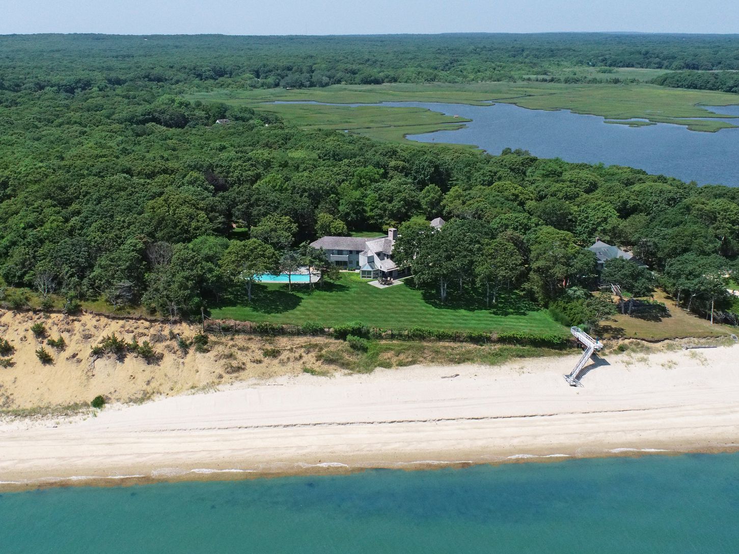 Introducing Louse Point, a spectacular waterfront compound adjacent to preserved land. The offering consists of 4 single and separate lots totaling 4.35+/- acres with 250+/- feet of sandy beach shoreline, rolling lawn, mature trees, and sweeping views across Napeague and Gardiners Bay. Perched high on the bluff, the main house was designed by Bill Chaleff of Chaleff & Rogers Architects and boasts custom craftsmanship, walls of windows, sto