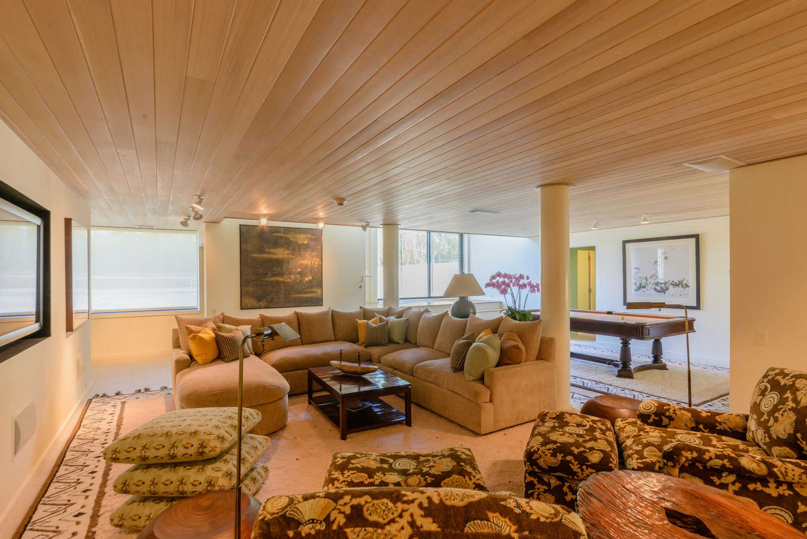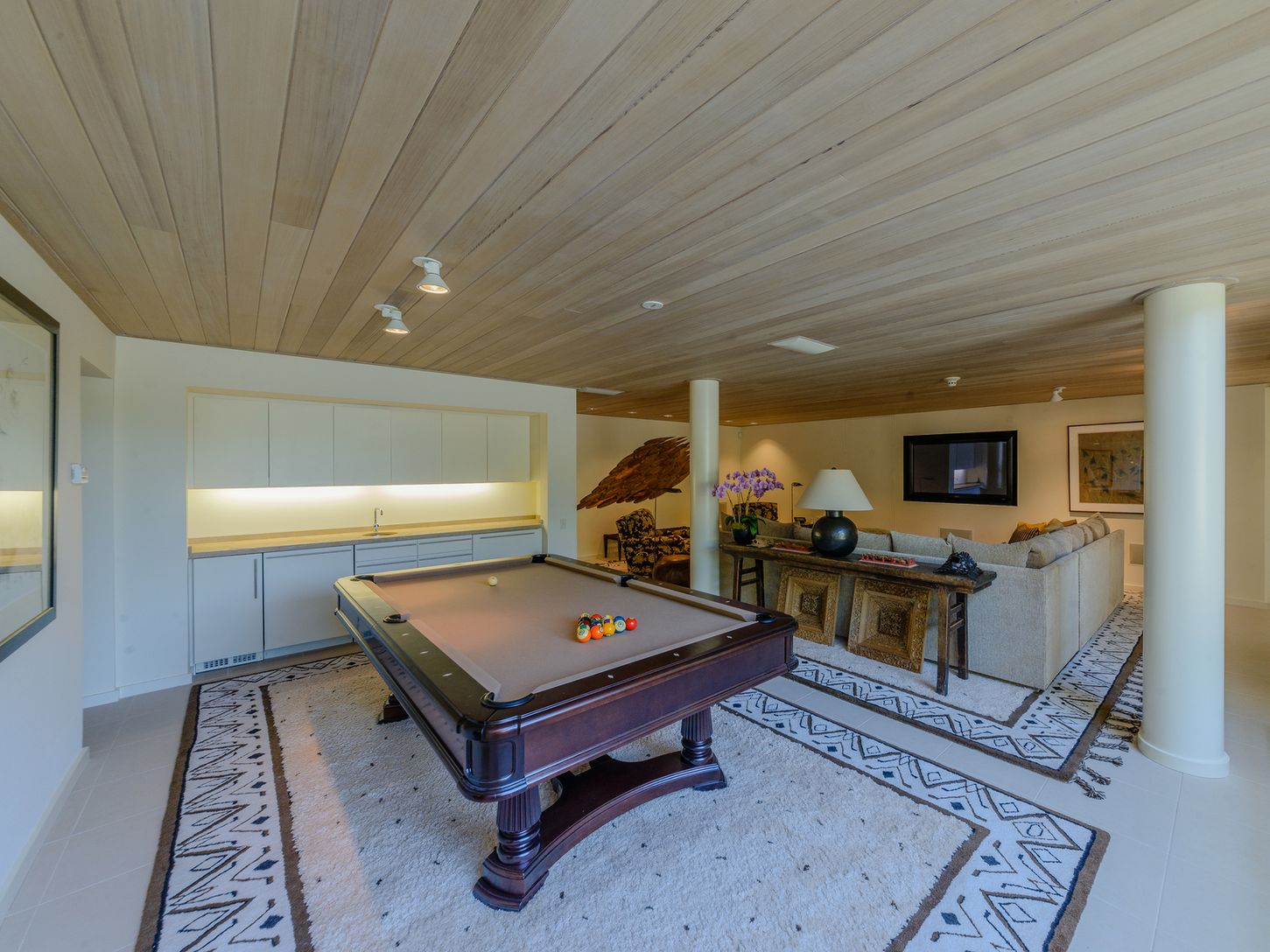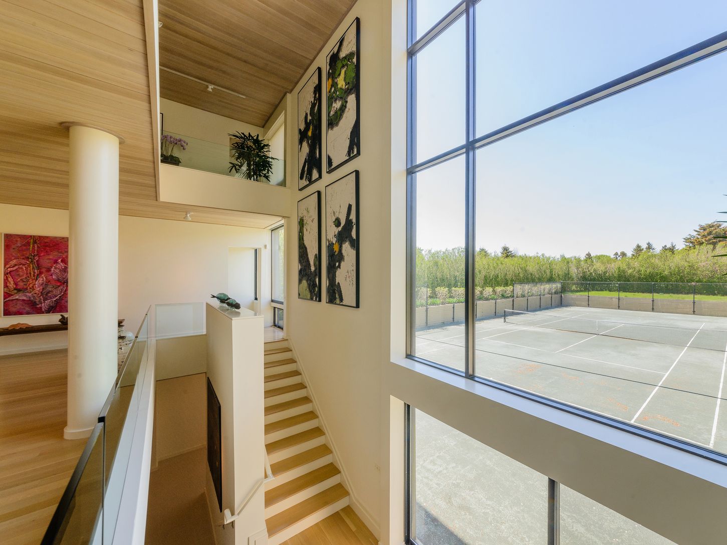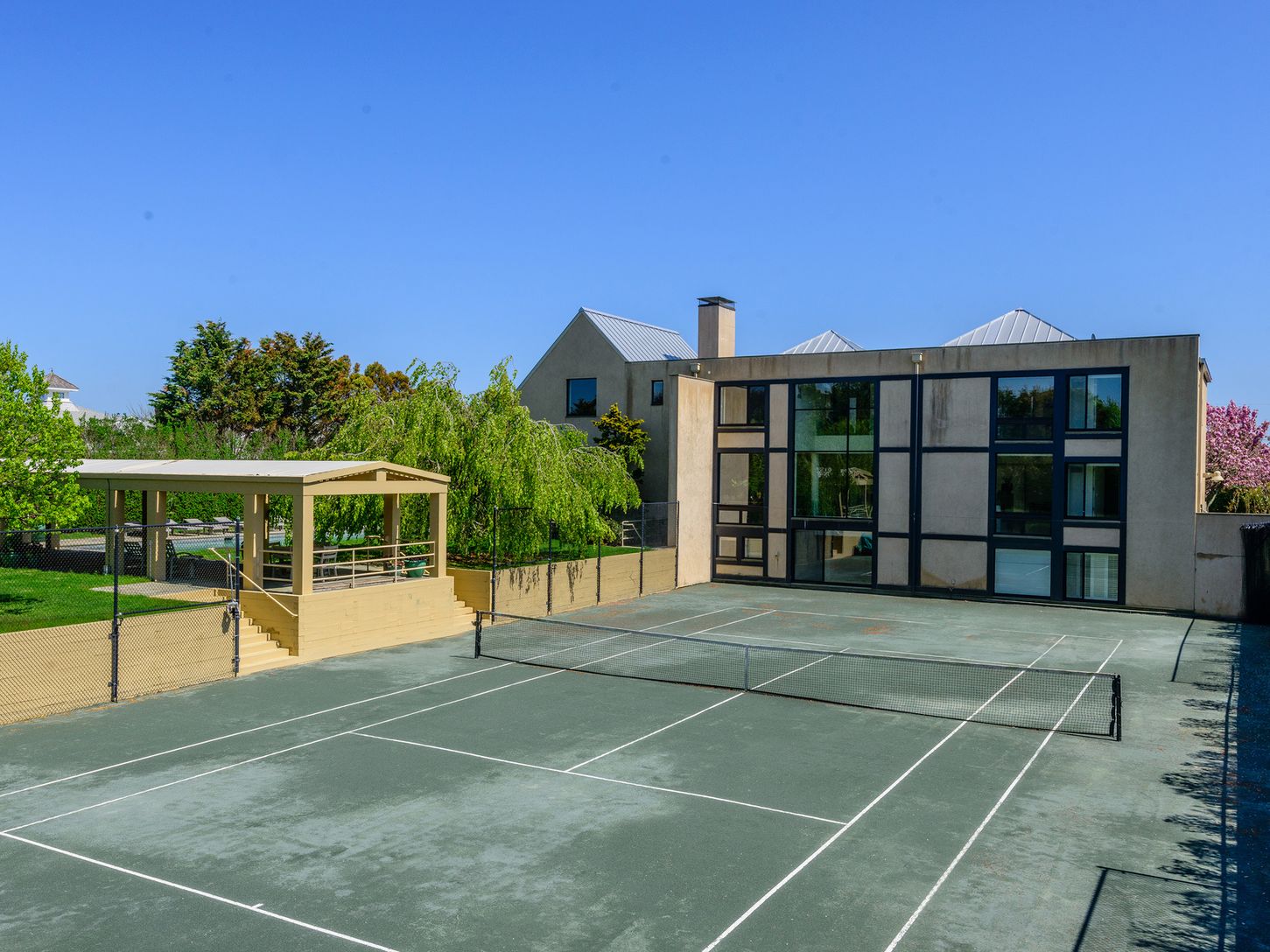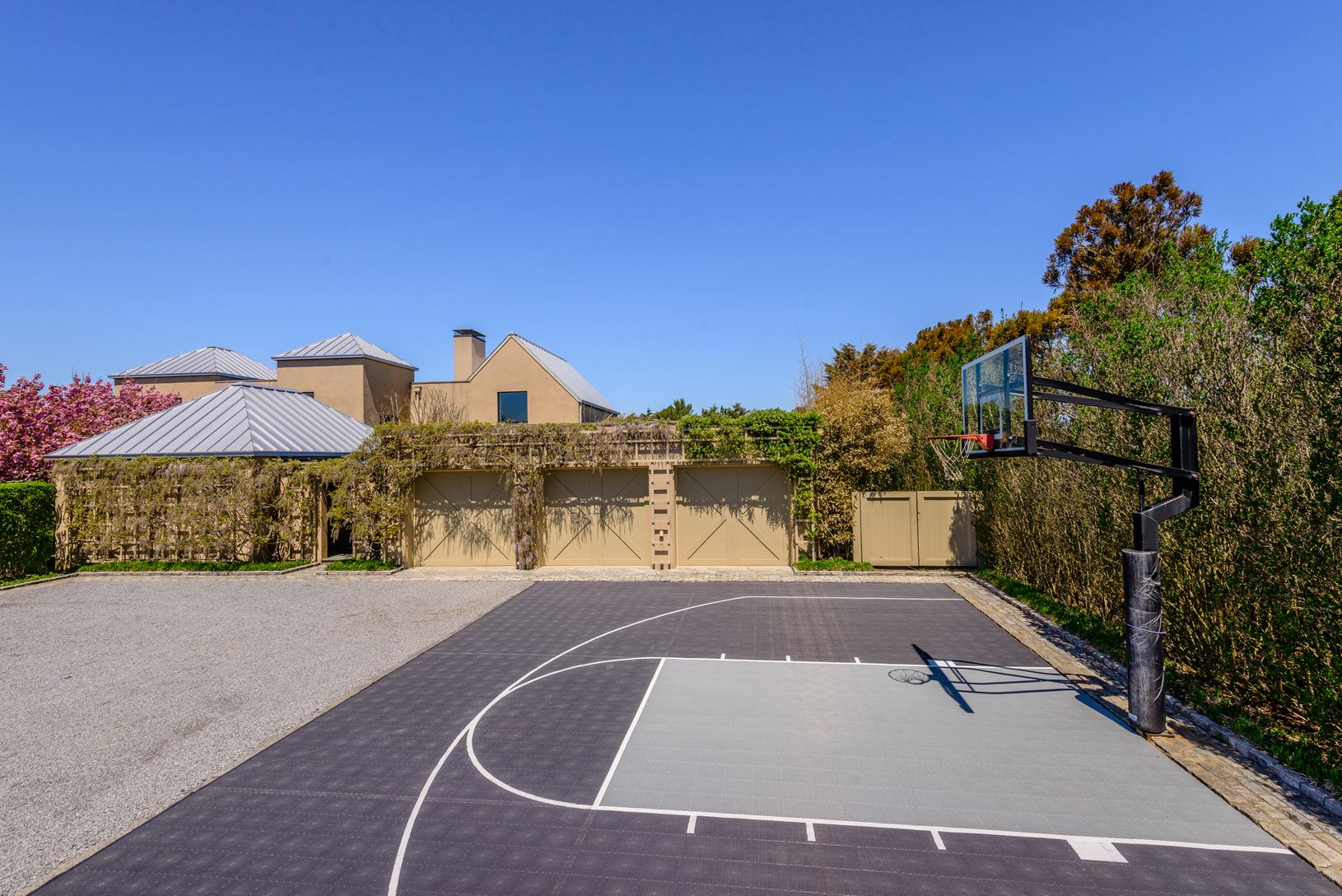 Exquisite flowering trees and lush lawns surround this chic modern home in a premier location. With half-court basketball court, fitness facility with full bath, sunken Har-Tru tennis court, heated gunite pool and lush lawns, this gated and private home offers every amenity just steps from the beach. Sunlight spills from walls of windows and glass doors throughout. Intelligent design coupled with the finest materials creates a gracious home wi