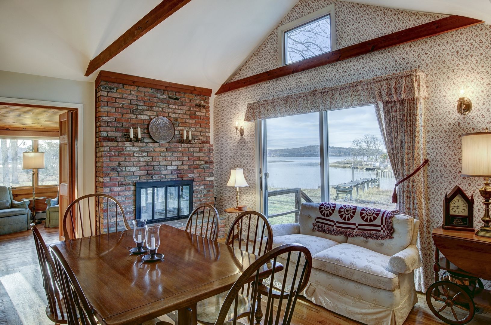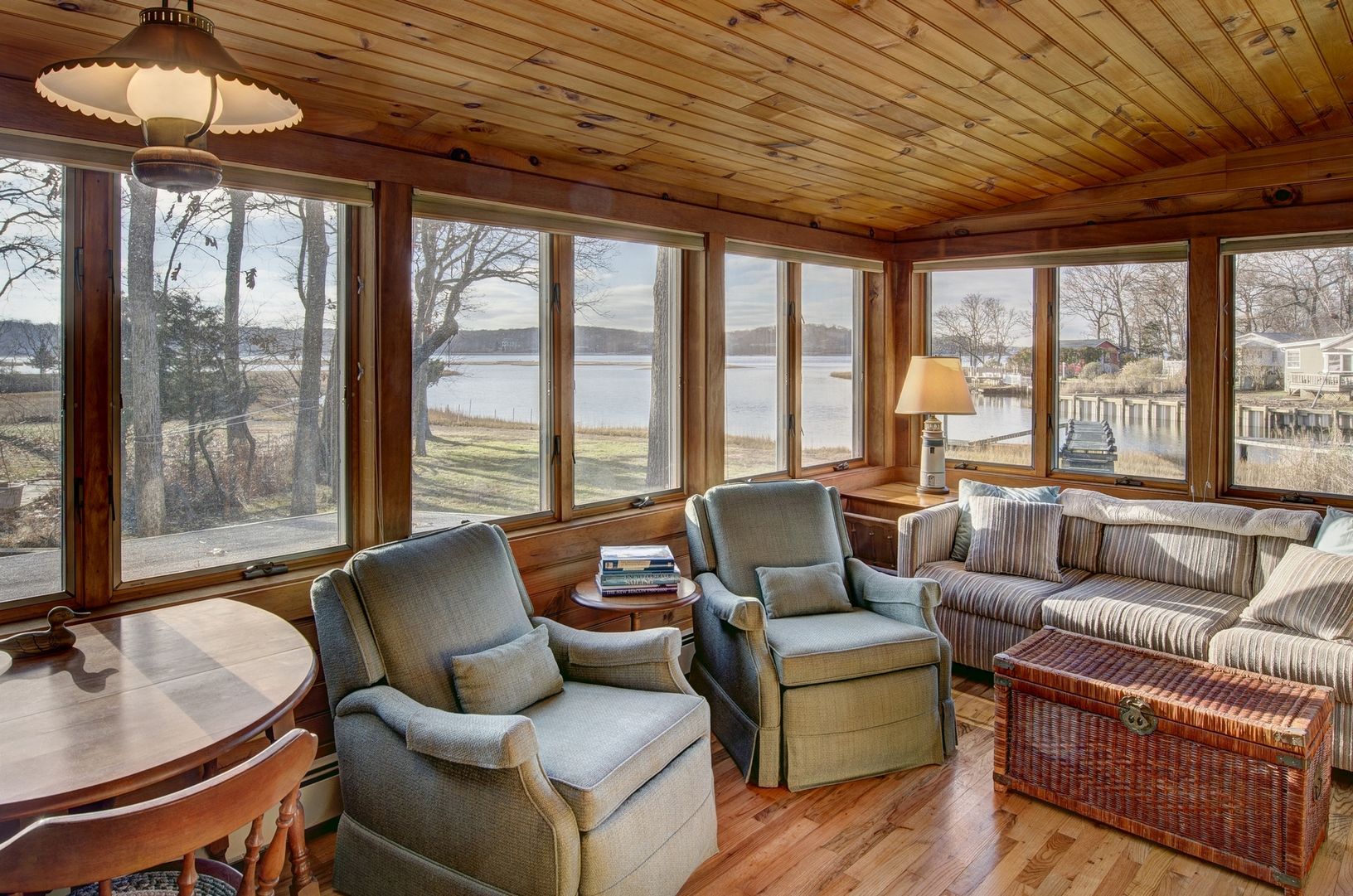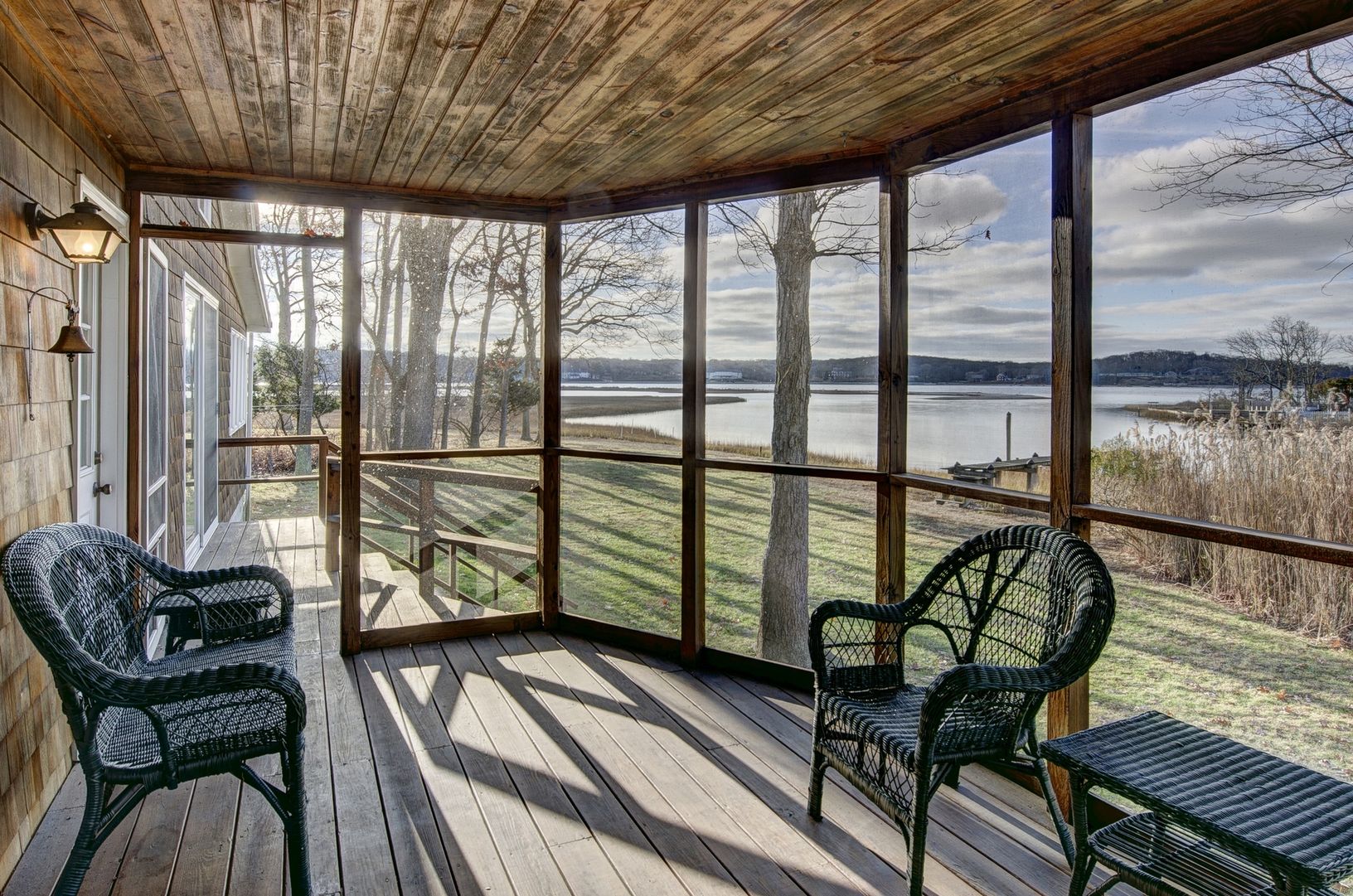 A quintessential beach cottage on Conkling Point with endless, tranquil water views. The living room w/double fireplace, dining room w/sliders, master bedroom w/screened porch all have magnificent views over wetlands & beyond. Dock for easy Bay access & deeded sandy beach.