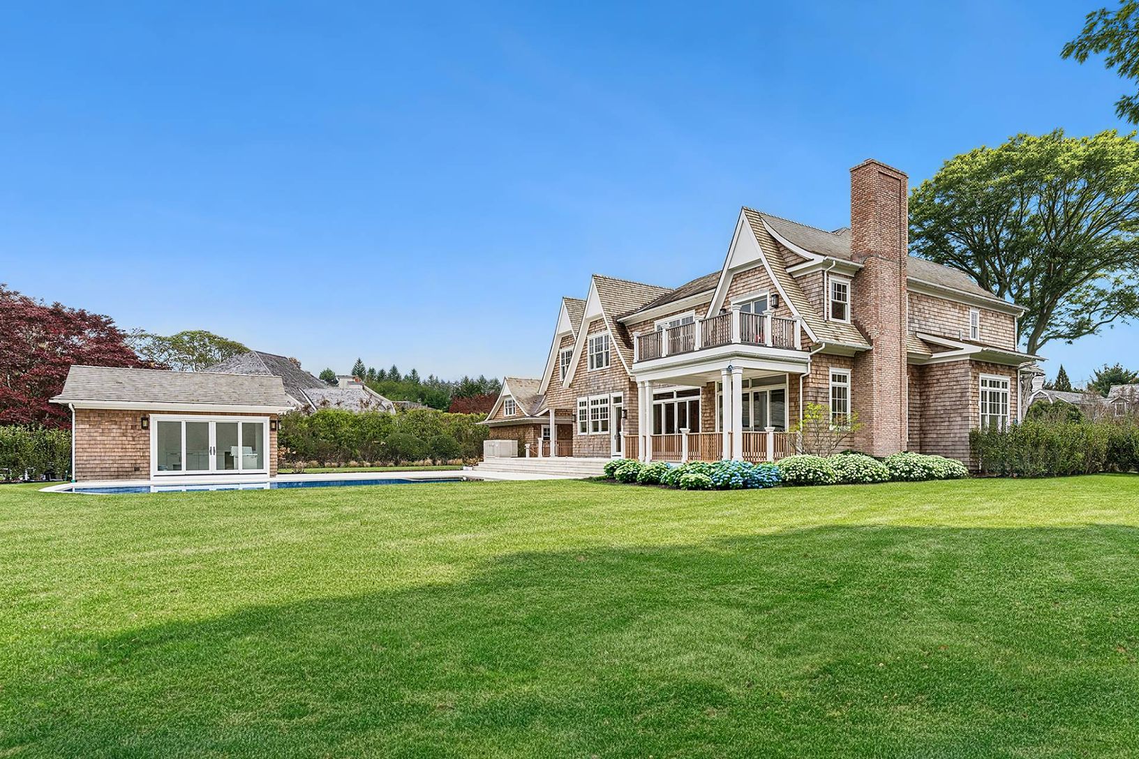 Discover unparalleled new construction luxury located South of the Highway in East Hampton Village at 73 Jericho Road, a prestigious haven for elegance and comfort. Built by Konner Development and sited on a shy acre, this property offers 7,442 +/- SF (plus finished lower level), 7 generously sized bedrooms, 8 full and 2 half baths, 2 fireplaces, a detached 2-car garage, pool house, and heated gunite pool. Inside, you're greeted by an expansiv