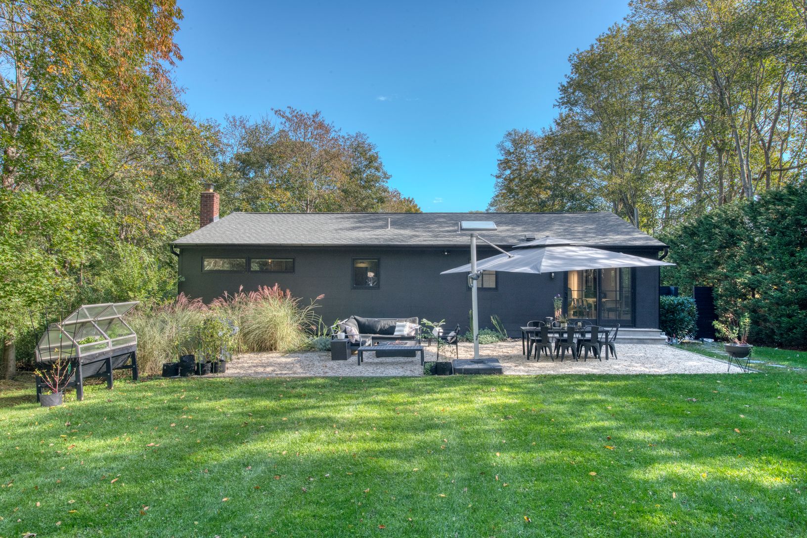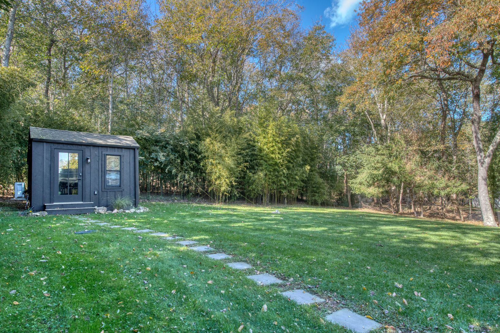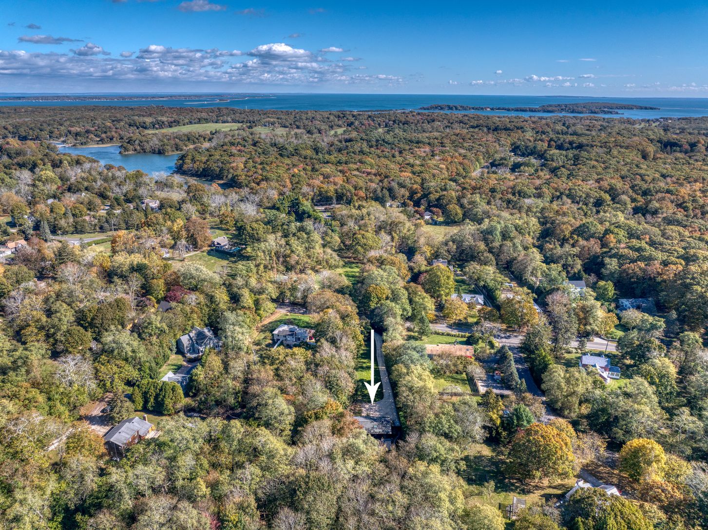 A thoughtfully designed retreat offering peace, privacy, and understated luxury. Tucked away on a private drive in the island's center, you're close enough to bike to all of the island’s beaches or restaurants. The approach sets the tone: a winding drive reveals the house gradually. The home emerges across an expansive lawn, its clean black lines and Anderson windows throughout creating a striking silhouette against the natural canopy. That ha