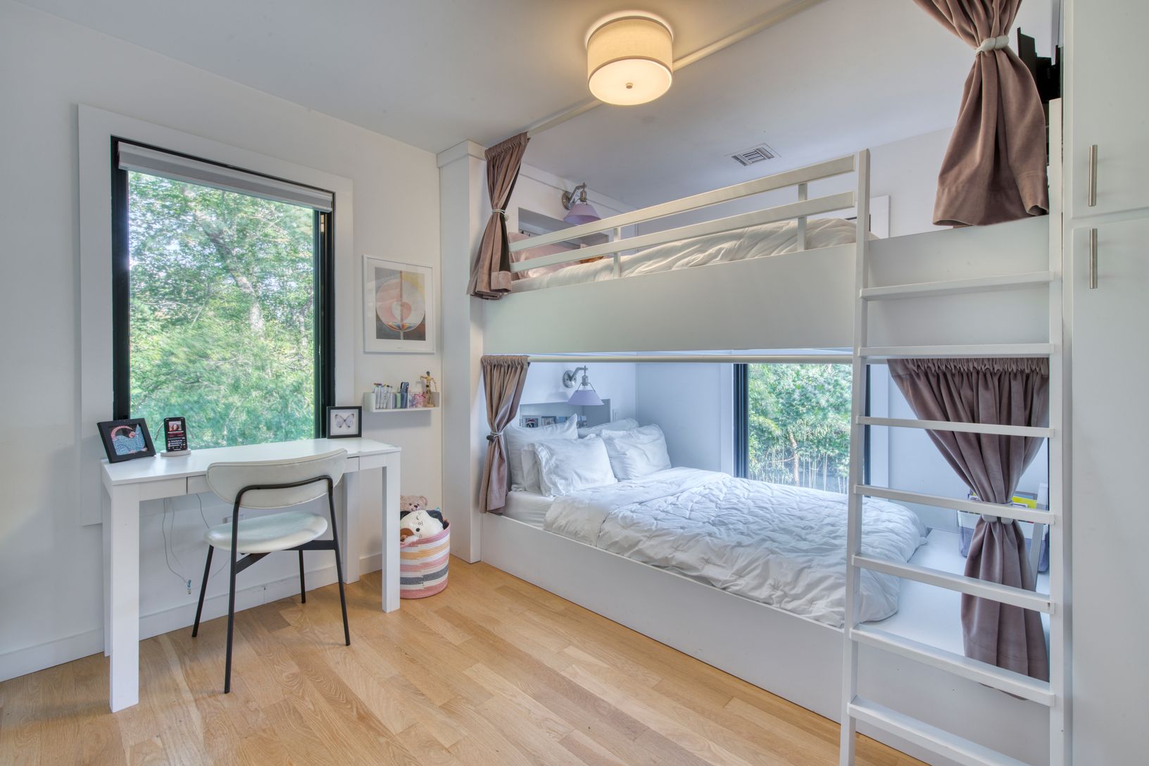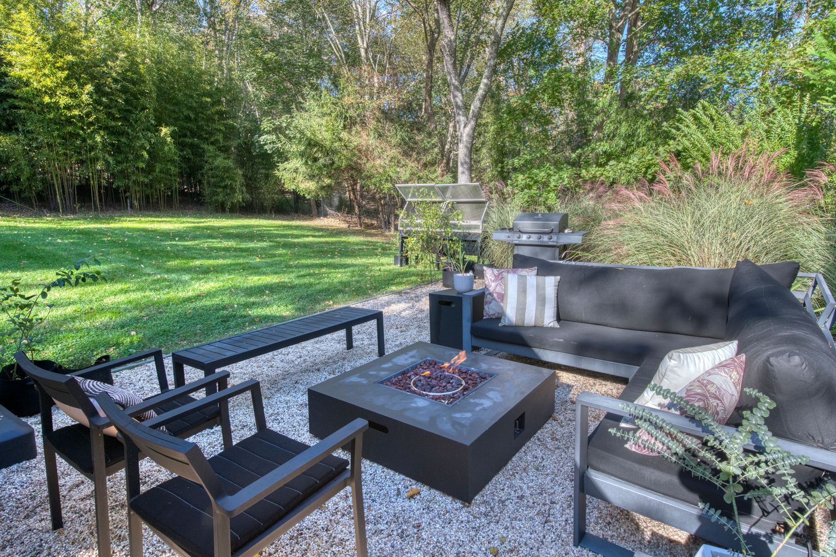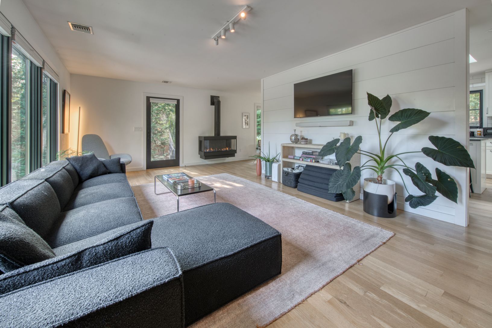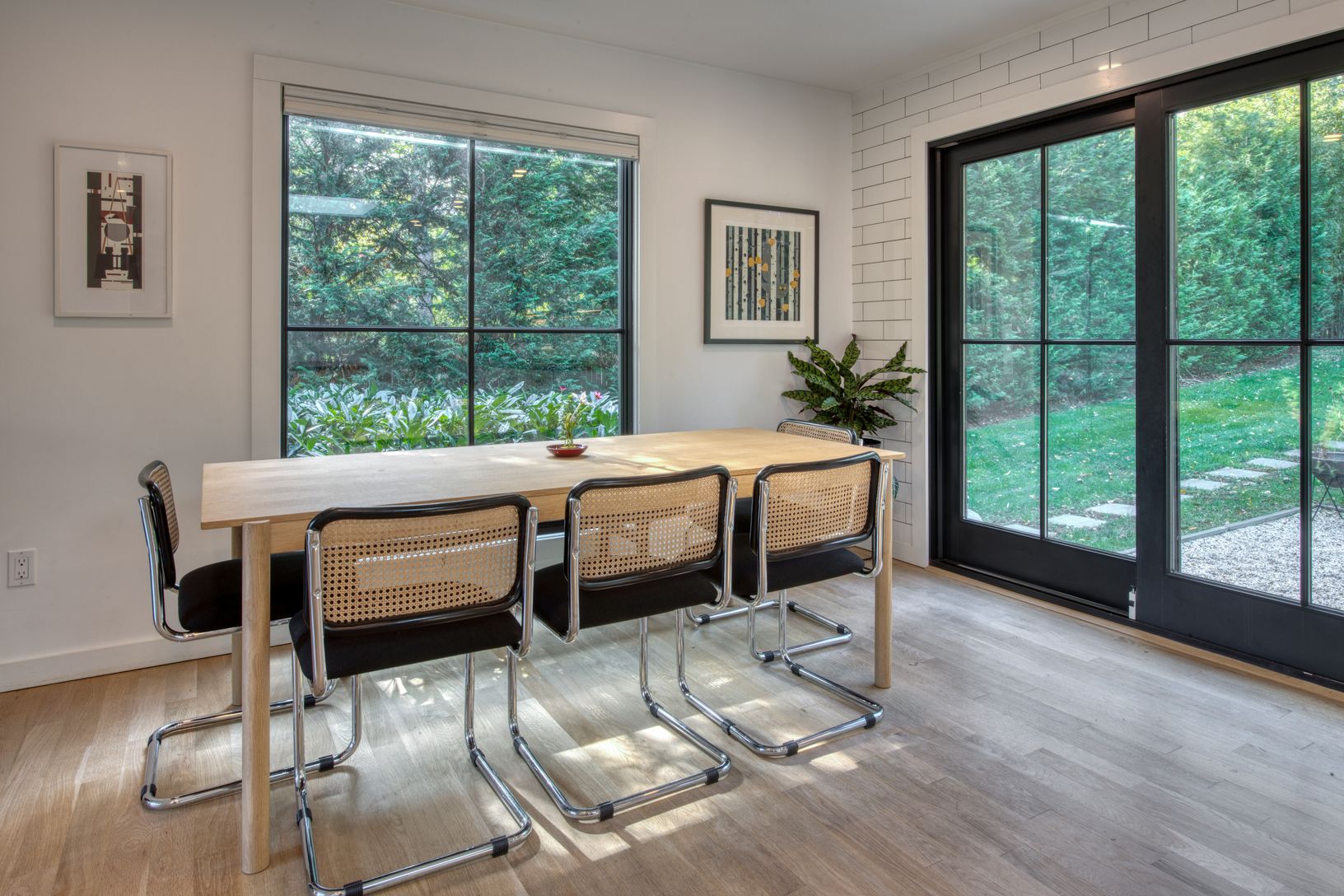 A thoughtfully designed retreat offering peace, privacy, and understated luxury. Tucked away on a private drive in the island's center, you're close enough to bike to all of the island’s beaches or restaurants. The approach sets the tone: a winding drive reveals the house gradually. The home emerges across an expansive lawn, its clean black lines and Anderson windows throughout creating a striking silhouette against the natural canopy. That ha