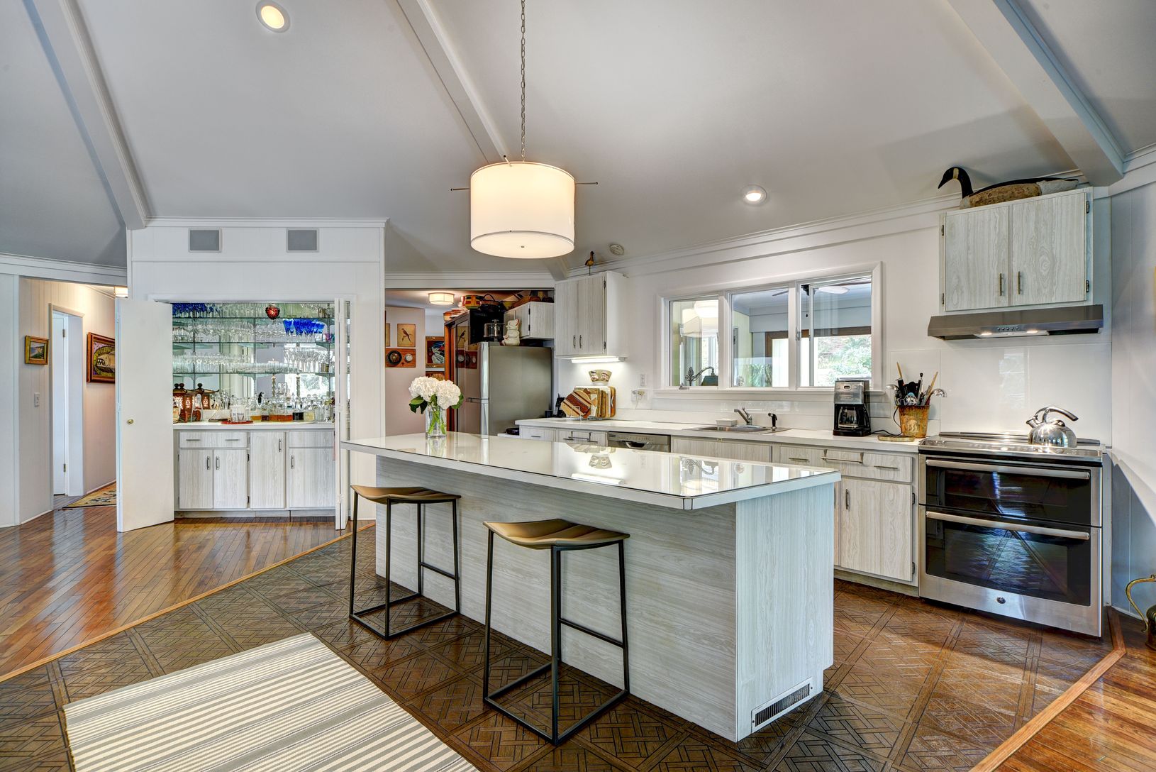Located across the street from Three Mile Harbor, this lovingly restored and maintained contemporary, sits up high on 0.60± acre. With scenic water views, private deeded access Three Mile Harbor and a private beach to store your paddle boards and kayaks. The over 2,900± sf home features 4 bedrooms and 3 full bathrooms. This upside down style house features a first floor with an expansive kitchen and entertaining area with a soaring fireplace,