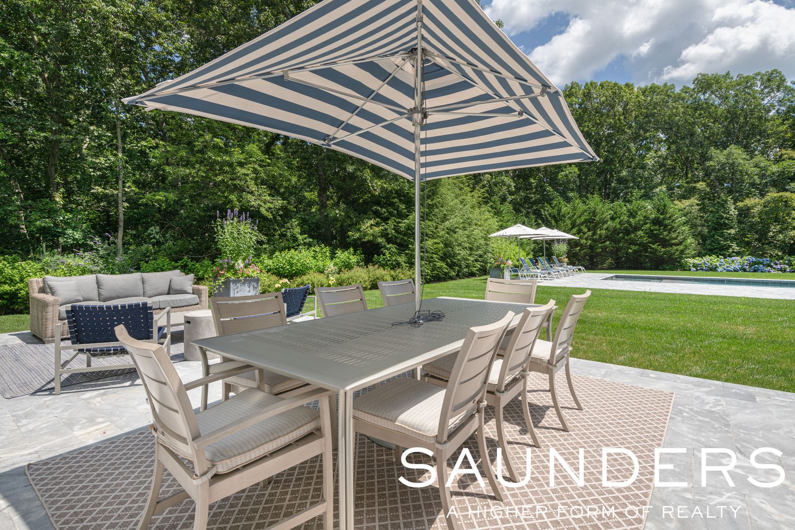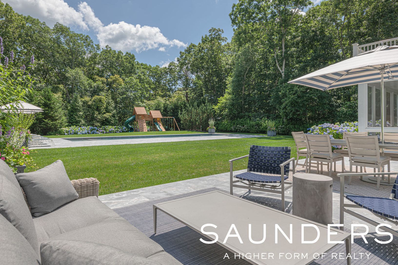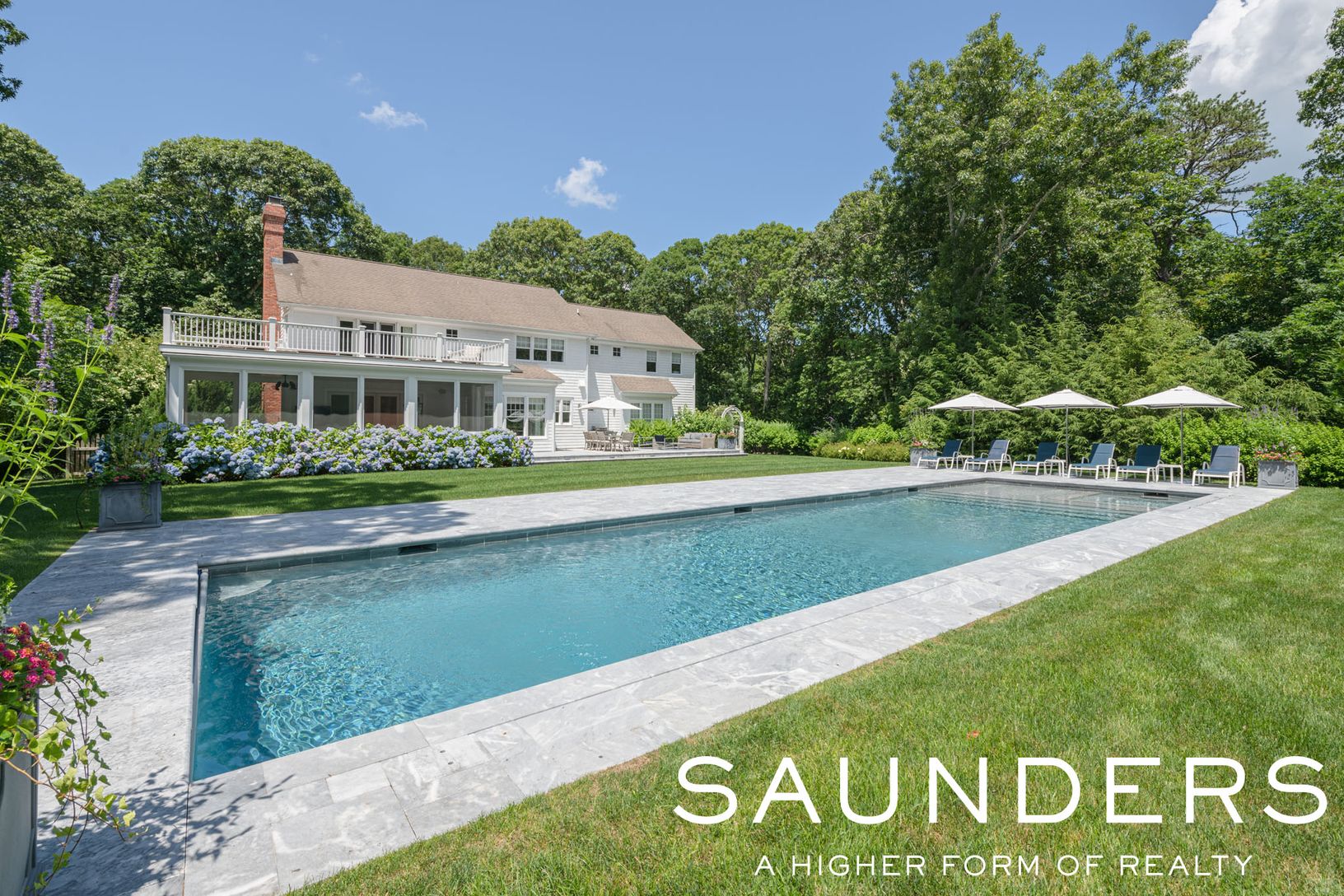 Located down a long private driveway in Sagaponack, this classic home offers the best of Hamptons living. This elegant custom-built home features a brand-new professional kitchen with quartz countertops, top-of-the-line appliances, and radiant heat floors. The breakfast area in the kitchen overlooks the beautiful backyard. Off of the kitchen is the formal dining room, and also the living room with a masonry fireplace and coffered ceilings. The