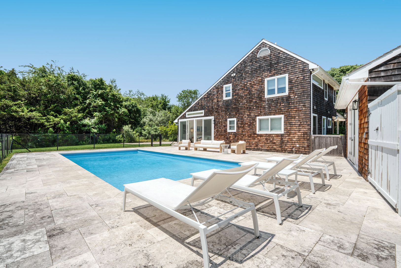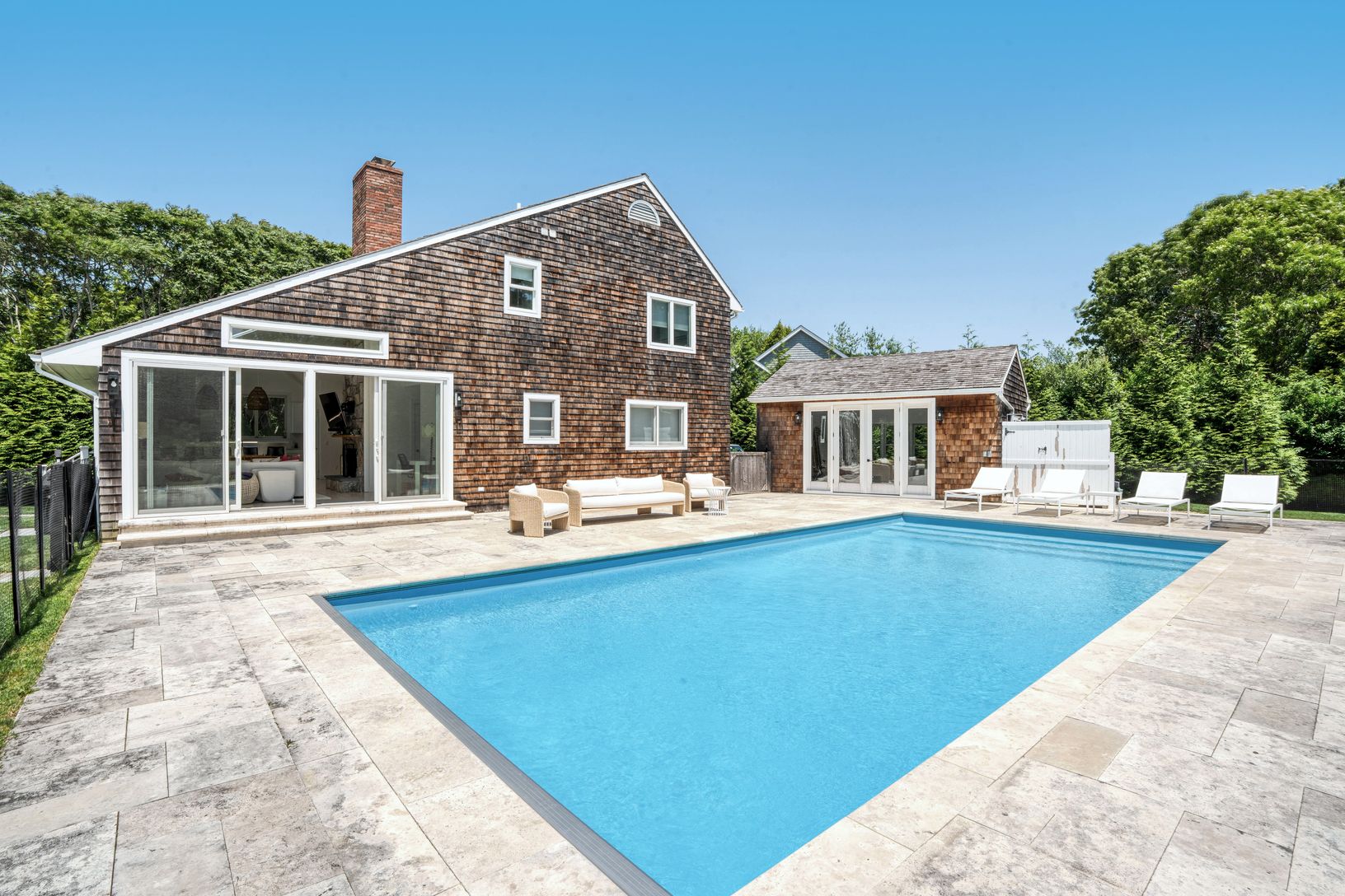 A short ride from ocean beaches and Bridgehampton Main Street, this bright and beachy recently renovated 4 bedroom shingled traditional has a voluminous open floor plan with gourmet kitchen and outdoor spaces abound to enjoy the heated pool, al fresco dining, and community tennis courts.