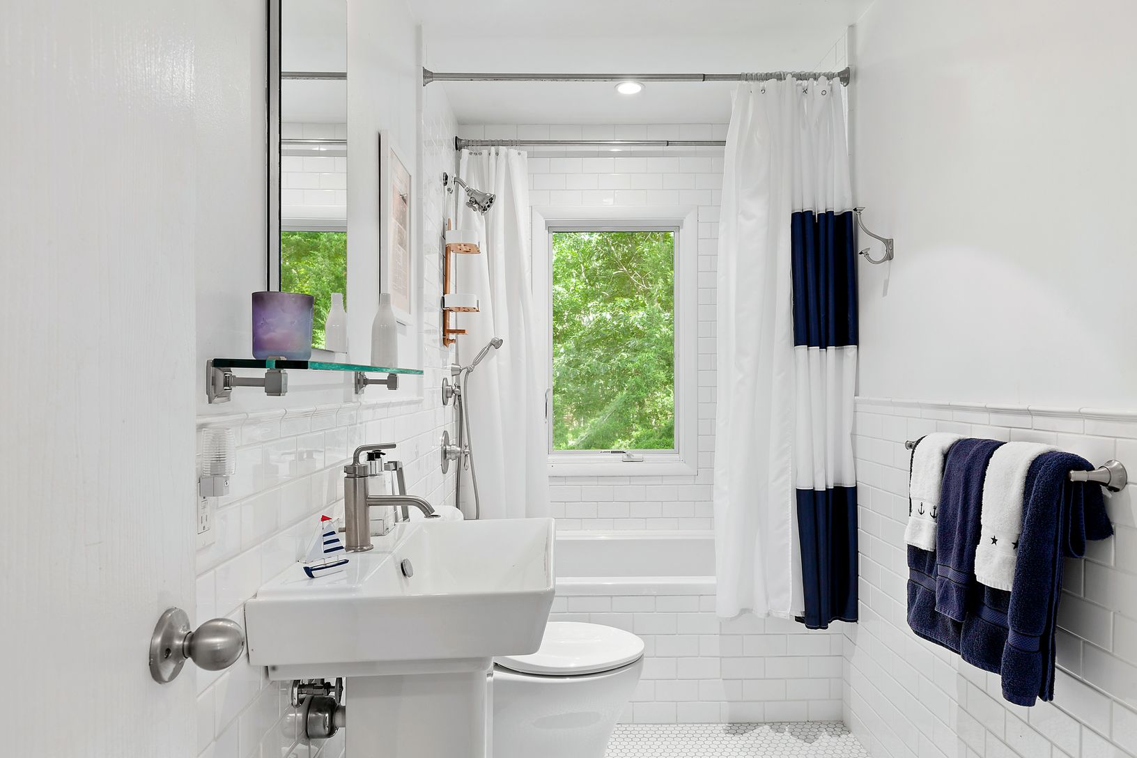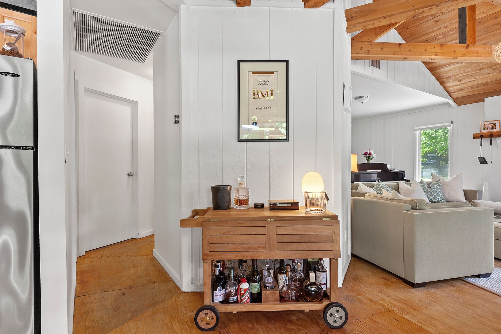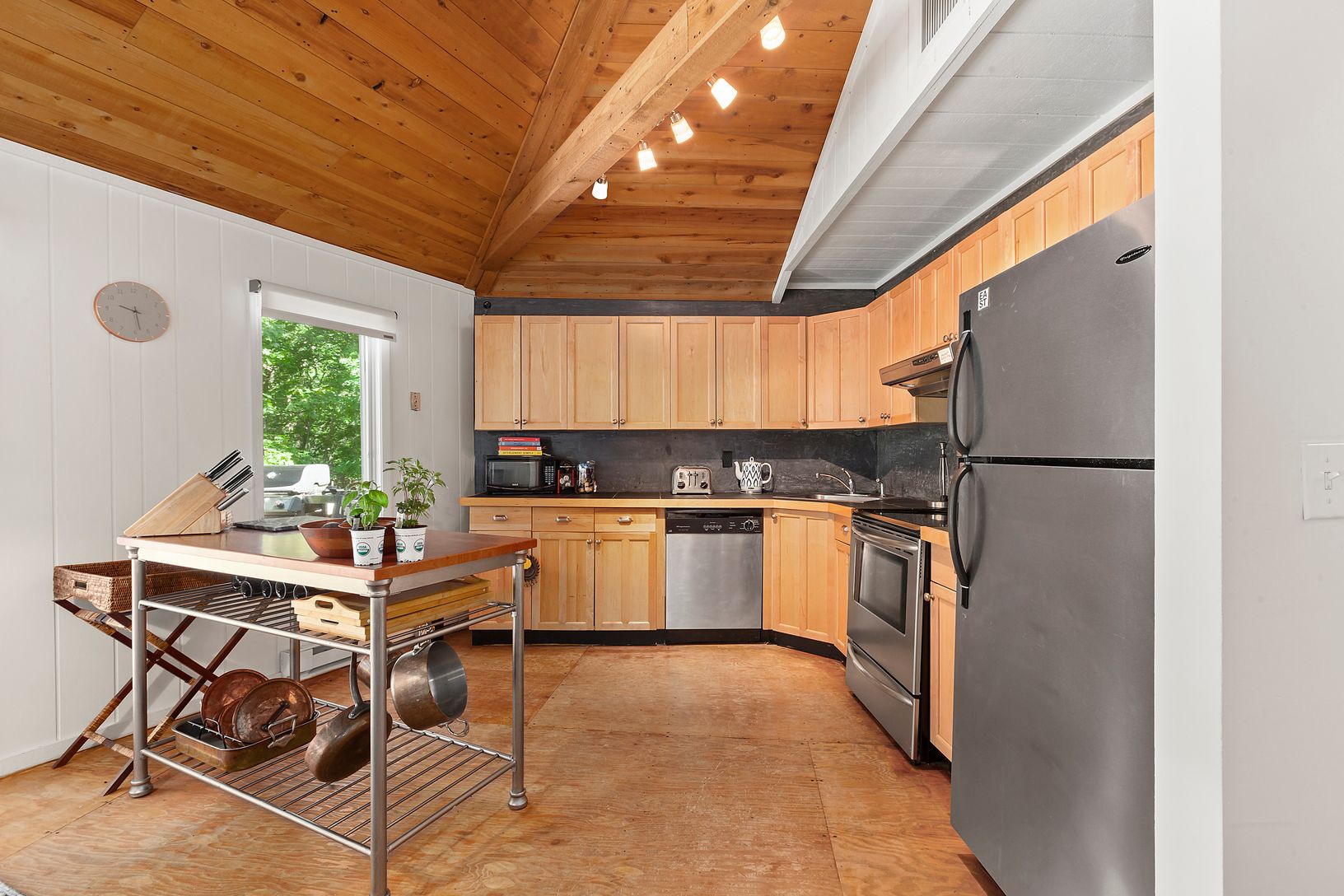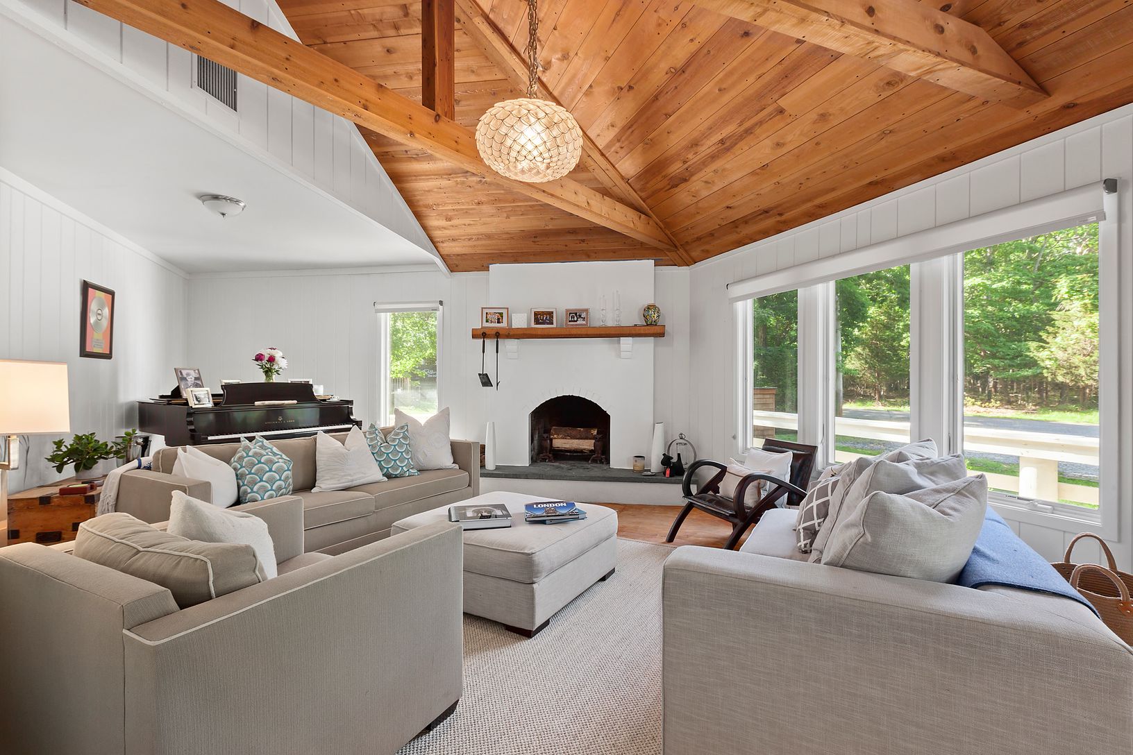 Stylish and chic, this Beach Bungalow is truly one of a kind! Sited on almost 1/2 acre, this hexagonal shaped home features 3 bedrooms, 2 bathrooms and an open floor plan with exposed cedar beamed ceilings, open kitchen, dining area and living room with wood burning fireplace. The first floor master and guest bedrooms share the common bathroom, and the finished lower level boasts a TV room, guest bedroom, guest bathroom, office area and laundr