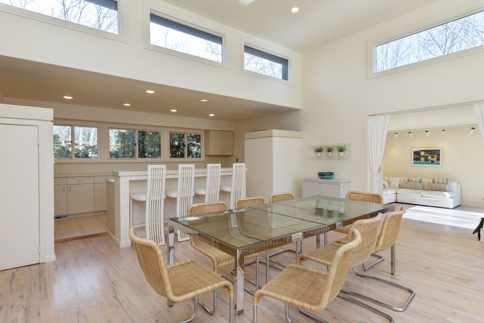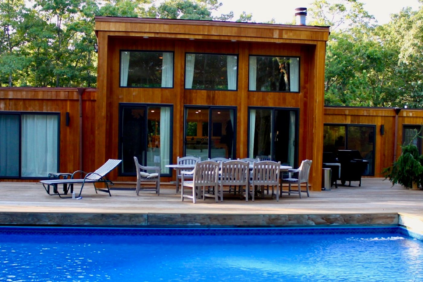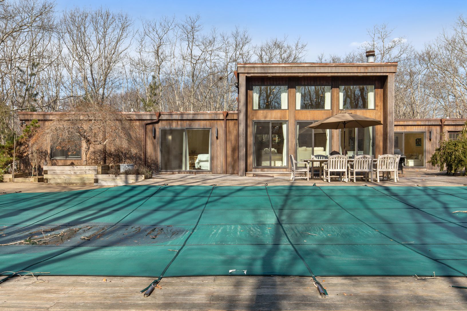 This one level Modern style home has an open floor plan that captures the natural light which flows in from the many windows and doors. Enter into a bright foyer and step up into the spacious living room with a fireplace and four sets of sliding glass doors that look out onto the expansive deck and heated pool. The kitchen and dining areas are open to the living room making it perfect space for small and large groups. There is a wing with a de