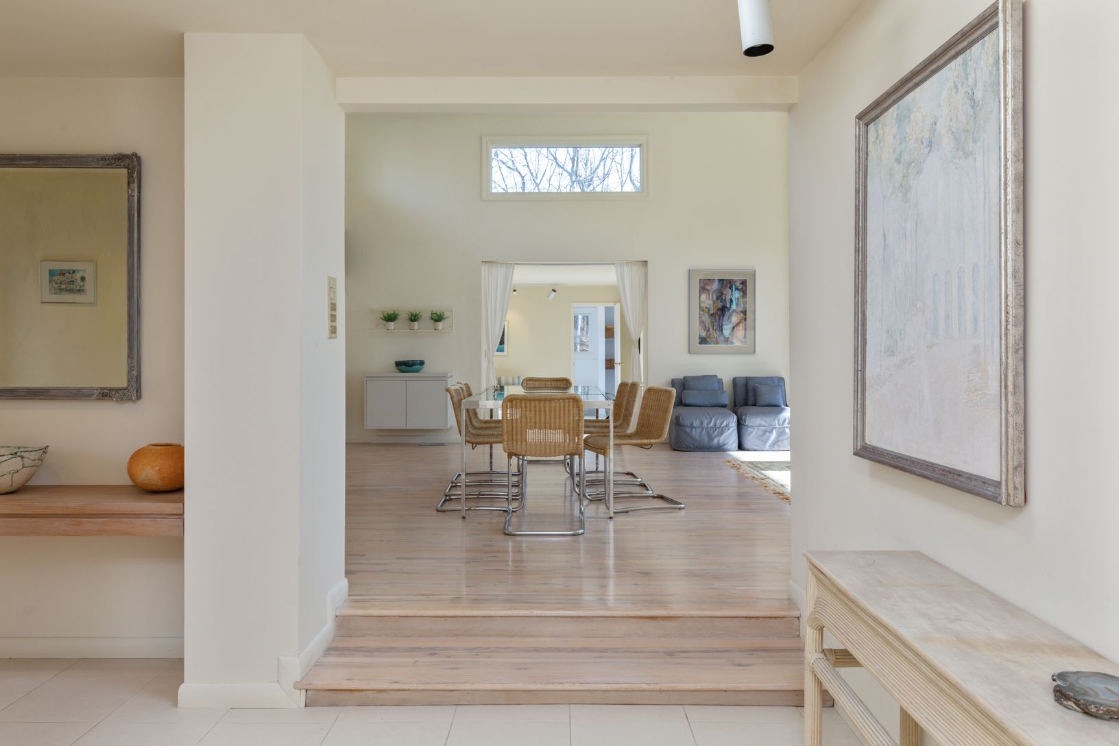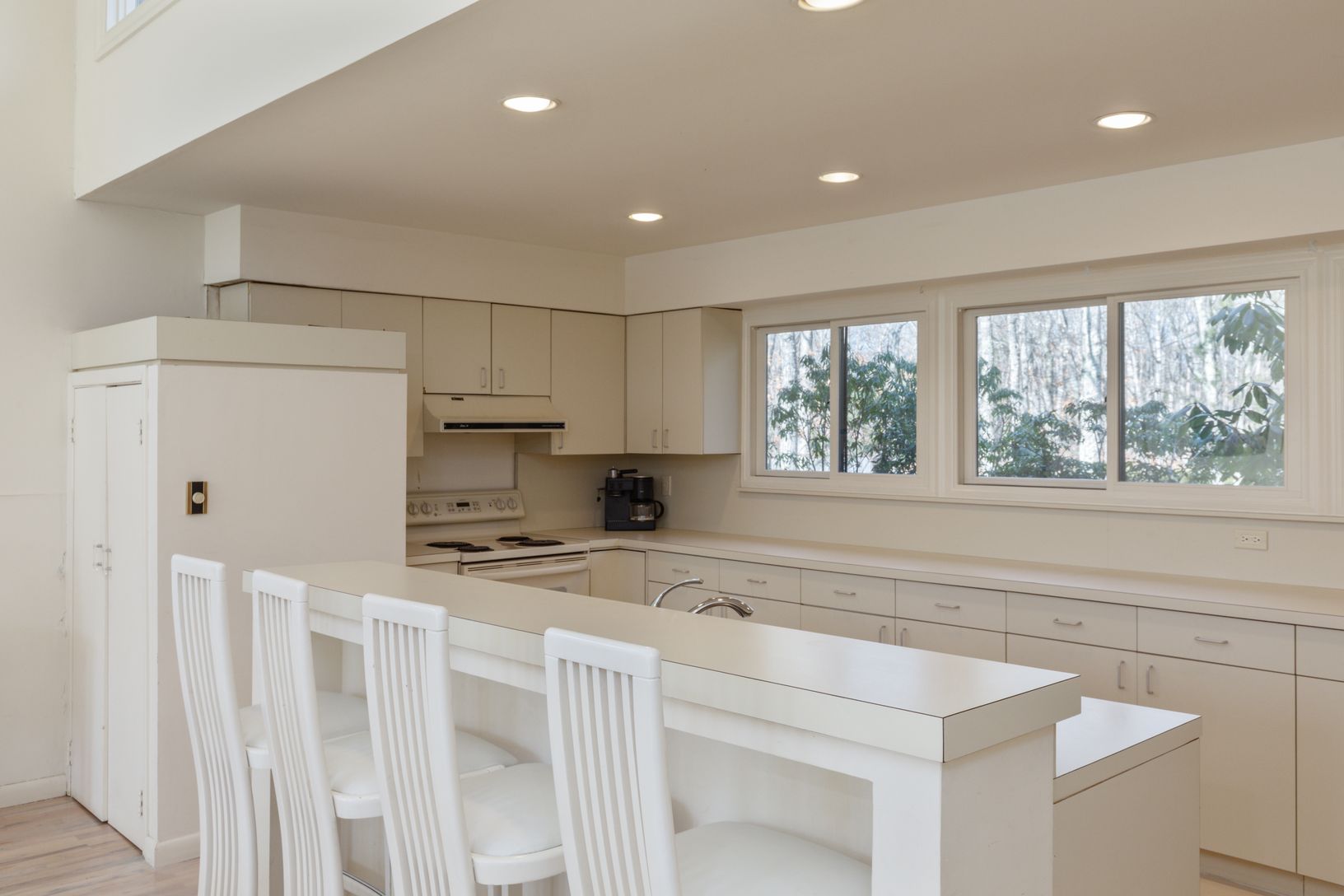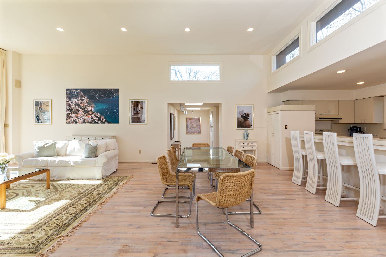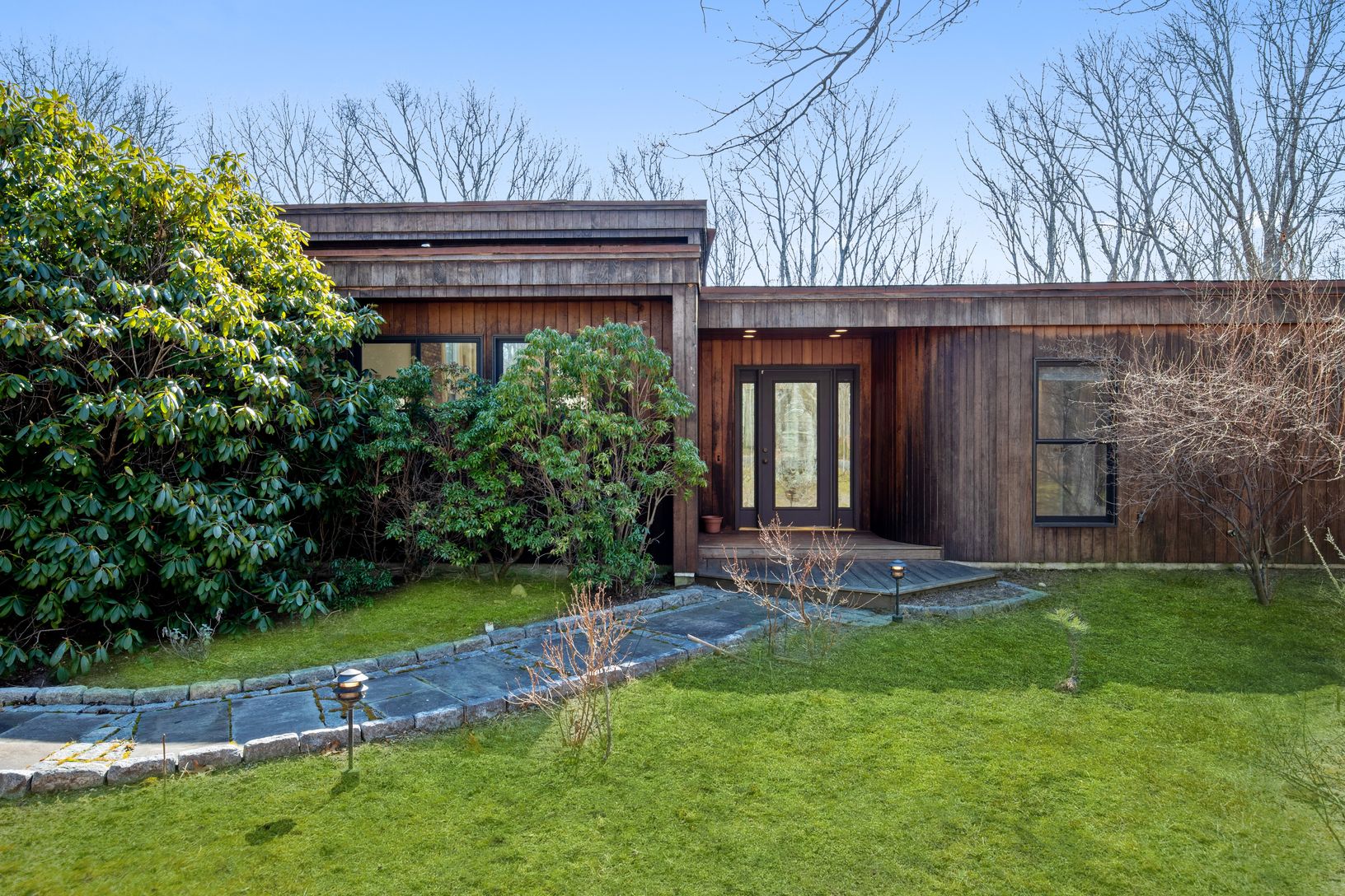 This one level Modern style home has an open floor plan that captures the natural light which flows in from the many windows and doors. Enter into a bright foyer and step up into the spacious living room with a fireplace and four sets of sliding glass doors that look out onto the expansive deck and heated pool. The kitchen and dining areas are open to the living room making it perfect space for small and large groups. There is a wing with a de