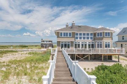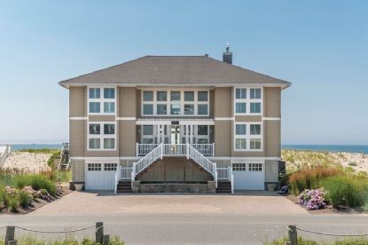 The ultimate beach house with amazing ocean to bay views. Master suite with 180 degree ocean views, first floor junior suite and three additional bedrooms, three and one half bathrooms, eat in gourmet kitchen, dining area, living room with fireplace, den, media room, hot tub, oceanfront decking and private walkway to the ocean and right of way to the bay. Room for a pool! Oceanfront retreat is ready to move in, just bring your toothbrush and b