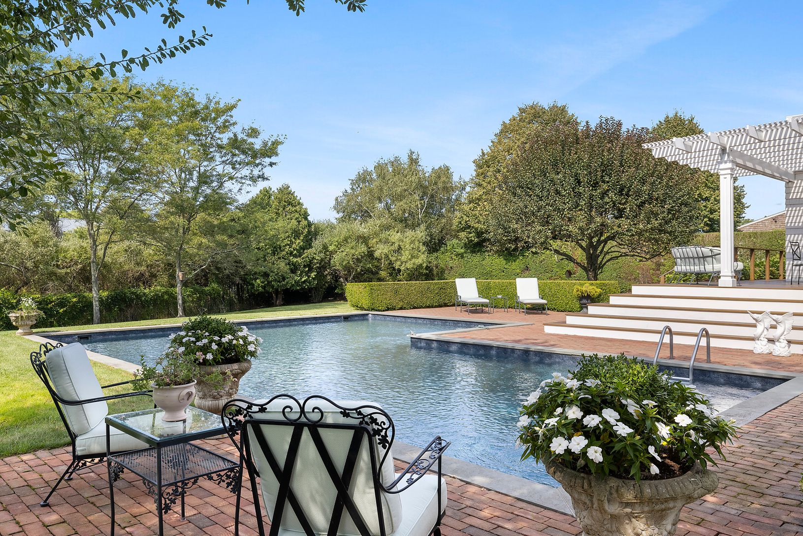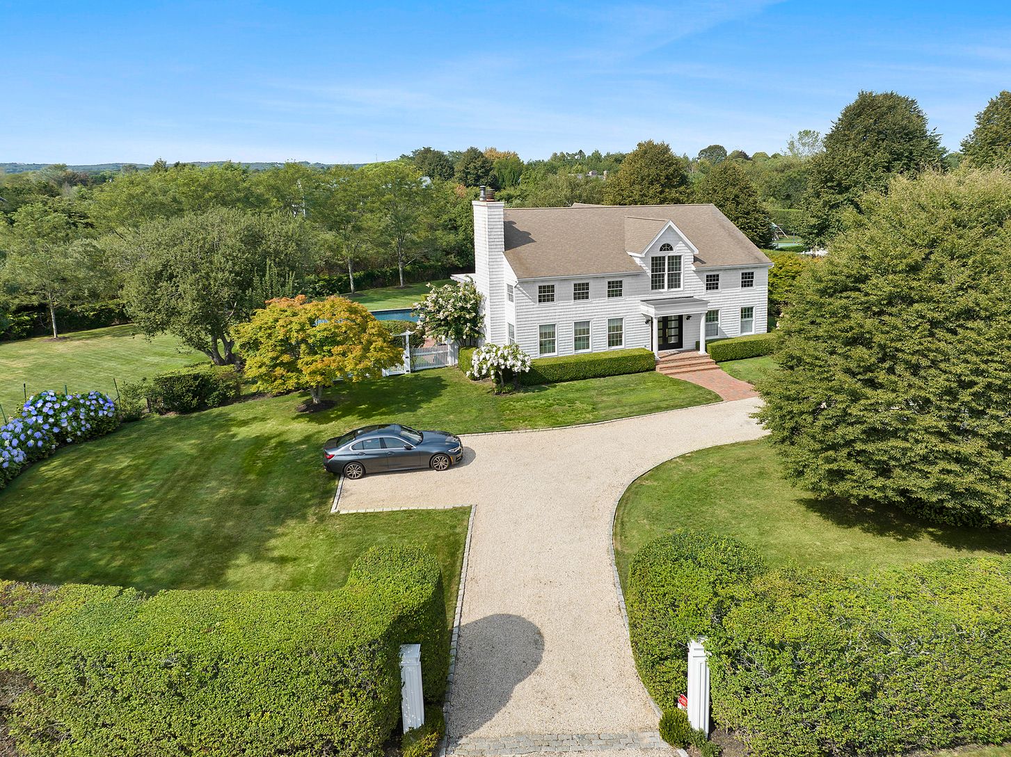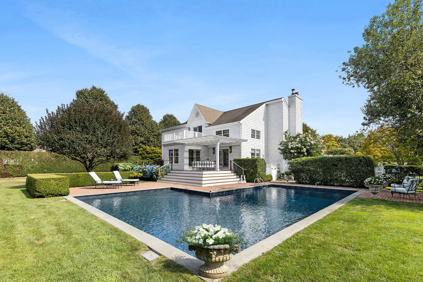 Elegant, 2-story Traditional on a quiet cul-de-sac, south of the highway, in the Hayground area in the hamlet of Water Mill and Bridgehampton. Positioned on .99-acres and bordering on a 2.2-acre reserve, the property boasts a pool with bluestone coping, a brick patio, a Pergola covered porch, custom Ipe decking flowing from the kitchen through to the primary bedroom suite, an outdoor shower, a newly installed Kohler generator, and beautiful la