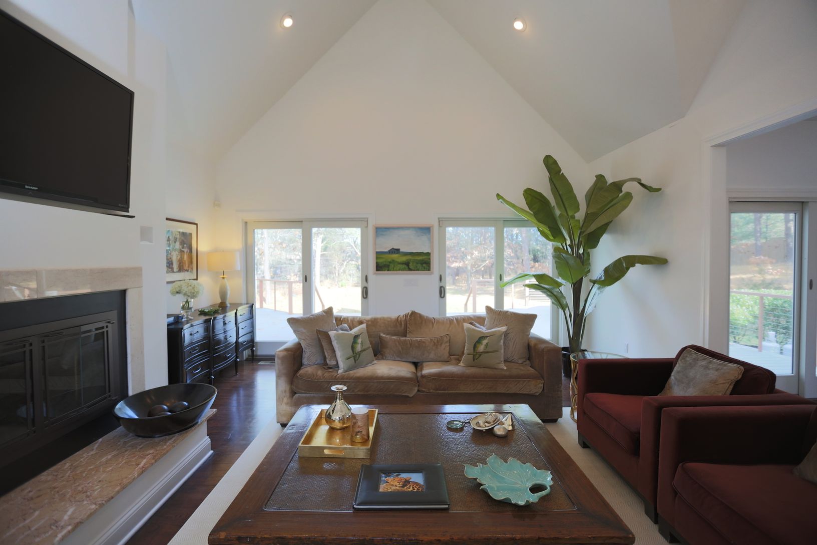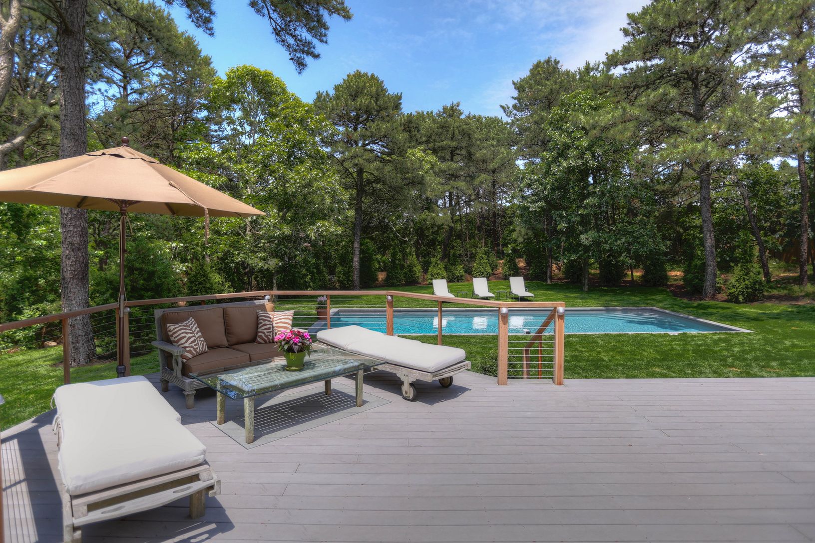 Turnkey, stylish Post Modern home on over 1 acre of stately grounds, offers grand, light-filled great room with soaring ceilings and oversized fireplace, open dining, 4 bedrooms, including gracious first floor master suite, 4 baths, media room, office/bedroom, eat-in kitchen with breakfast bar, multiple sliding glass doors that lead to an expansive deck and pool area. Additional features include, dark hardwood floors throughout, laundry fac
