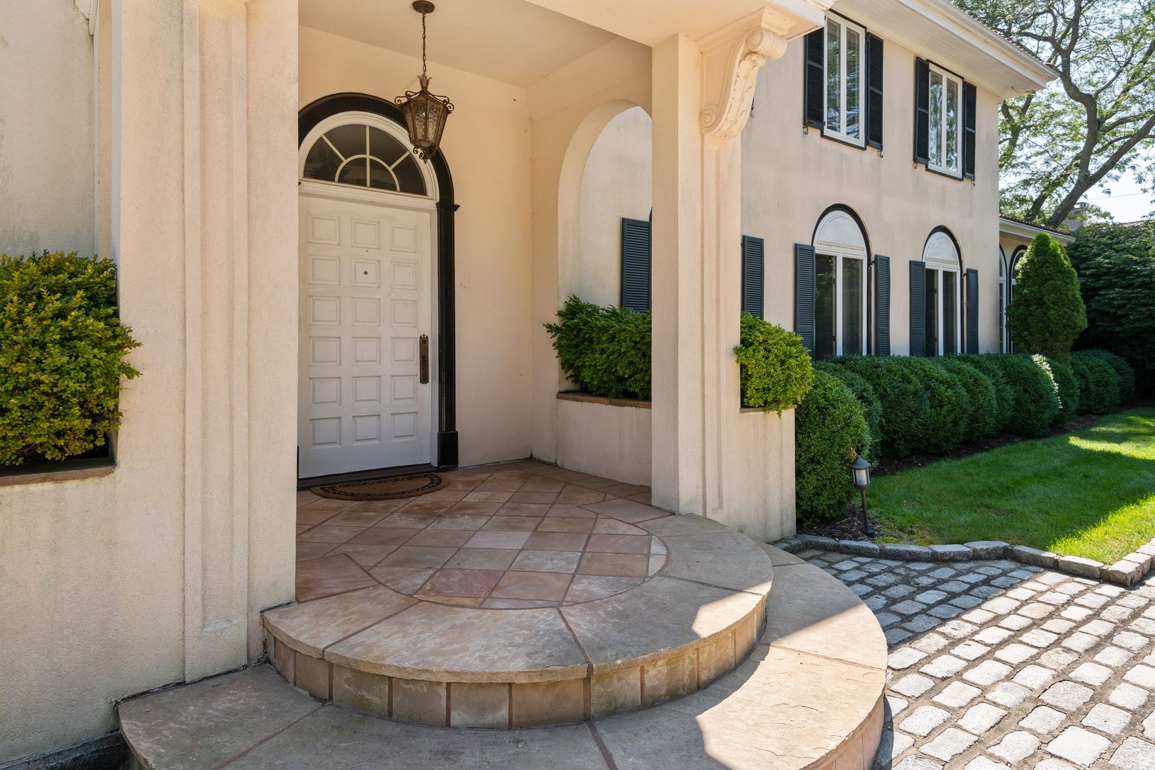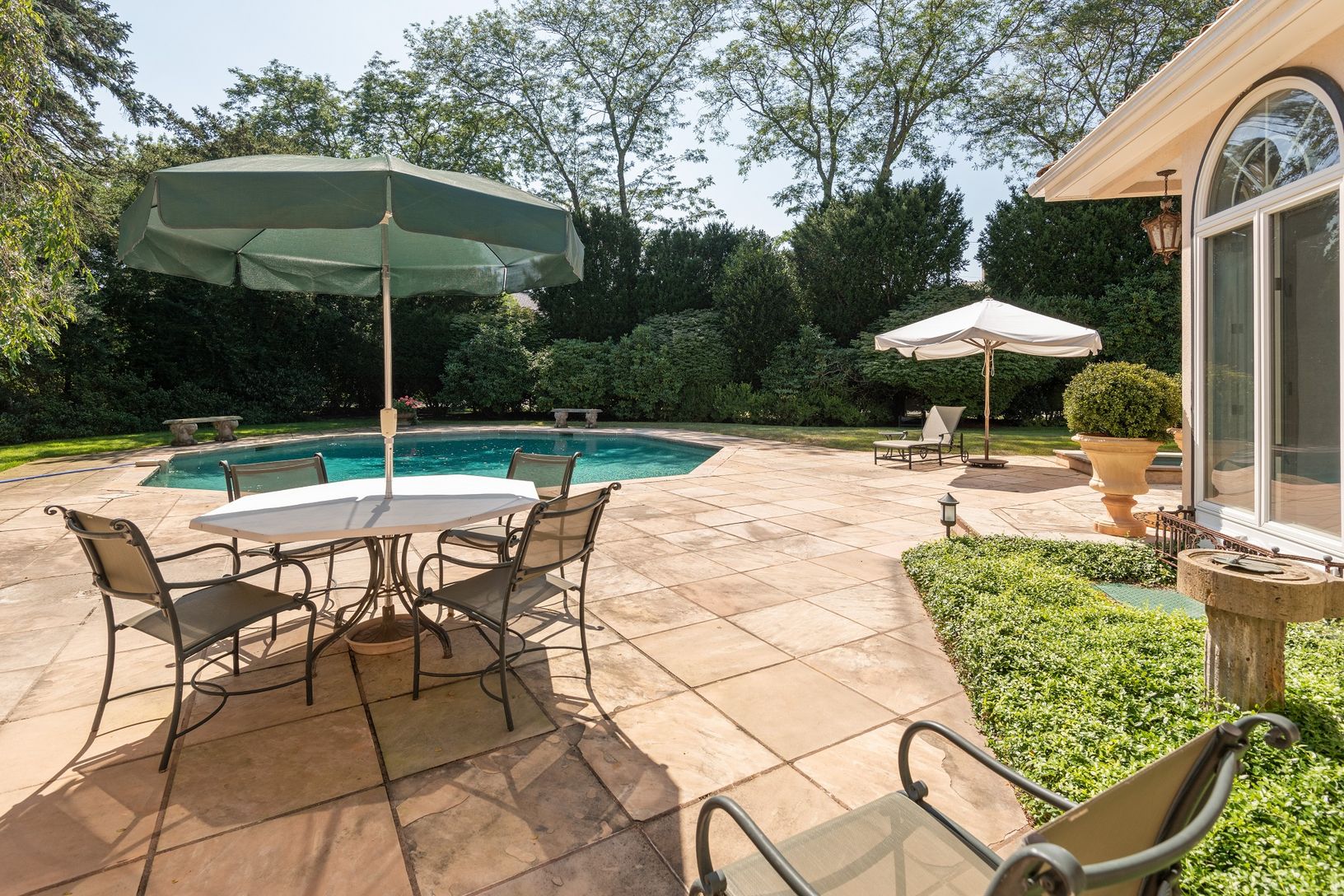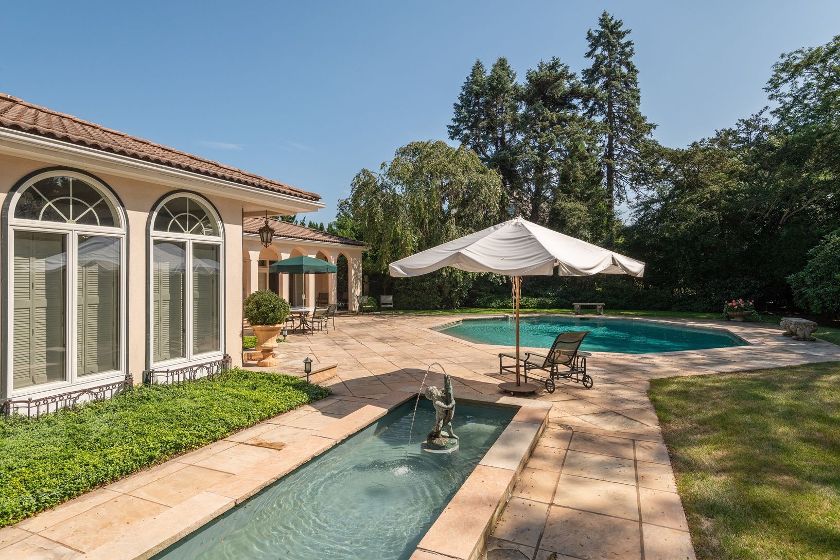 Behind the hedges, in the heart of the Southampton Village Estate Section sits this five-bedroom, five-and-one-half bath Mediterranean Villa on a beautifully landscaped +/- half acre. Impeccable indoor and outdoor settings create a balanced home with ample space to relax and entertain. The home opens with a double-height entrance, living room, sitting room, and a bright sunroom overlooking a multilevel terrace and fountain. The first floor has