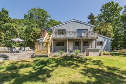 This newly renovated postmodern home is located near Three Mile Harbor and backs up to a 40-acre reserve. The home features five bedrooms, with a first floor master, four baths, a living room with an expansive washed brick fireplace, dining room with sliding glass doors to a deck, an open kitchen with stainless appliances and stone countertops, and a den, along with a 1,200+/- sq. ft. finished basement. This property is located on .95 acre on