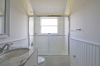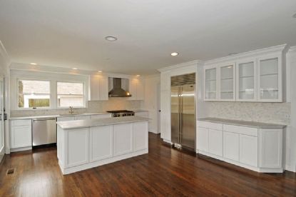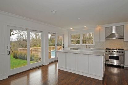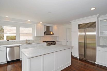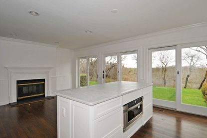 This Bridgehampton home offers a central, south-of-the-highway location between Water Mill and Sagaponack and is located on a quiet cul-de-sac. The totally renovated house features 5 bedrooms, 4 baths, step-down bright living and dining room with 2 fireplaces, beautifully new wainscotted kitchen with fireplace, marble counters and all professional-style appliances, 2nd floor master bedroom suite with limestone bathroom, fireplace and outside