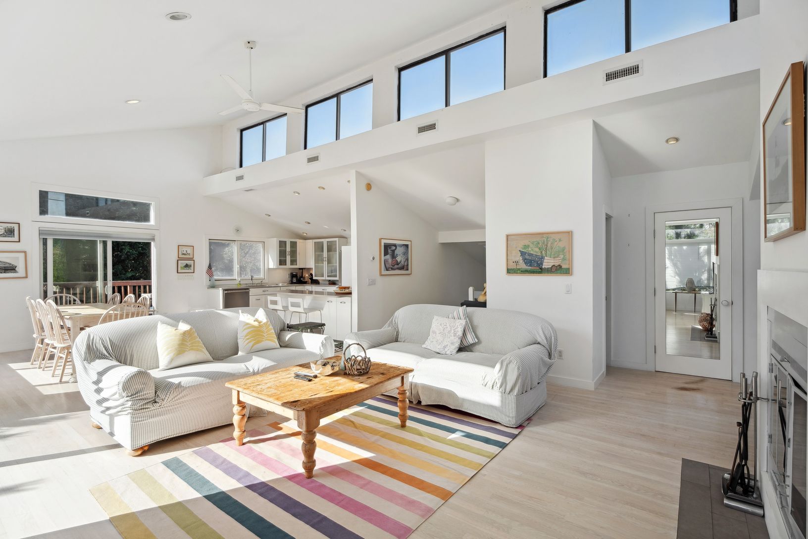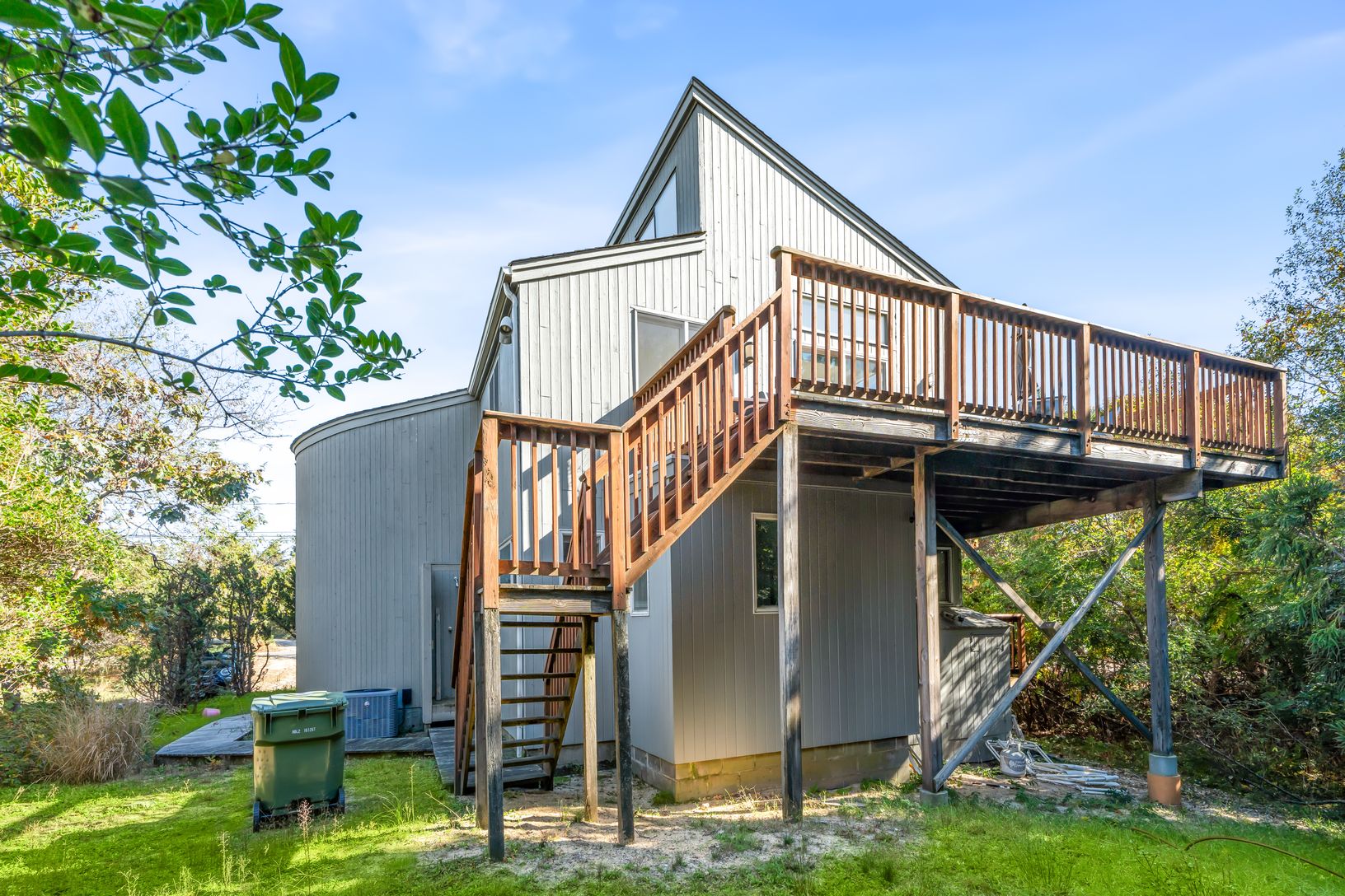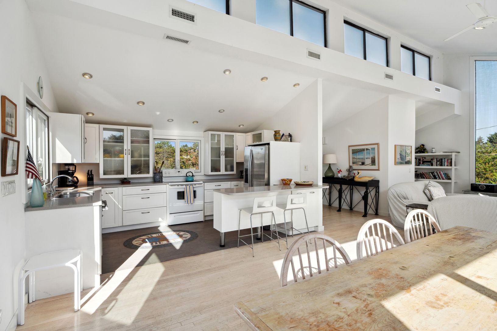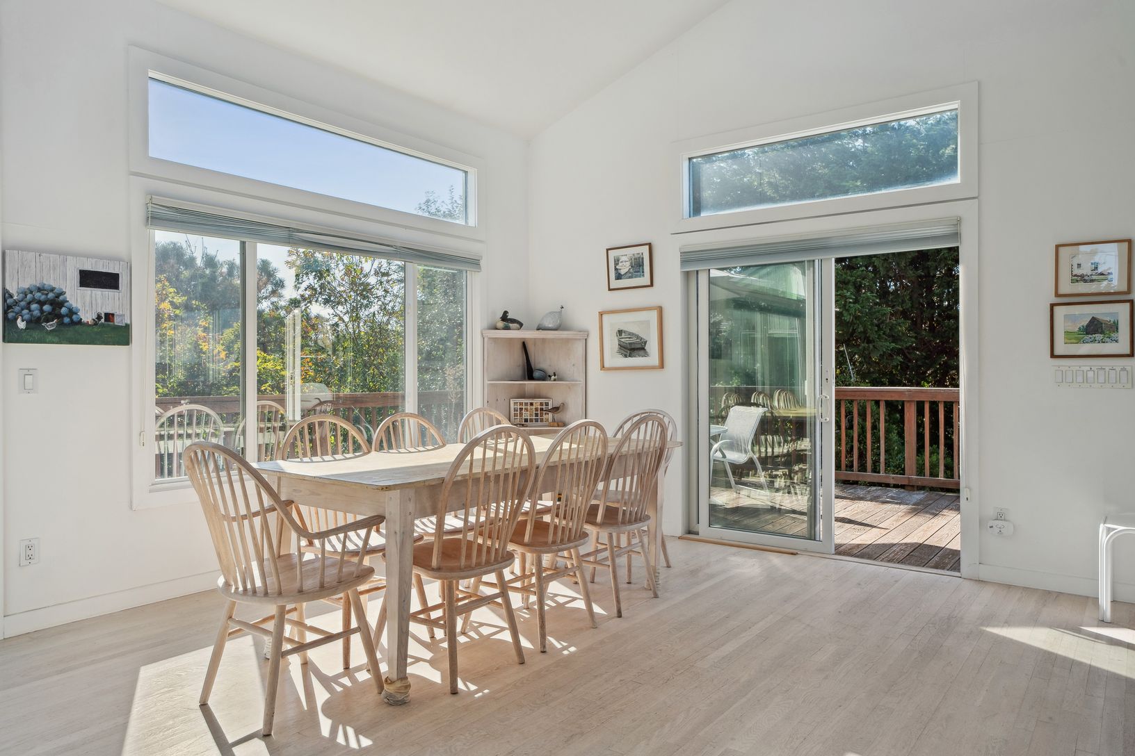 This house has just been reduced for sale in the Amagansett Dunes and is very close to the ocean beach. This cheerful upside down houses has a bright open concept living space upstairs with a large second story deck for grilling, dining or just sitting in the sun. Surf Drive is a double wide paved street, which makes access to the property easier than some of the tight Dunes streets. Downstairs, there are four bedrooms and two of them are e