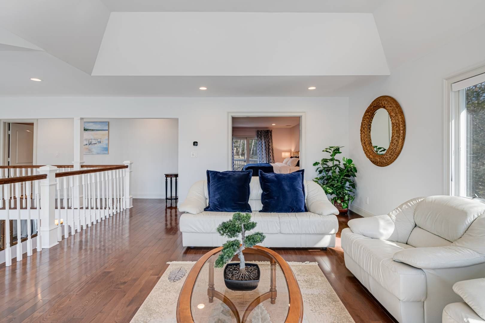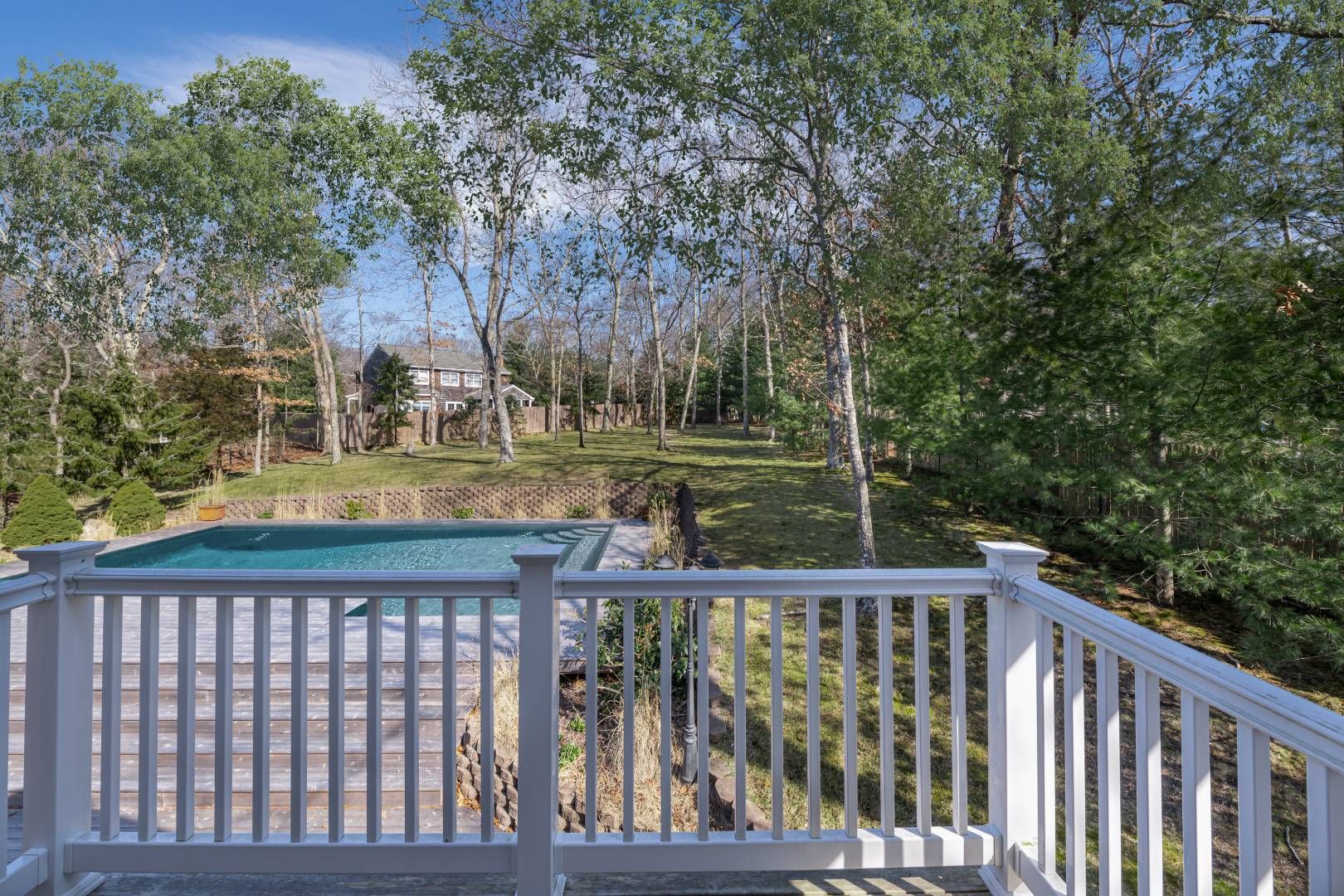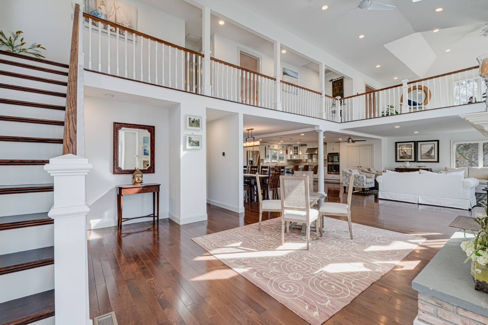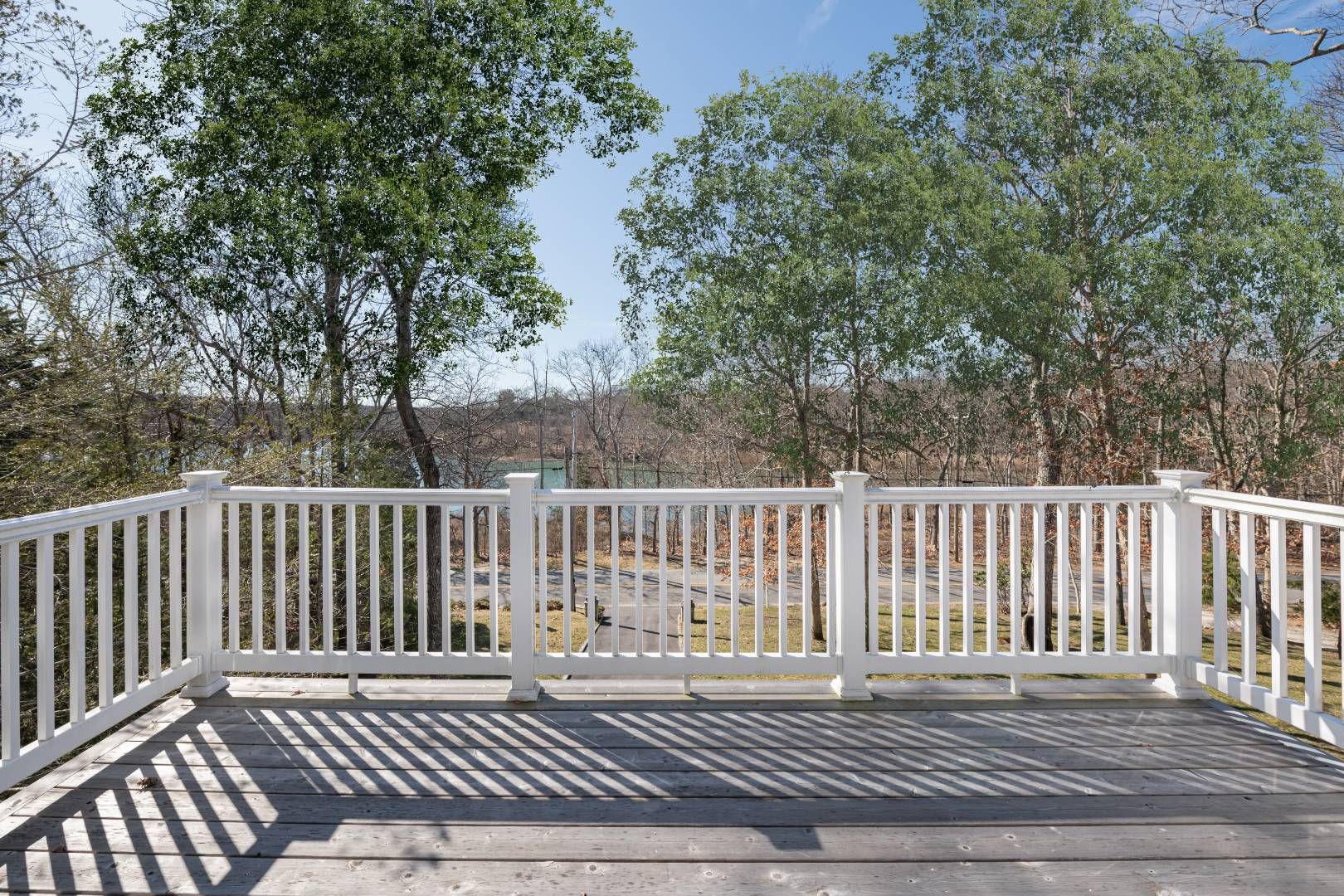 Near the end of Hands Creek Road this recently built light-filled four bedroom, three bath home on over half an acre presents water views of Hands Creek from several rooms and outdoor terraces. Just down the street is a beach where kayaks and paddle boards can be launched into Three Mile Harbor. The double height front entry with skylight leads into bright, open living areas - a living room with bay windows overlooking the water, high end eat-