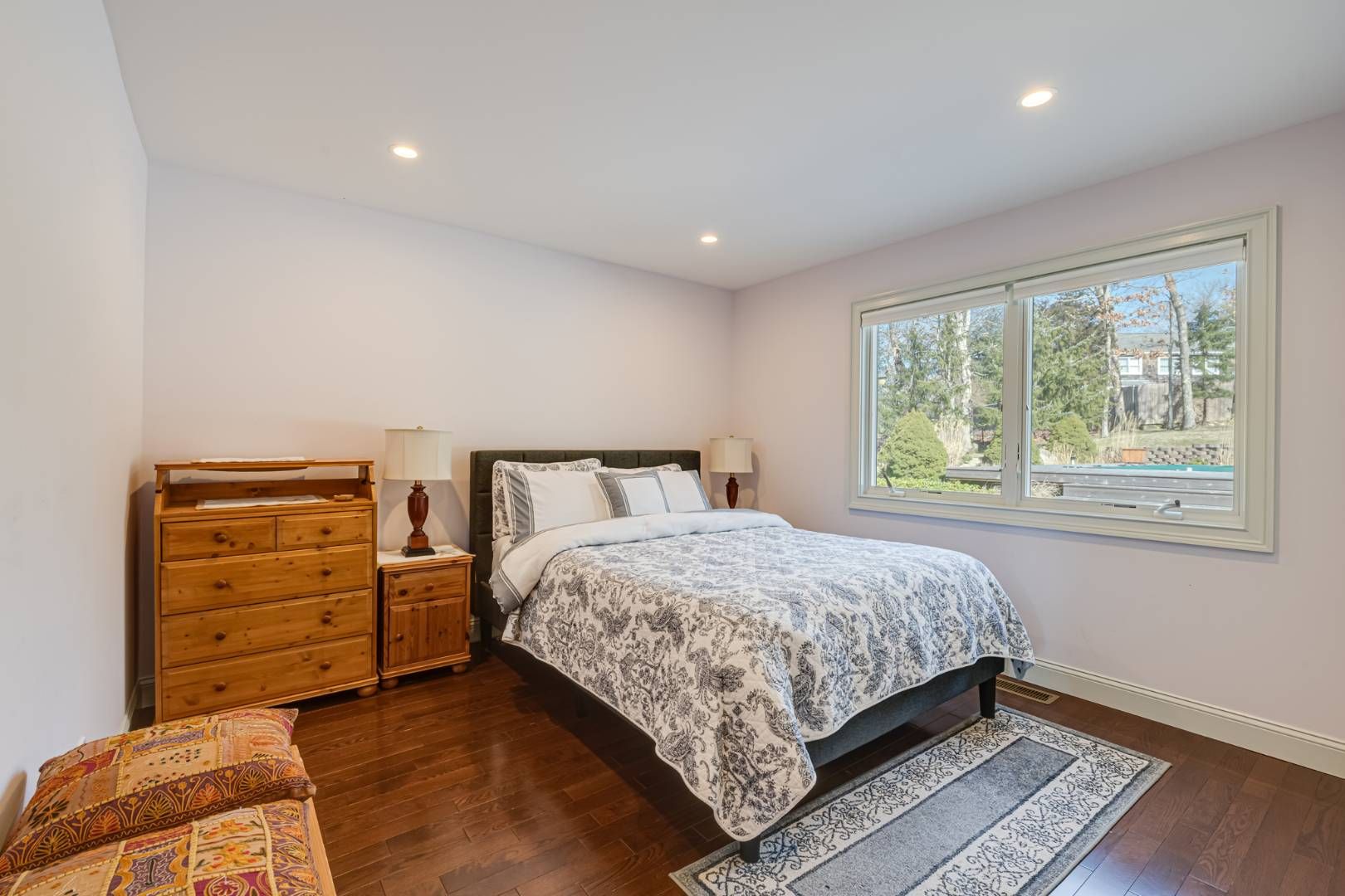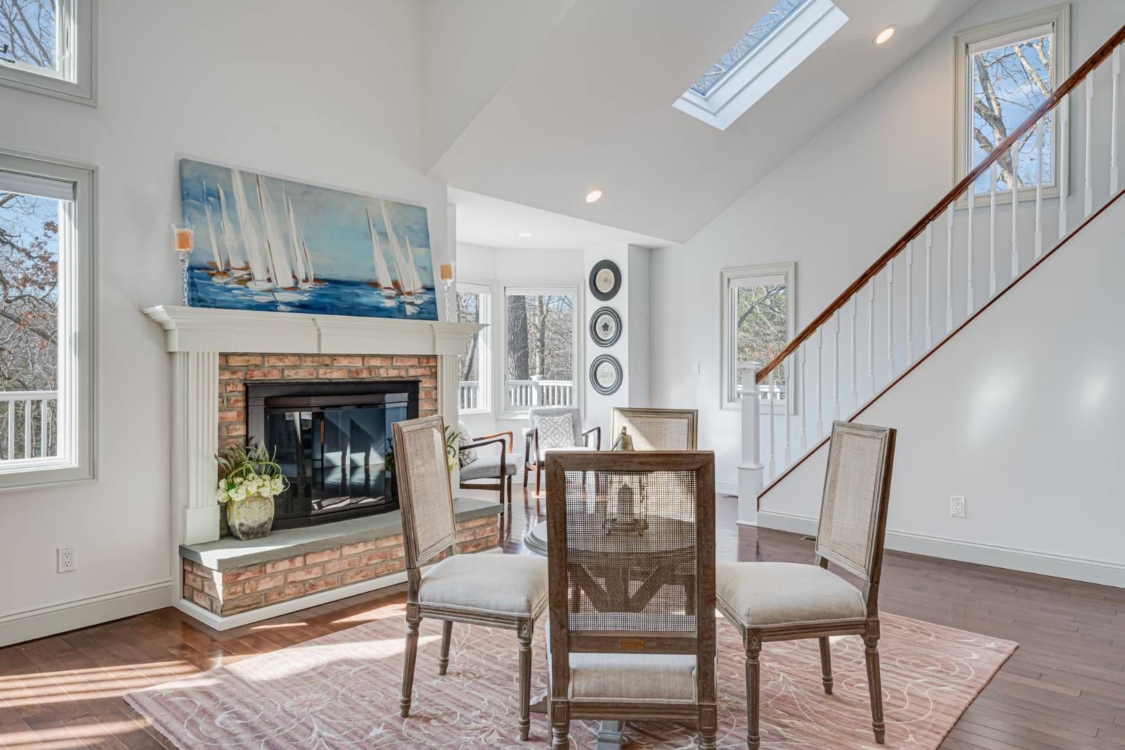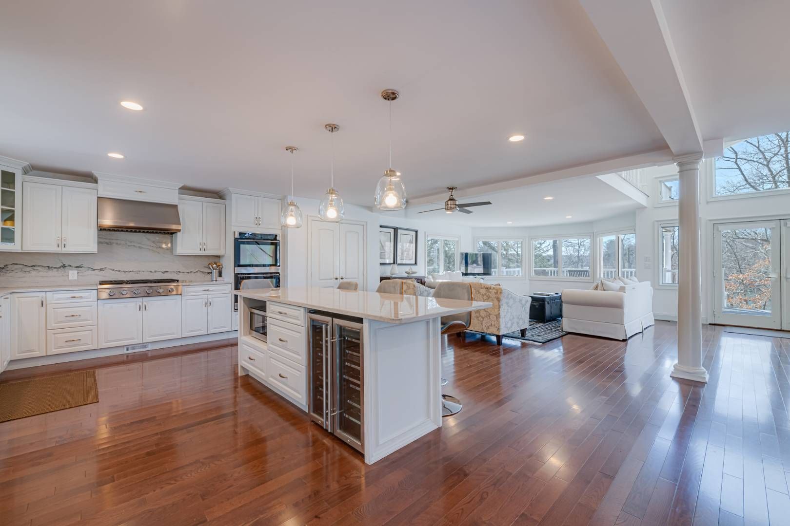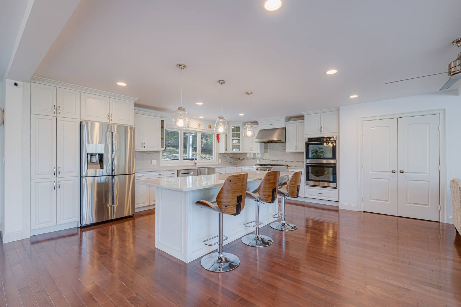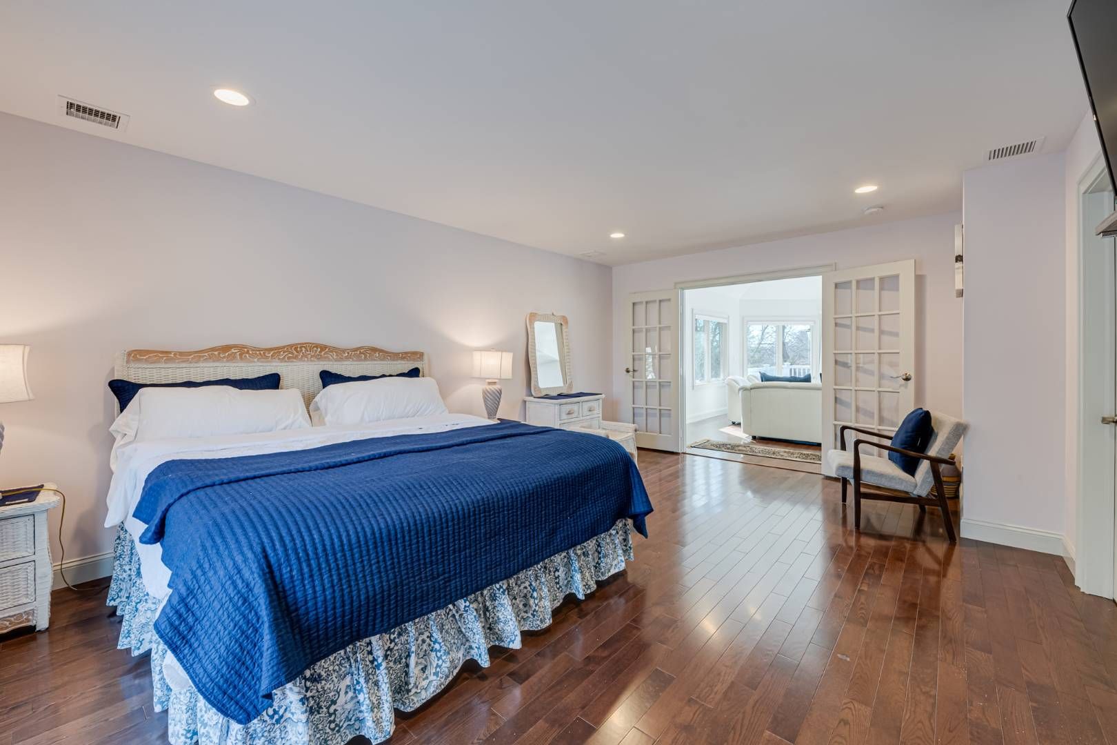 Near the end of Hands Creek Road this recently built light-filled four bedroom, three bath home on over half an acre presents water views of Hands Creek from several rooms and outdoor terraces. Just down the street is a beach where kayaks and paddle boards can be launched into Three Mile Harbor. The double height front entry with skylight leads into bright, open living areas - a living room with bay windows overlooking the water, high end eat-