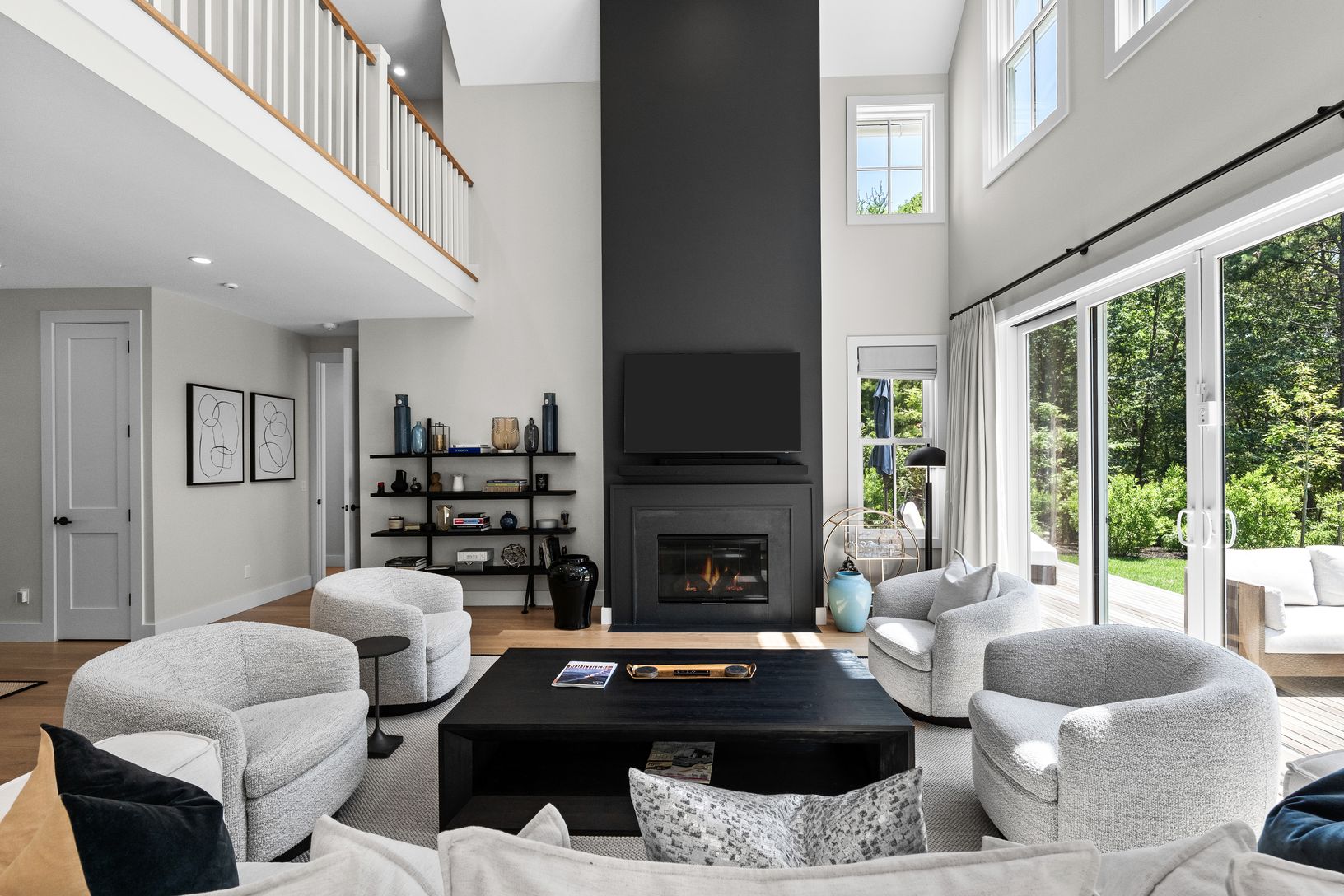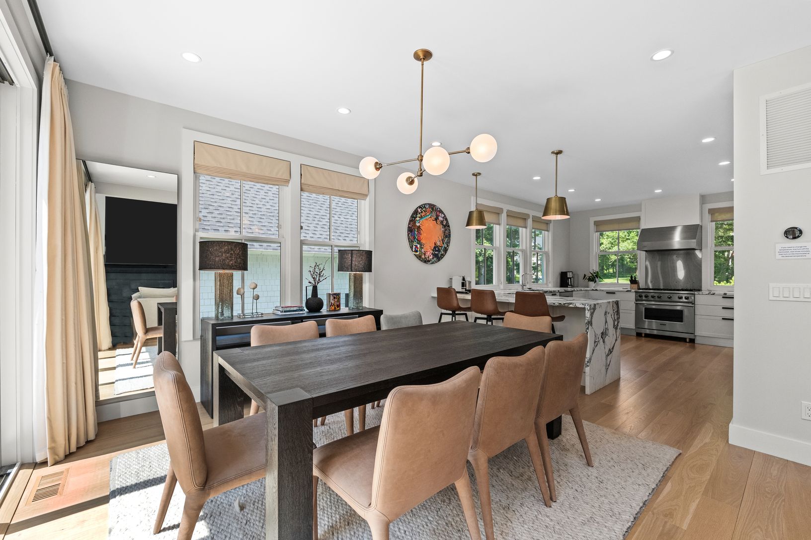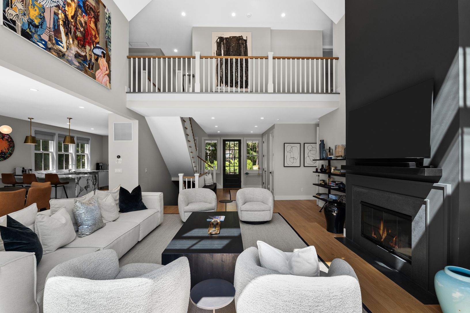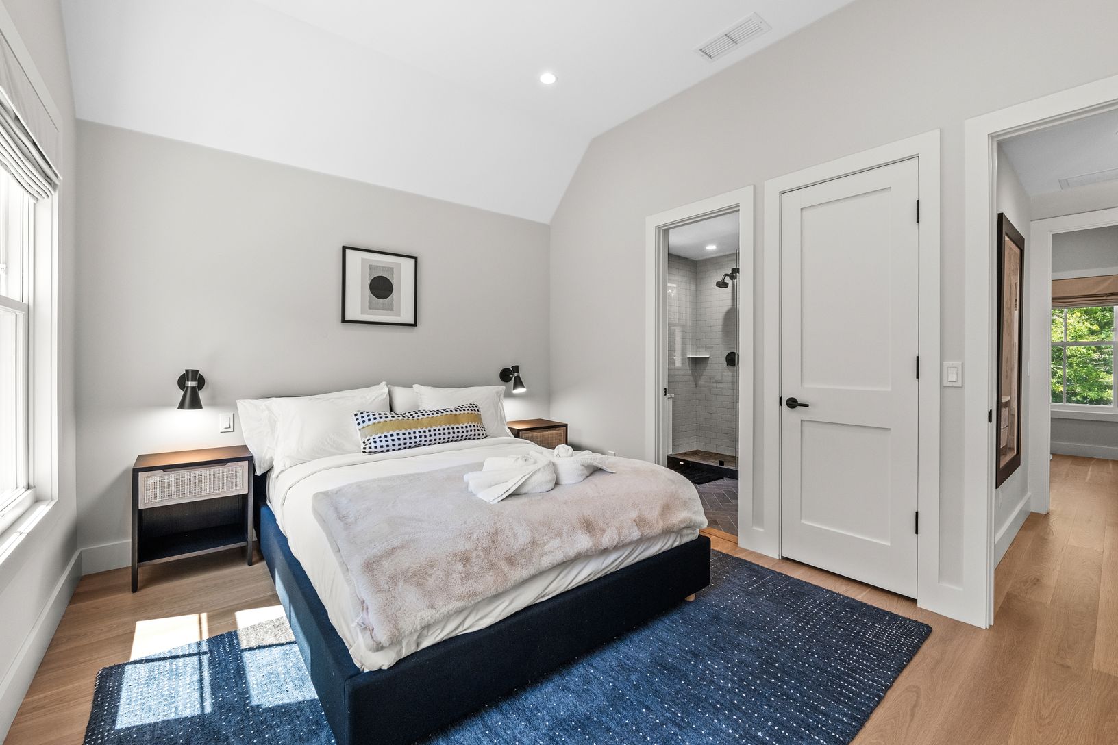 This 4,100 square foot, 7-bedroom, 5.5-bath house was completed in March 2023. The cathedral ceiling living room and open, light-filled layout create vibrant first-floor common spaces. The full-sized marble kitchen is equipped with top-of-the-line stainless steel appliances, including a Viking Range and microwave, a Miele fridge, a large dishwasher, and a 16-bottle wine cooler. The elegant first-floor primary bedroom opens onto a deck overlook