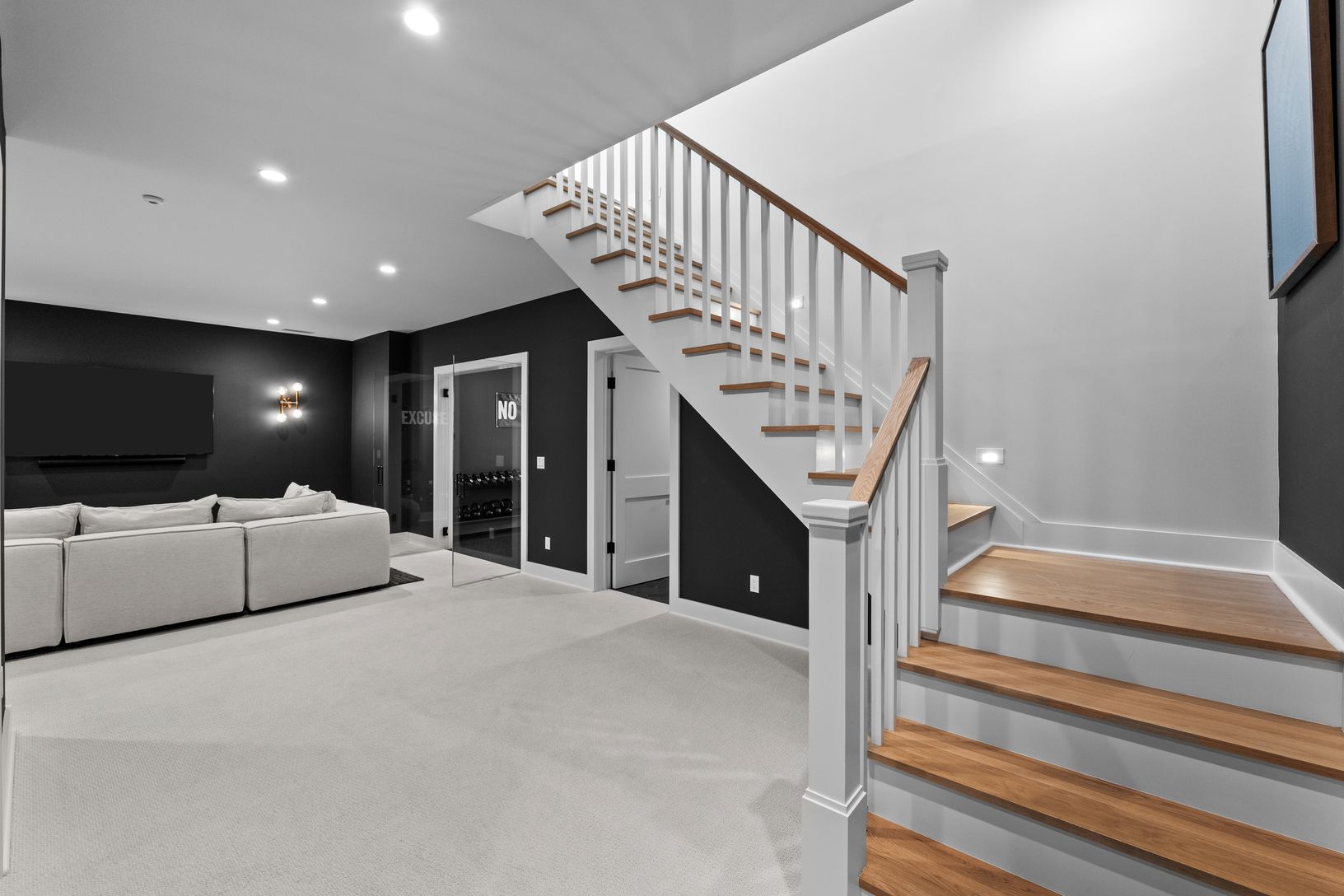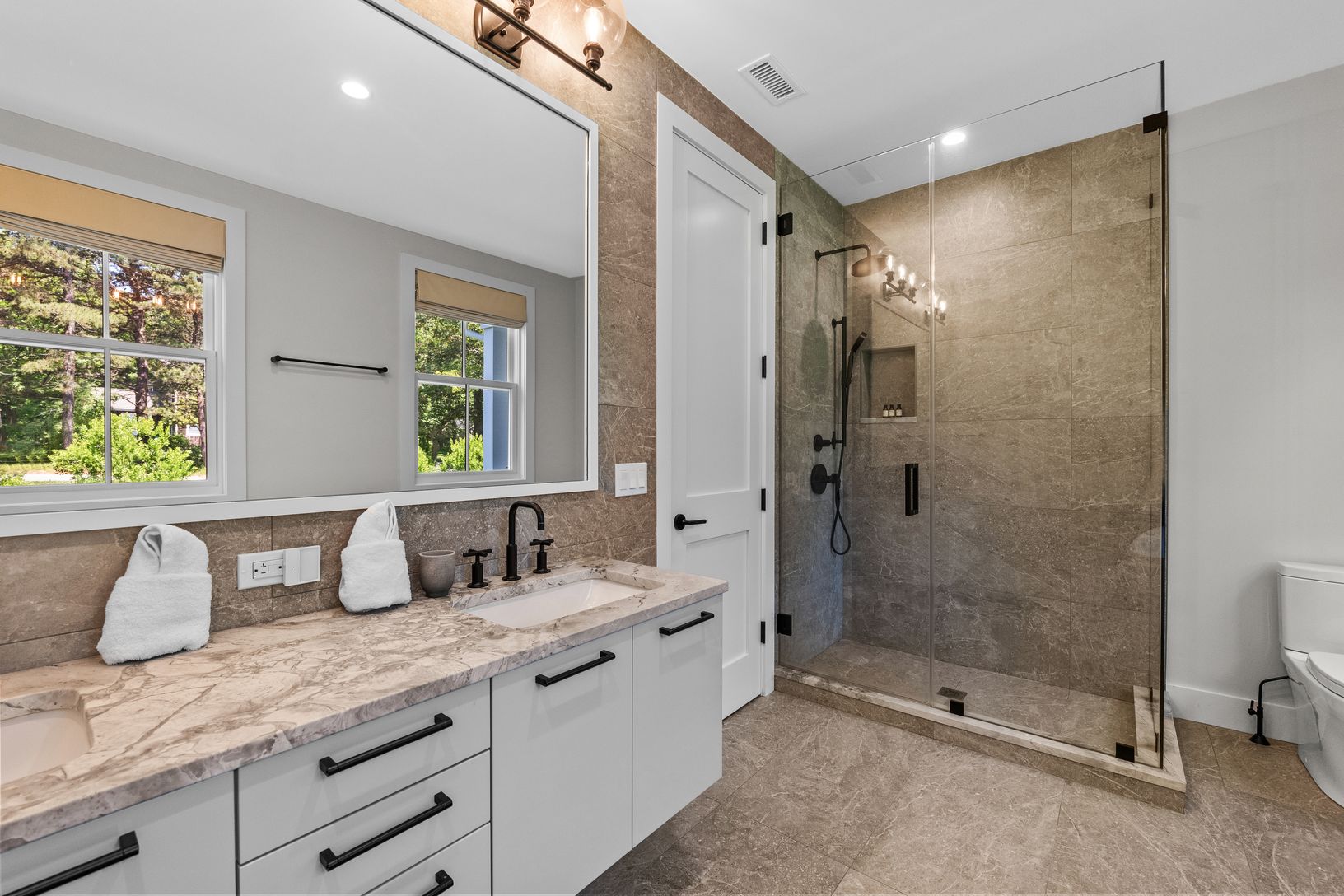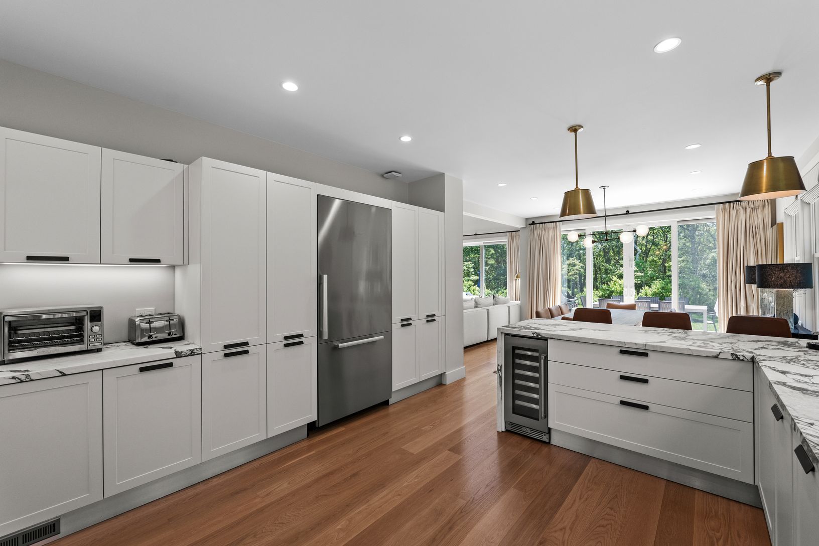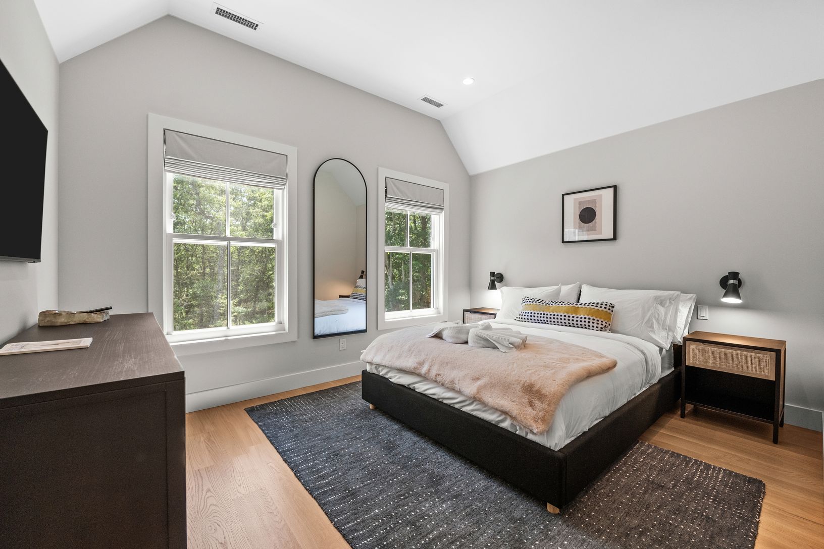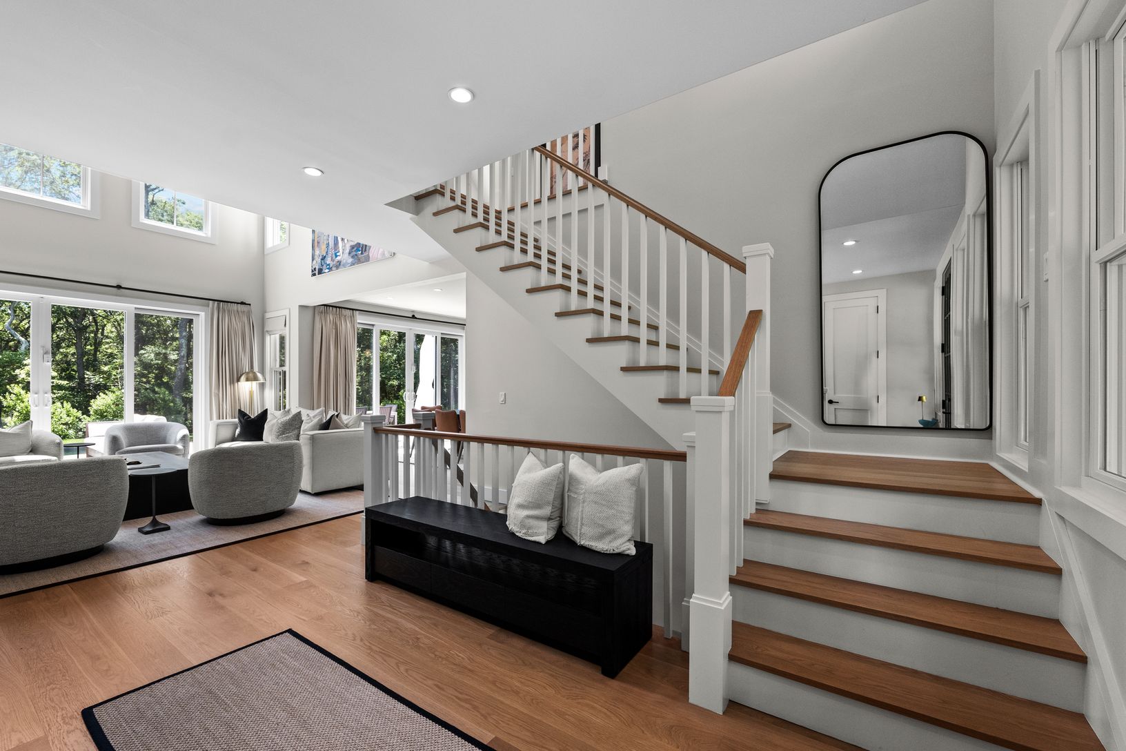 This 4,100 square foot, 7-bedroom, 5.5-bath house was completed in March 2023. The cathedral ceiling living room and open, light-filled layout create vibrant first-floor common spaces. The full-sized marble kitchen is equipped with top-of-the-line stainless steel appliances, including a Viking Range and microwave, a Miele fridge, a large dishwasher, and a 16-bottle wine cooler. The elegant first-floor primary bedroom opens onto a deck overlook
