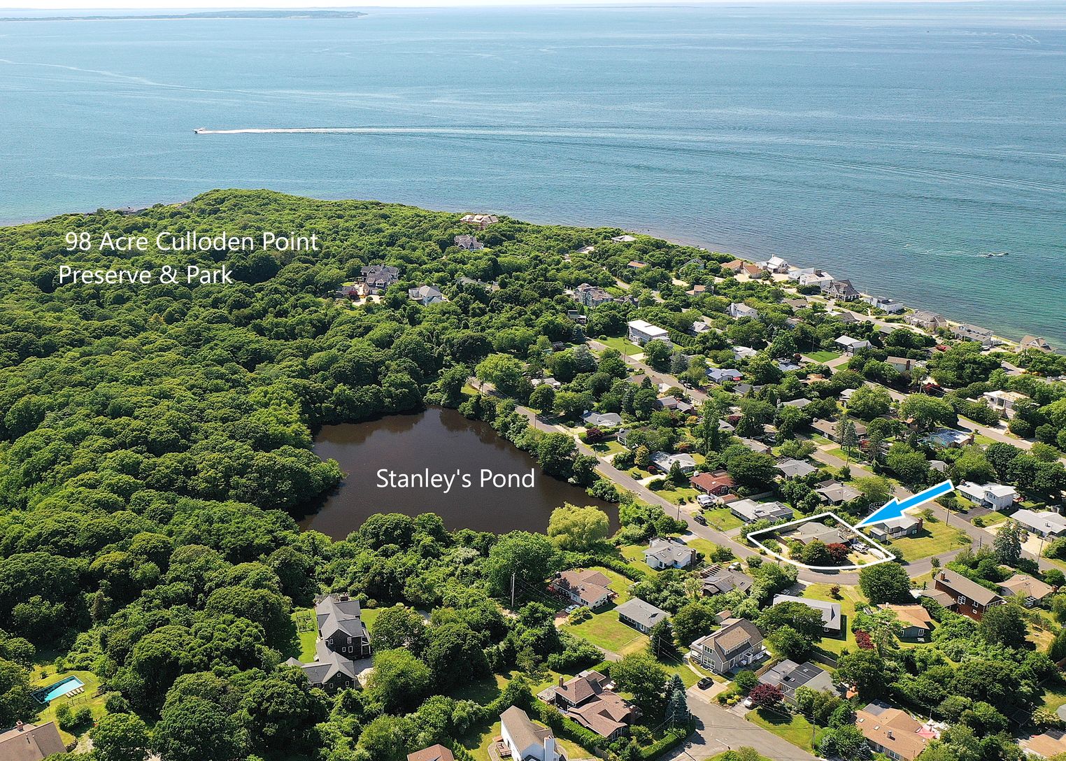 Summer leisure living awaits you in this Andrew Geller 1964 Macy’s iconic “Liesurama” beach side home situated on a corner parcel on a cul-de-sac street just moments (0.23 mile or 486 steps) to Culloden Shores private Bay Beach, a stone throw to "Stanley's" Pond and minutes to the 98-acre Culloden Point Park & Nature Preserve. The original designs of Raymond Loewy survive in this smartly expanded 1288 SF example offering 3 bedrooms, 2.5