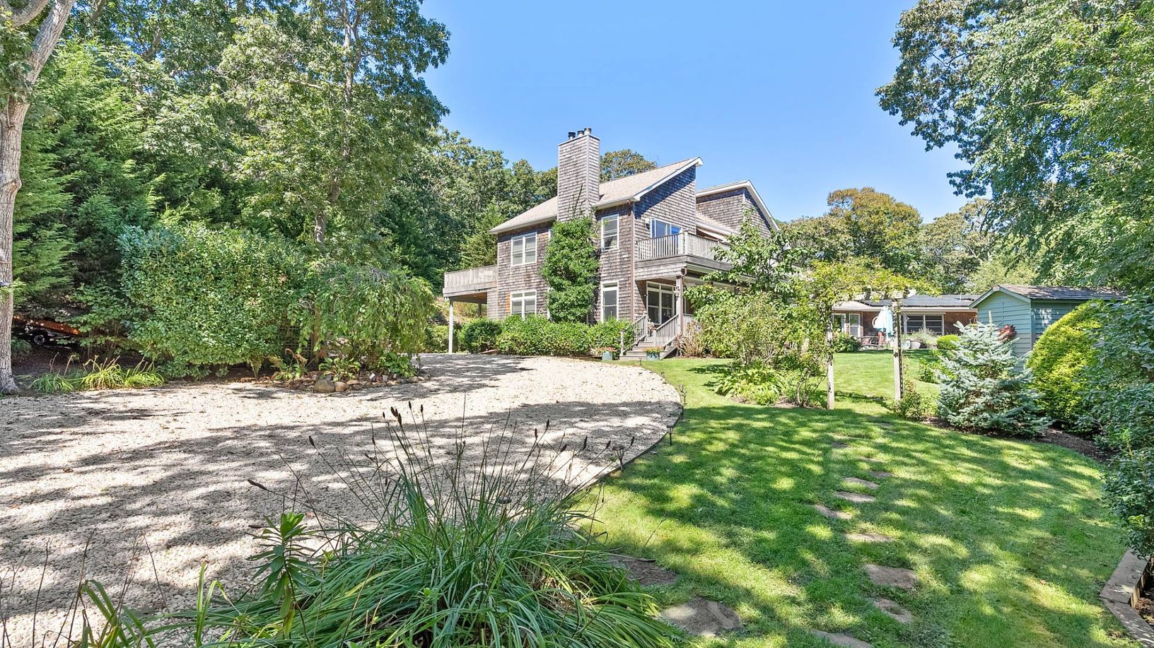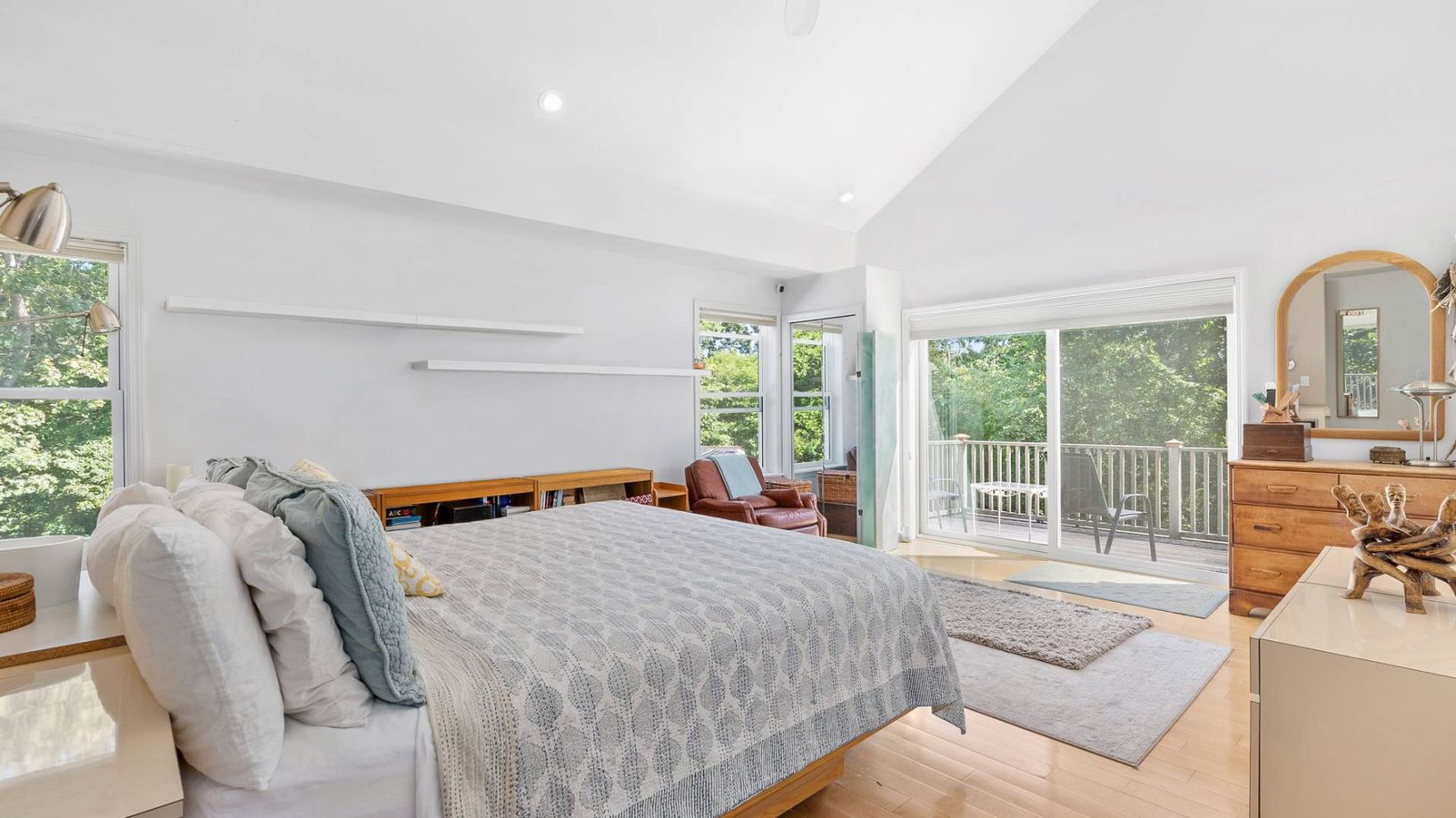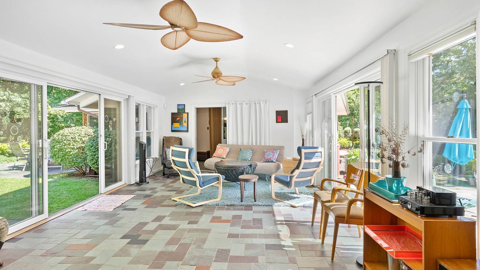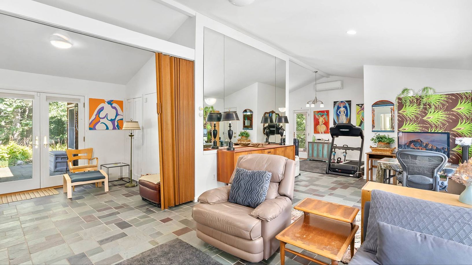 For those seeking an authentic Montauk hideaway, this artists' retreat is captivating. Boasting 1.2 acres a block from the ocean, the home features an original "Leisurama," which the owners lovingly preserved and attached to a newer home addition completed in 2008. Enter the home to a double height foyer, which leads to the large, open living room with fireplace. The well-equipped kitchen has stainless steel appliances, an induction cooktop, a