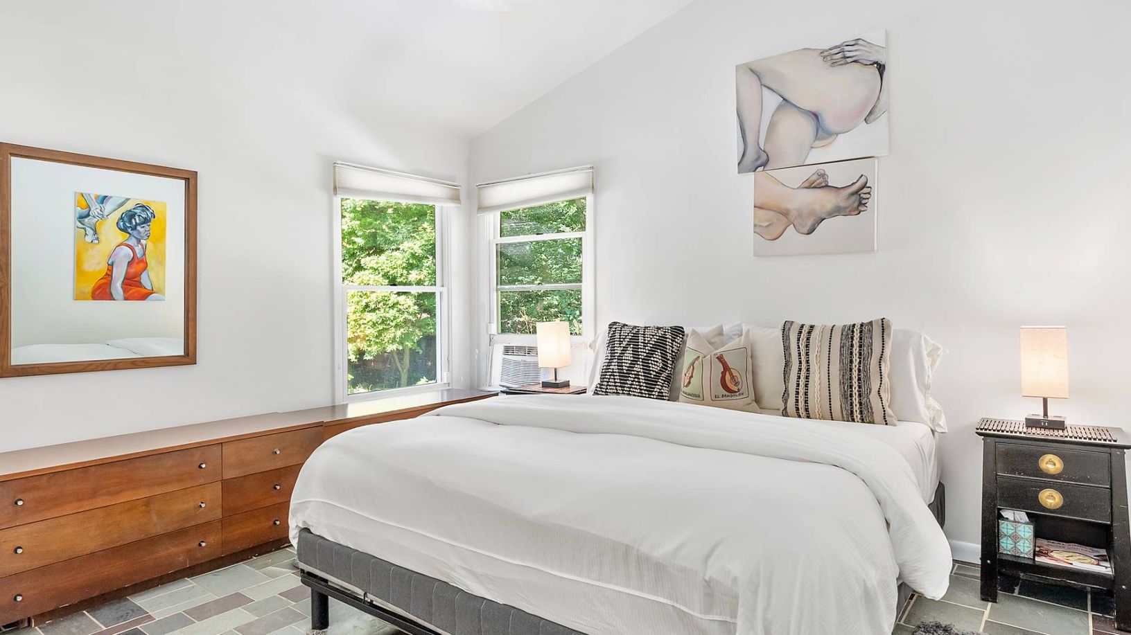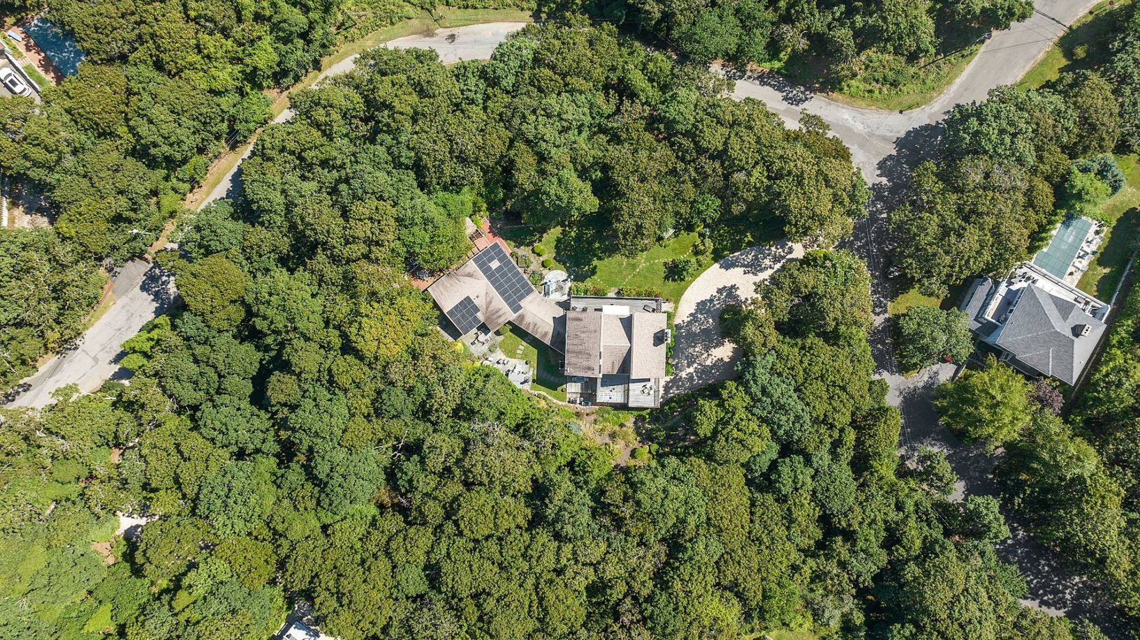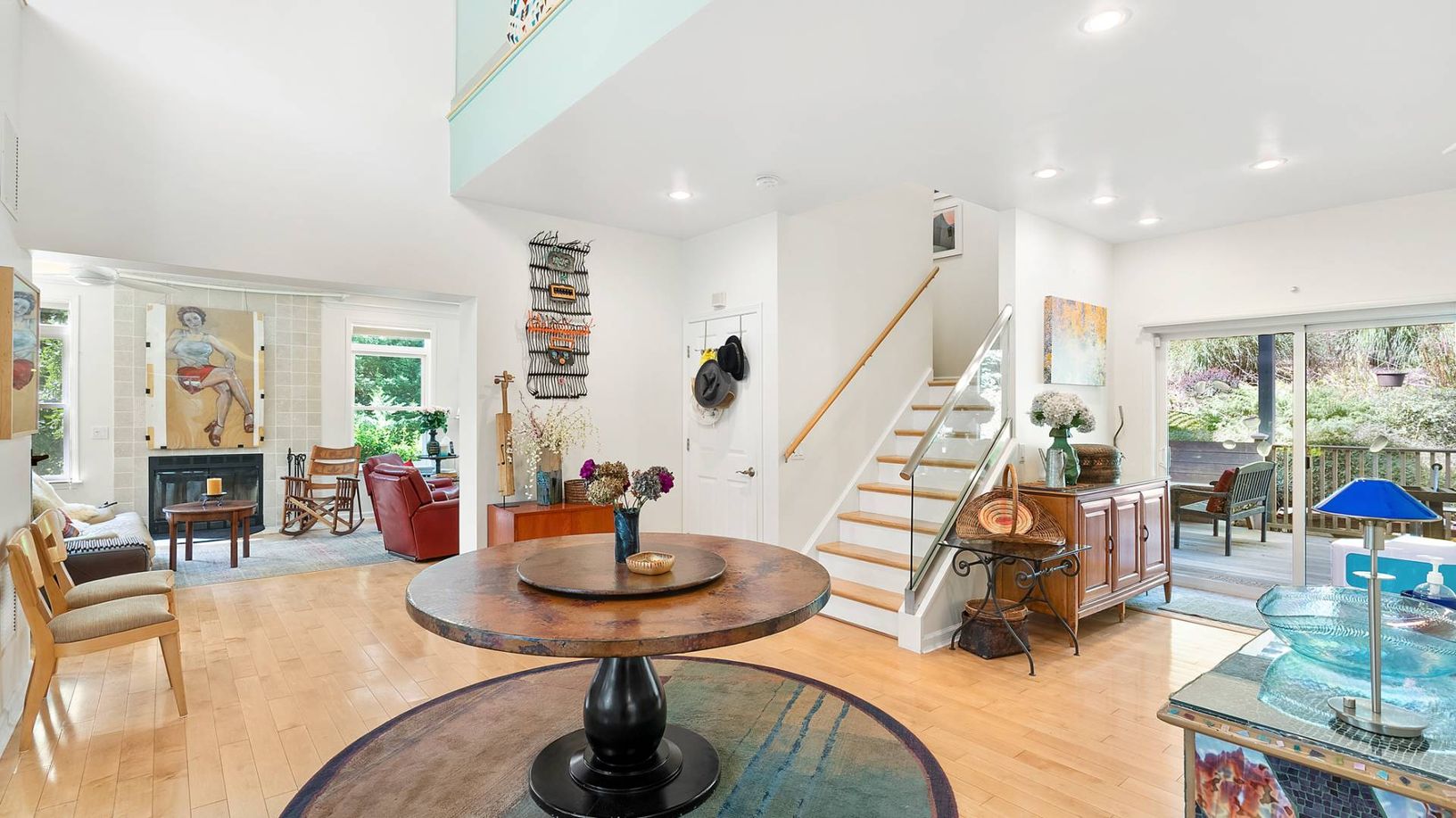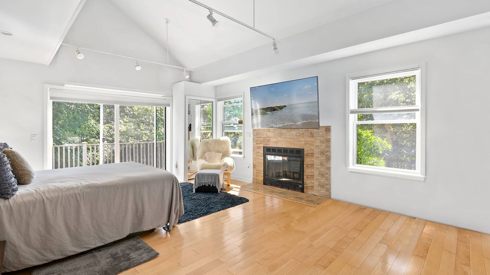 For those seeking an authentic Montauk hideaway, this artists' retreat is captivating. Boasting 1.2 acres a block from the ocean, the home features an original "Leisurama," which the owners lovingly preserved and attached to a newer home addition completed in 2008. Enter the home to a double height foyer, which leads to the large, open living room with fireplace. The well-equipped kitchen has stainless steel appliances, an induction cooktop, a