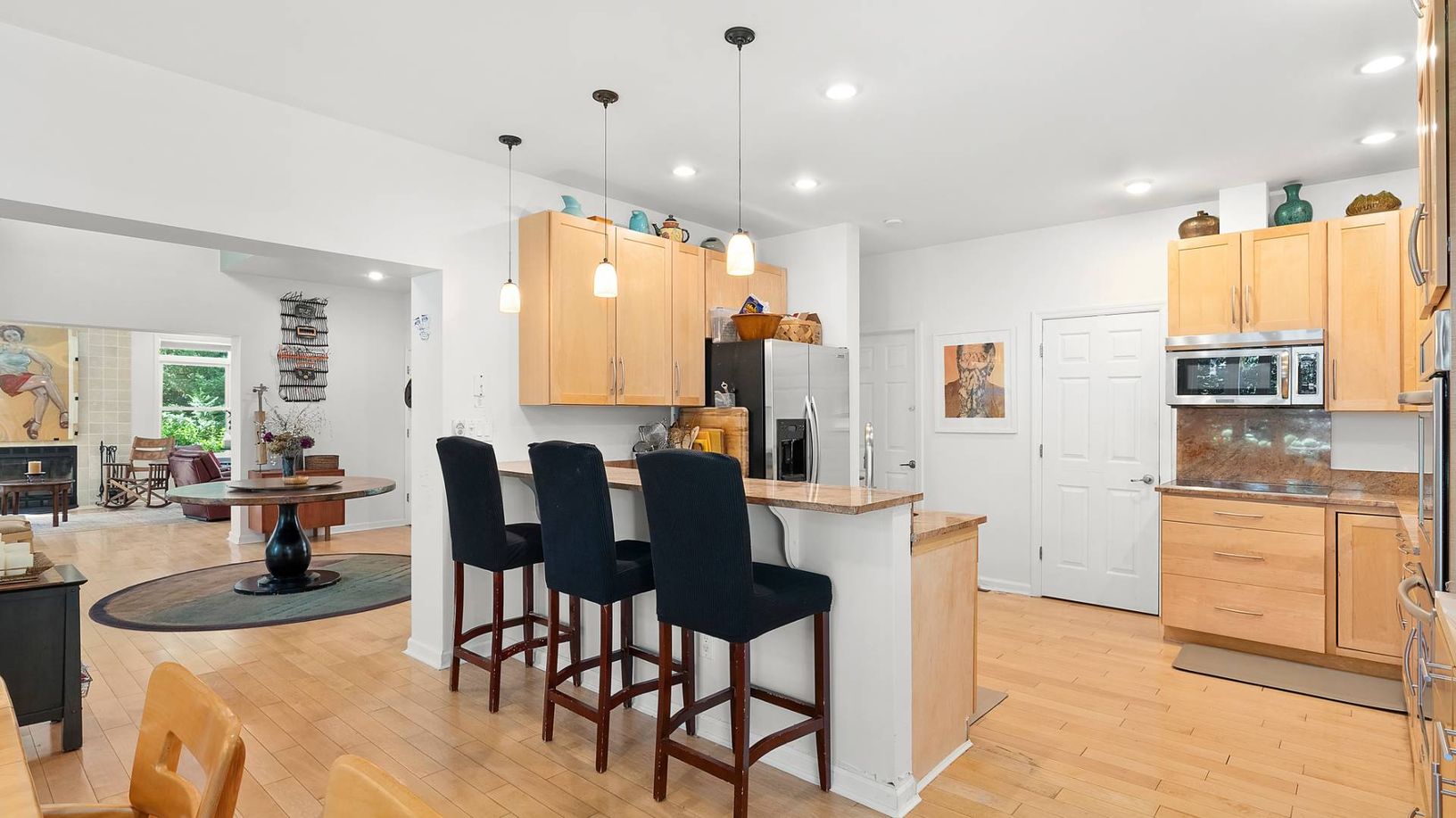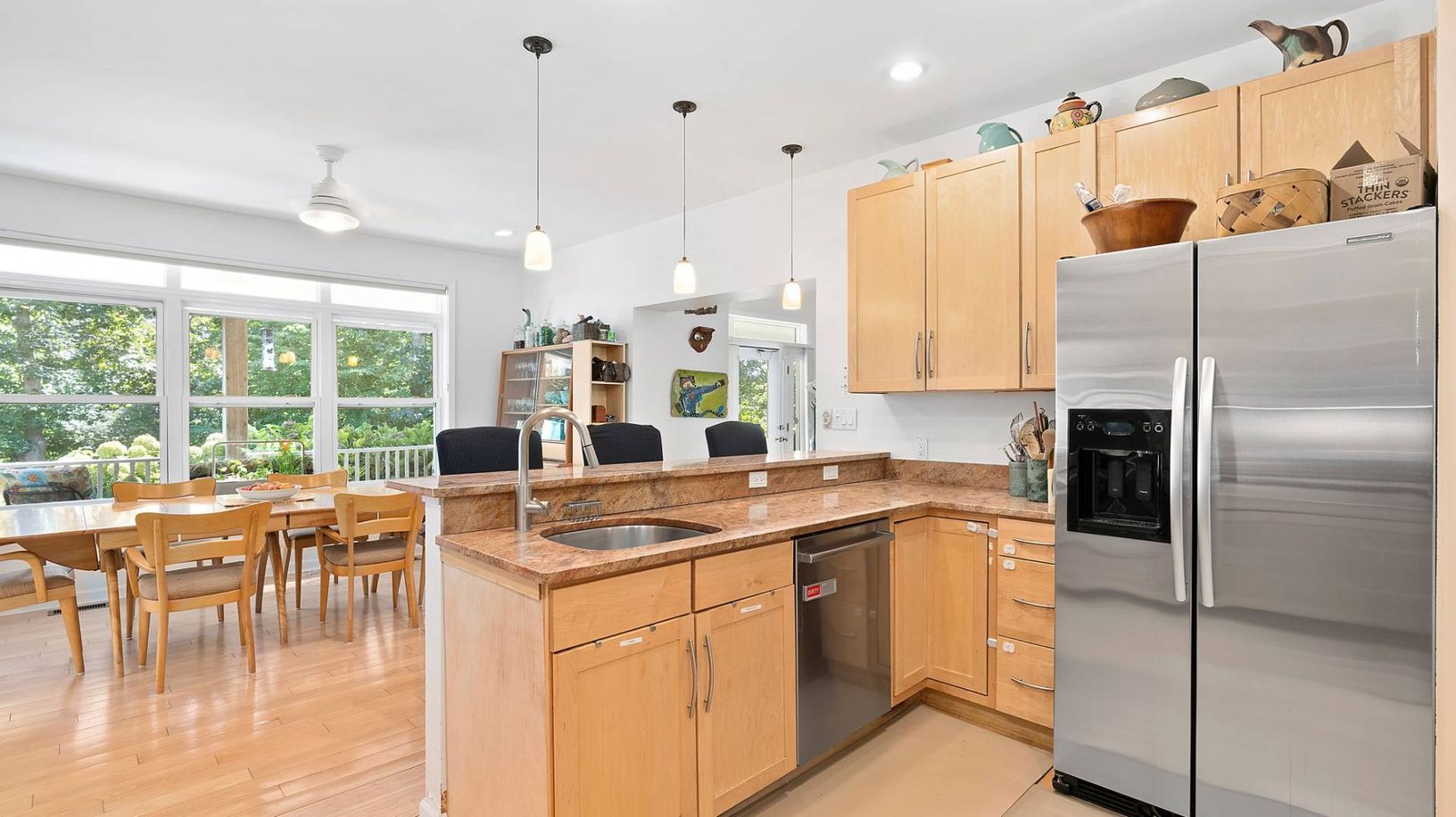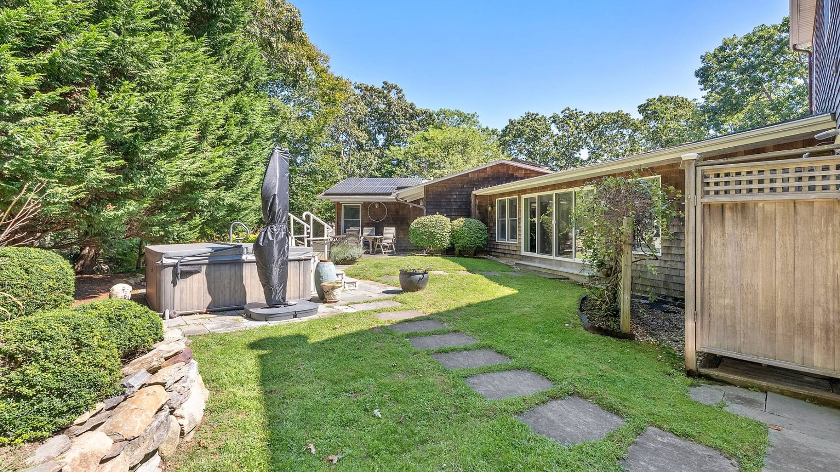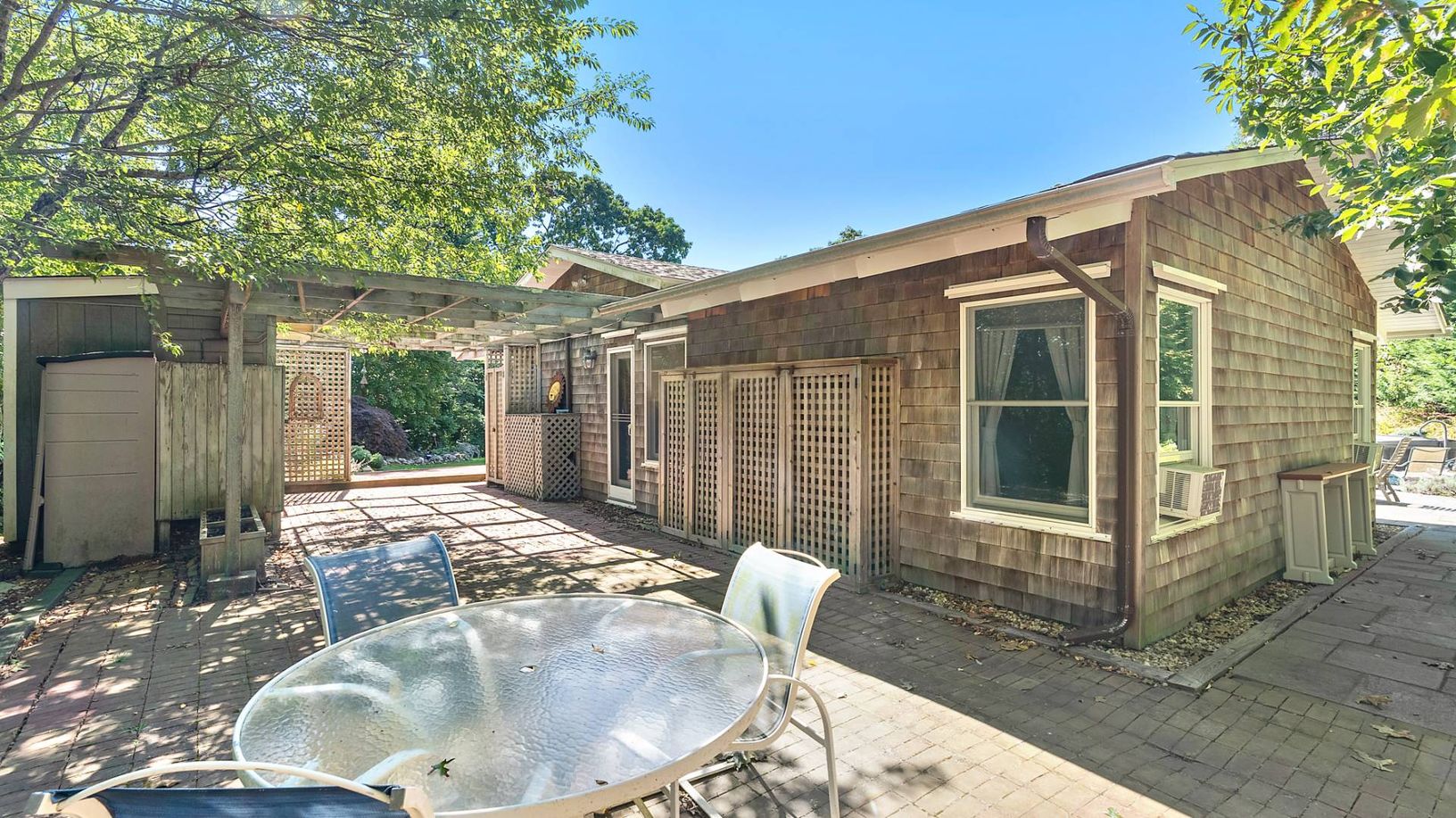 For those seeking an authentic Montauk hideaway, this artists' retreat is captivating. Boasting 1.2 acres a block from the ocean, the home features an original "Leisurama," which the owners lovingly preserved and attached to a newer home addition completed in 2008. Enter the home to a double height foyer, which leads to the large, open living room with fireplace. The well-equipped kitchen has stainless steel appliances, an induction cooktop, a