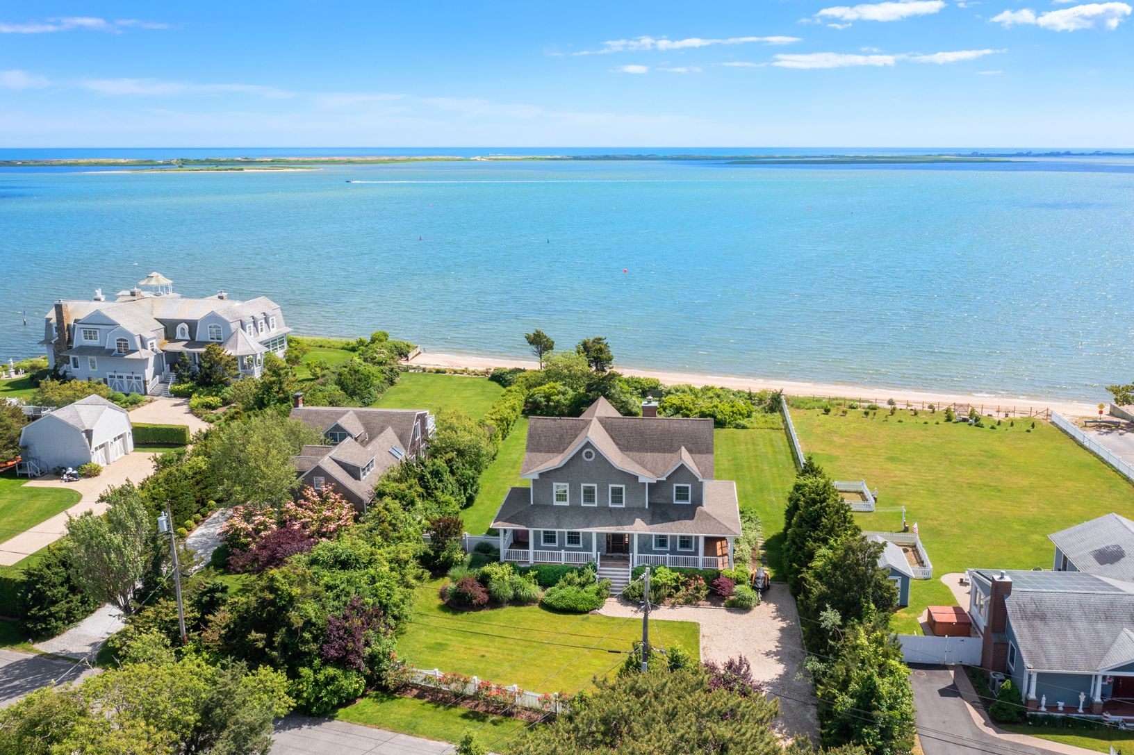 This stunning waterfront property offers open water views of Shinnecock Bay and sits on a generous 3/4 acre lot, featuring a sprawling backyard with a path leading to a private beach, perfect for swimming, kayaking, paddle boarding, or mooring your boat or jet ski. With room for a pool, a gated driveway and located just minutes from the ocean, this traditional Hamptons-style residence combines luxury and tranquility. The home includes 5 bedroo