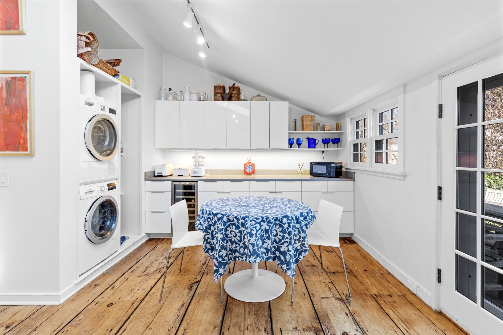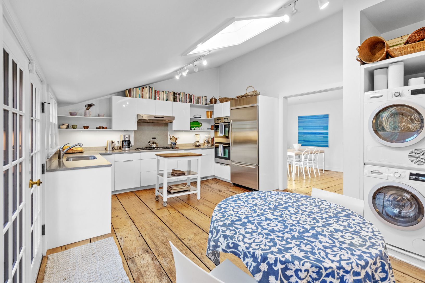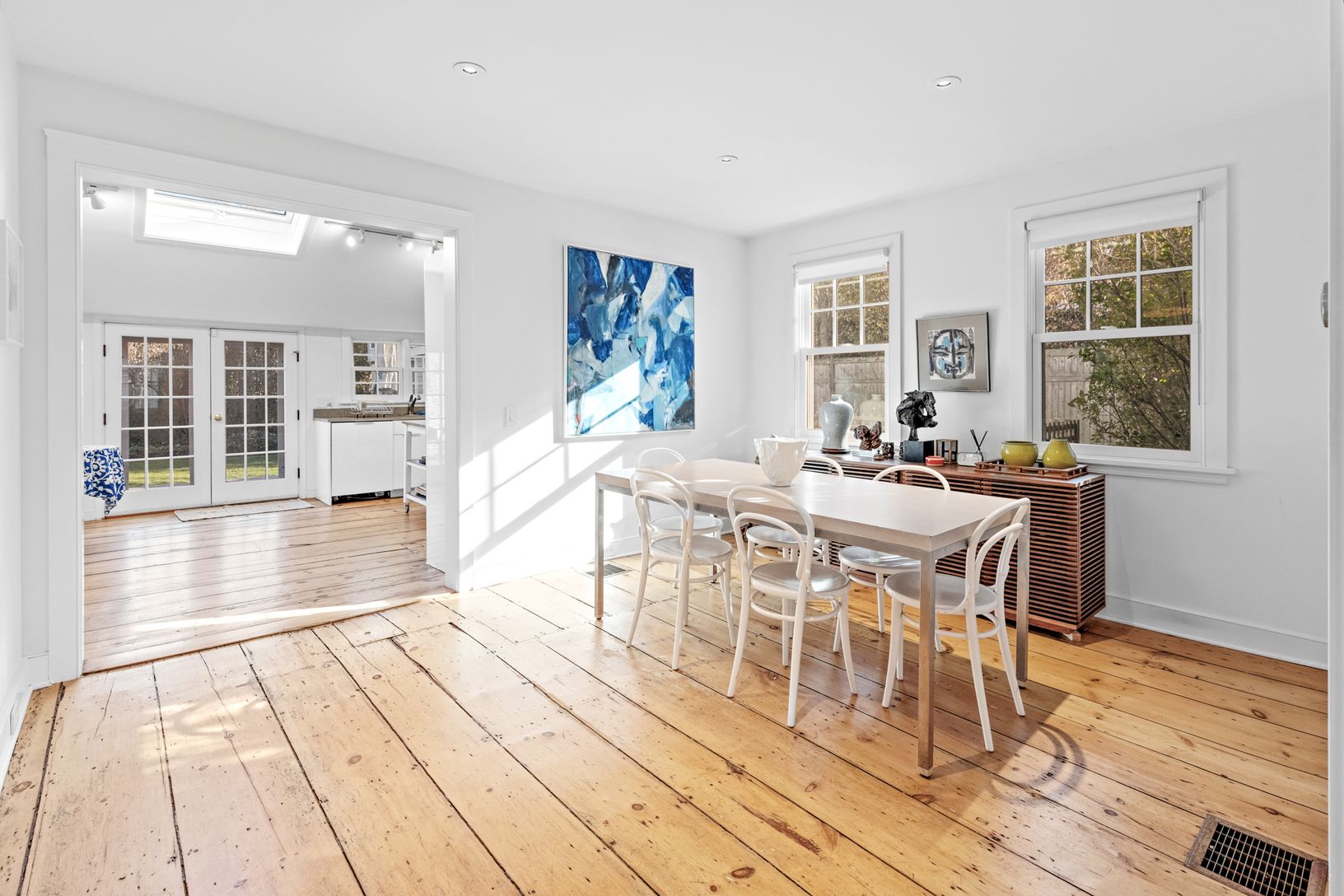 Charming 3-bedroom, 2-bath home in the heart of Sag Harbor Village. The first floor offers a living room, dining room, kitchen with washer/dryer, and a den with pocket doors and a pull-out couch that doubles as a third en-suite guest bedroom. Upstairs are two bedrooms sharing a full bath. Enjoy outdoor dining on the deck with BBQ. The art studio in the rear is for storage only and not available for use