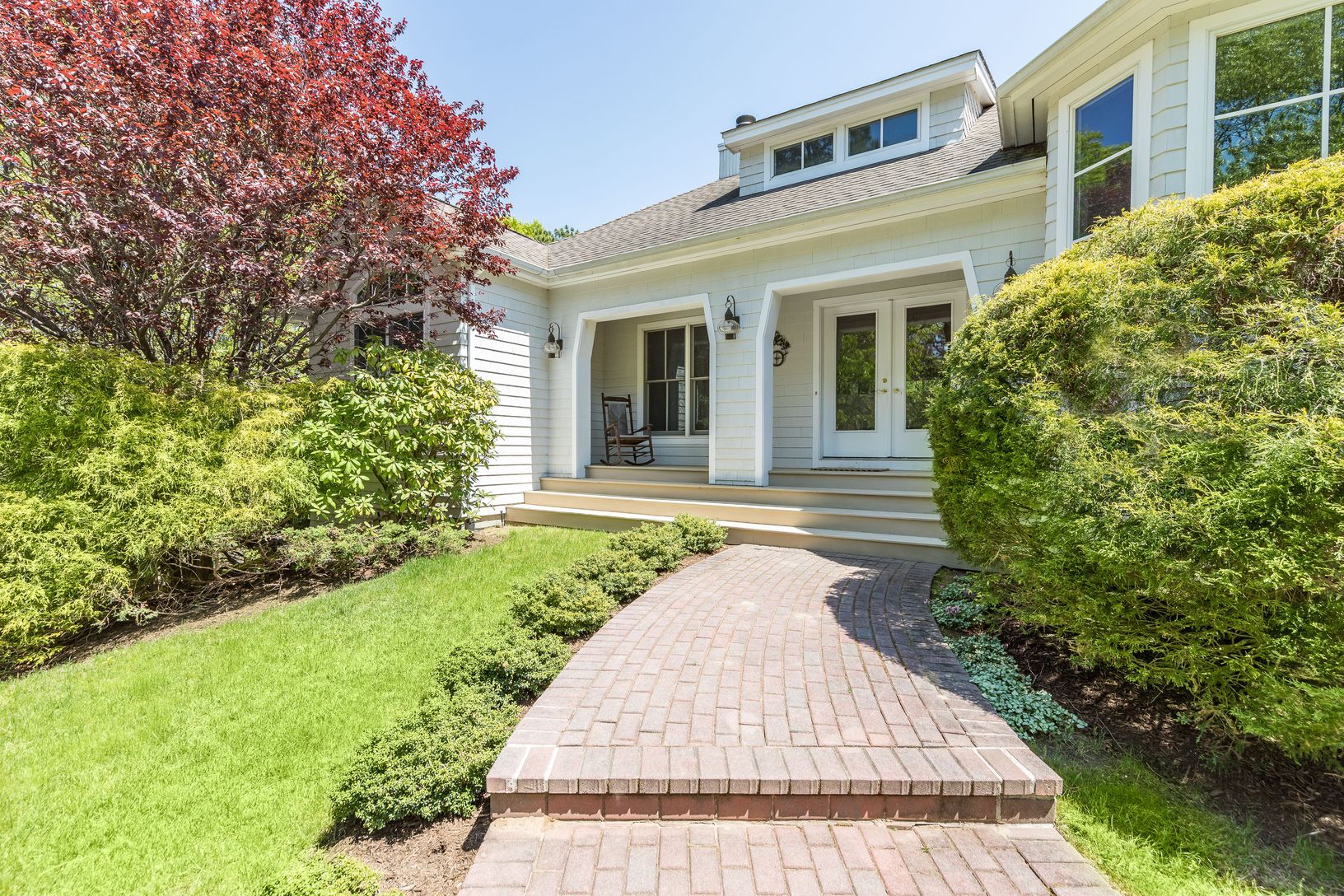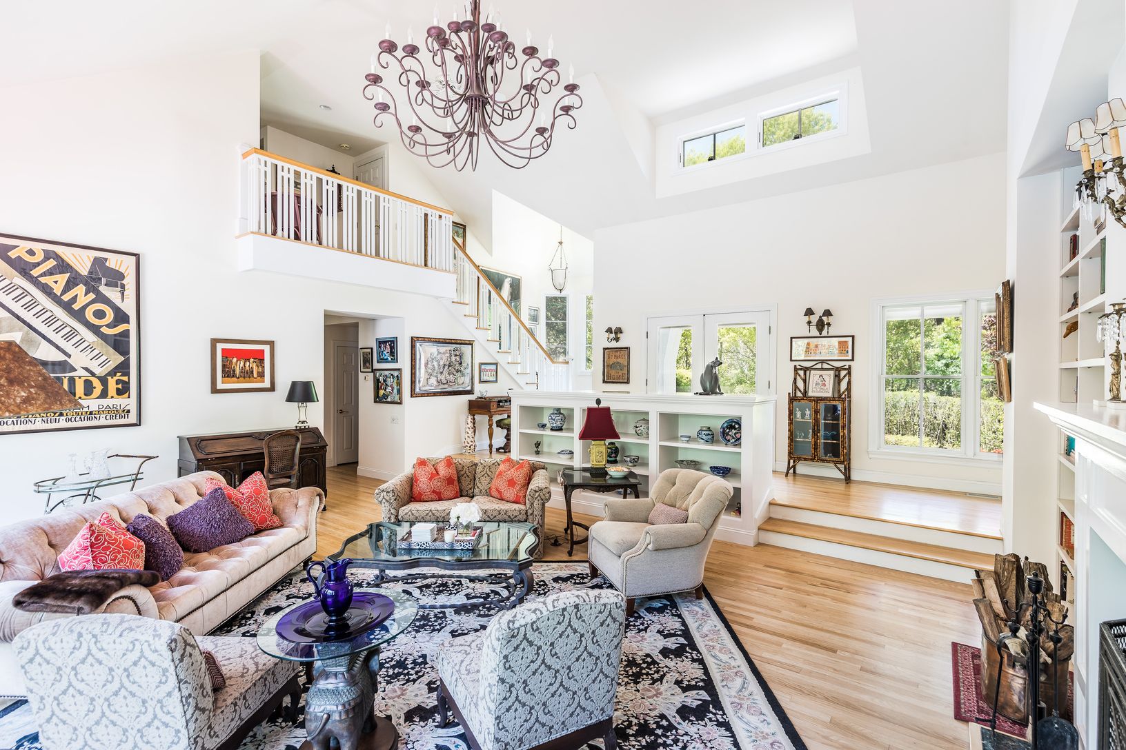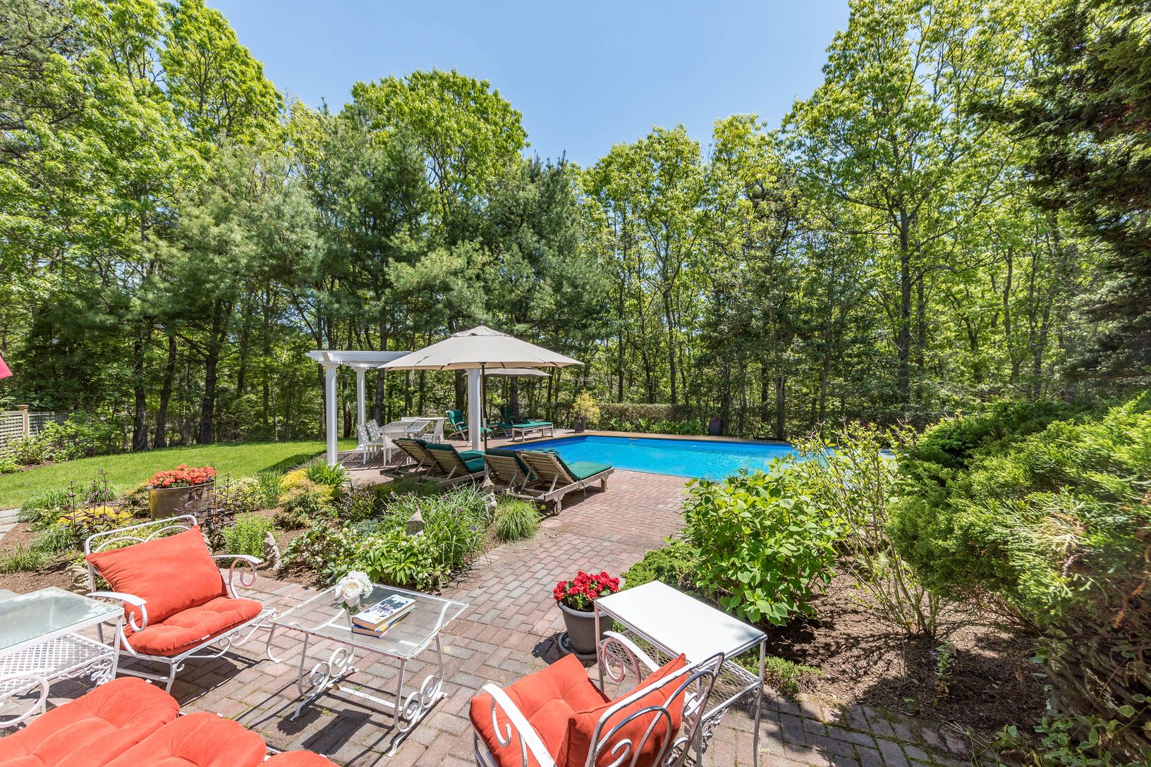 A spacious, bright, multi-level East Hampton cedar-shingled postmodern home awaits. With a contemporary flair this 4 bedrooms, 41/2 bathroom home is situated on a private 1.67 acres. Located on a quiet cul-de-sac 2 miles from East Hampton Village. Arrive through a gated entrance to a circular driveway. The main entrance leads to an open family/great room with a wood-burning fireplace overlooking the pool and brick patio area. Located on the fi
