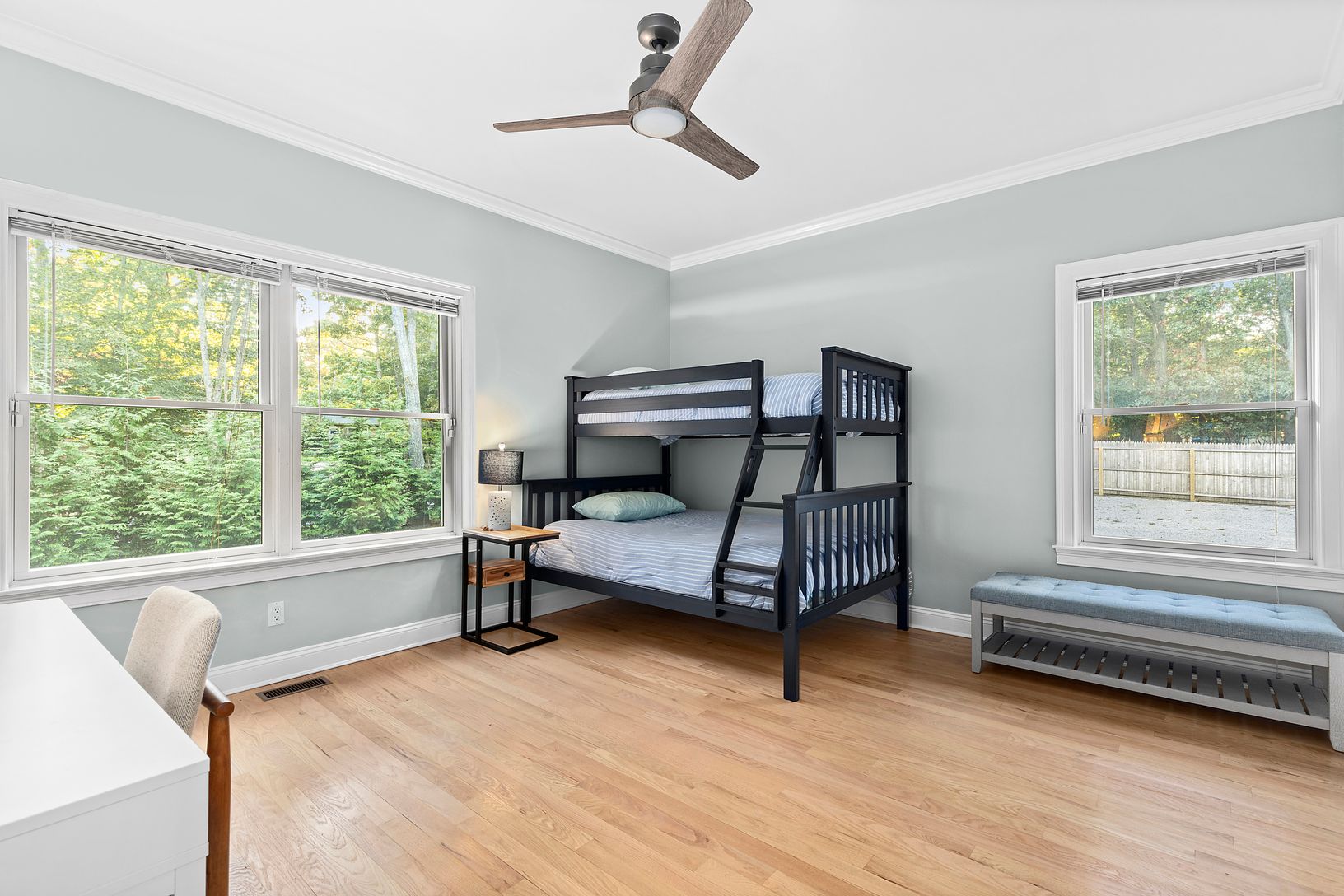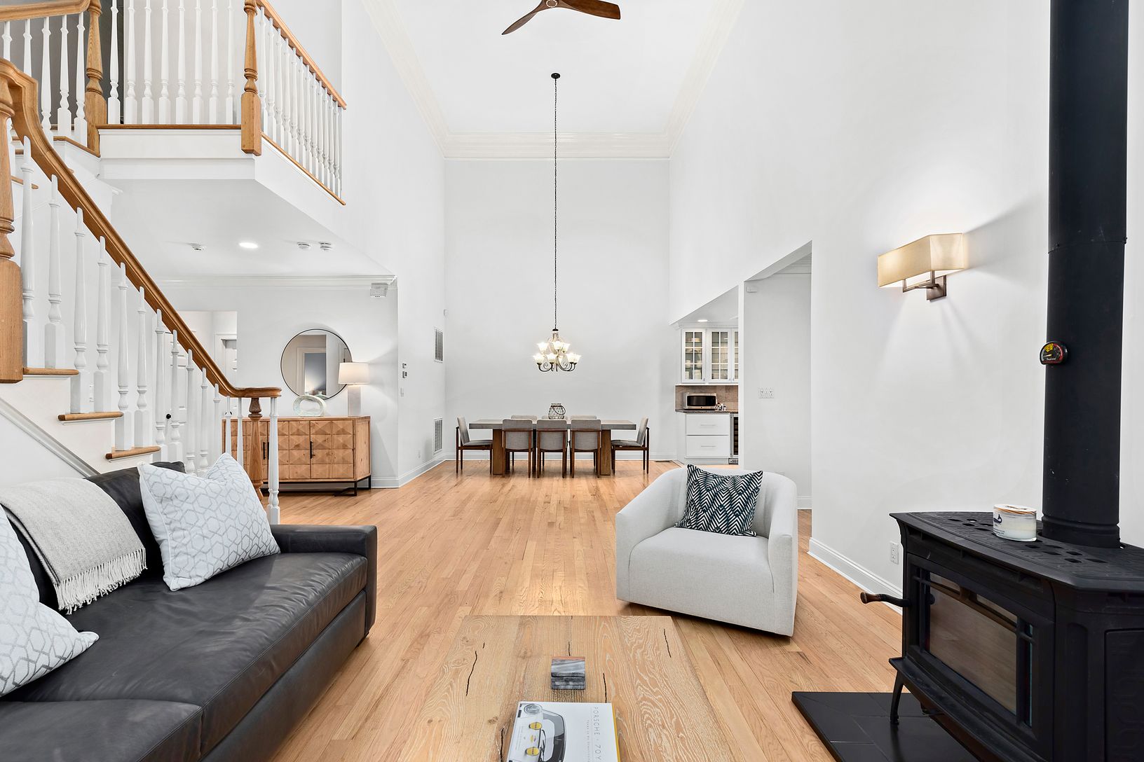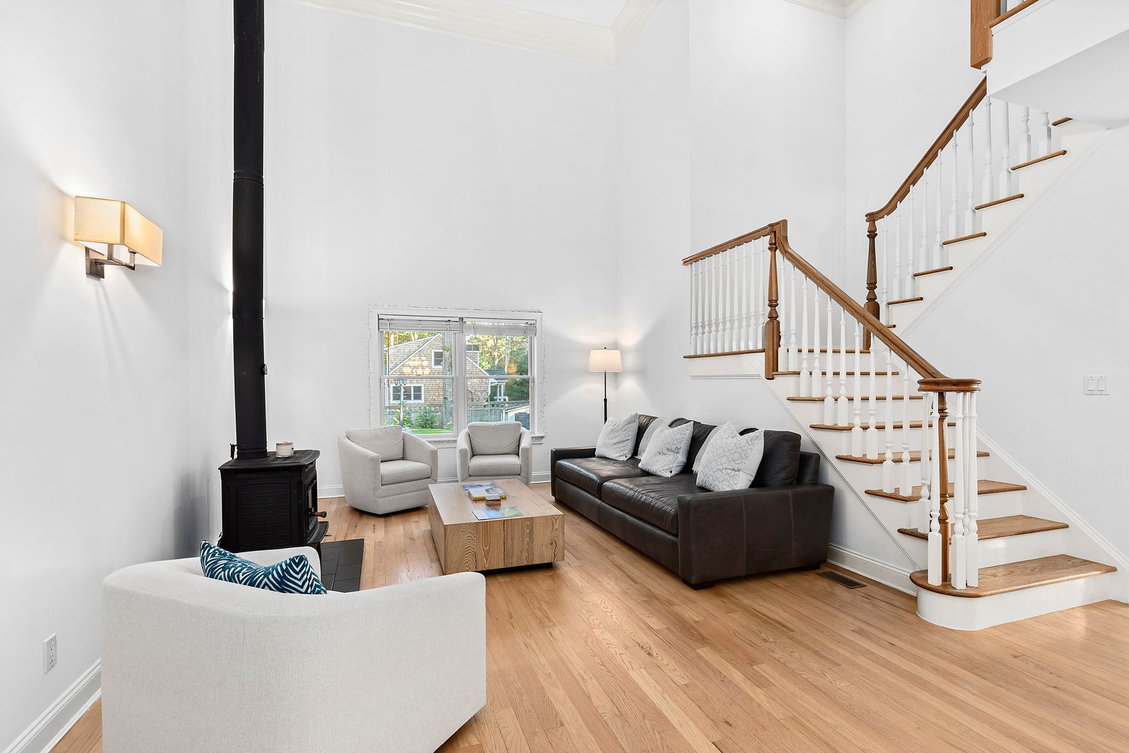 This turn-key Post-Modern sits on a quiet street in Springs just minutes to East Hampton Village and Ocean Beaches. The first floor features an open layout with soaring cathedral ceilings in the main living space and dining room, a chef's kitchen with all stainless-steel appliances and cozy den with sliding glass doors leading to the private back porch area. All four bedrooms are en-suite and exceptionally spacious allowing you the choice of y