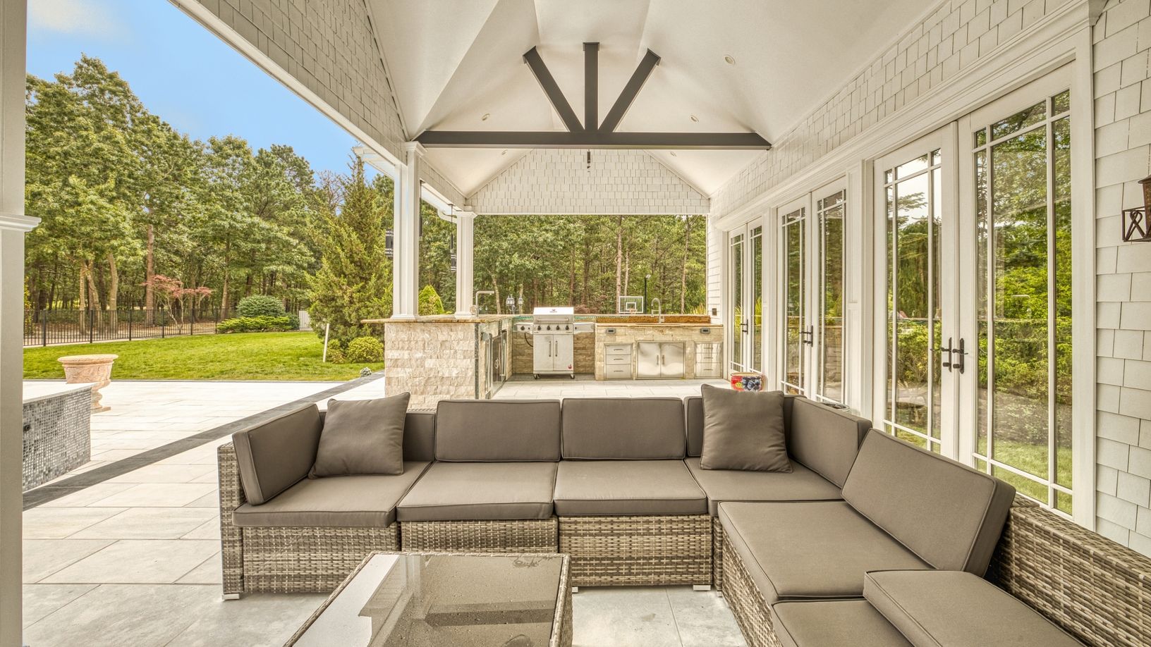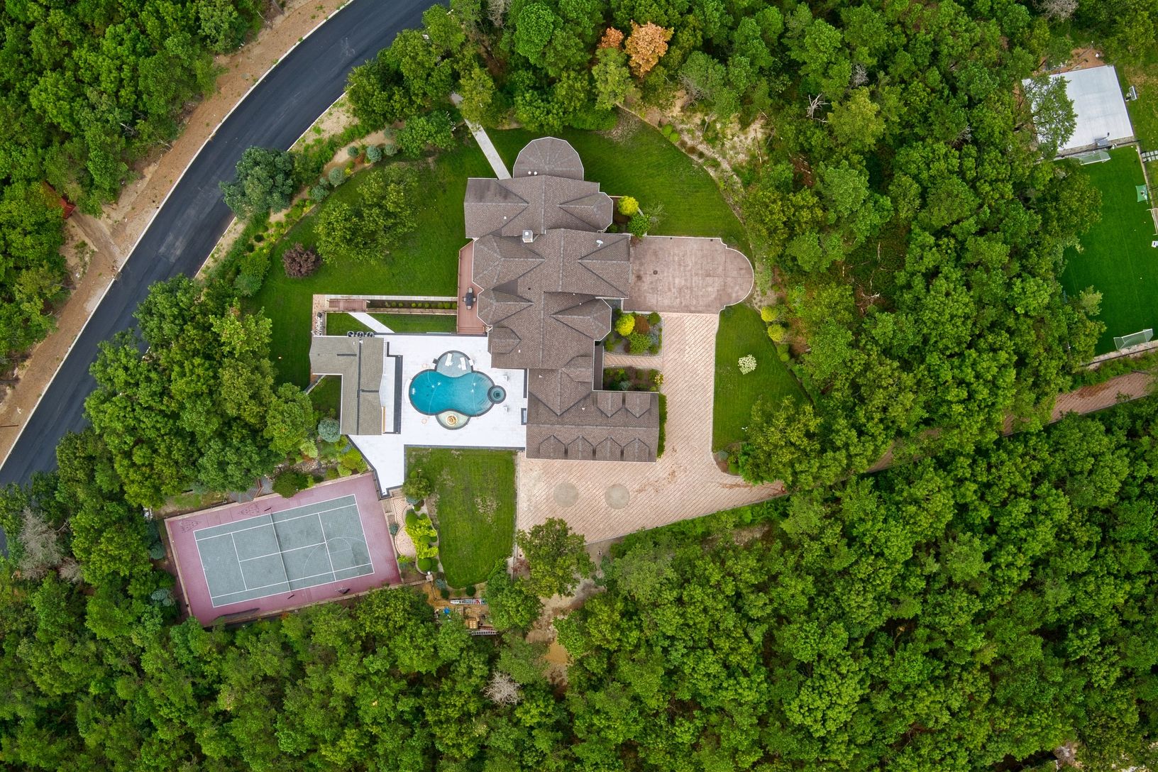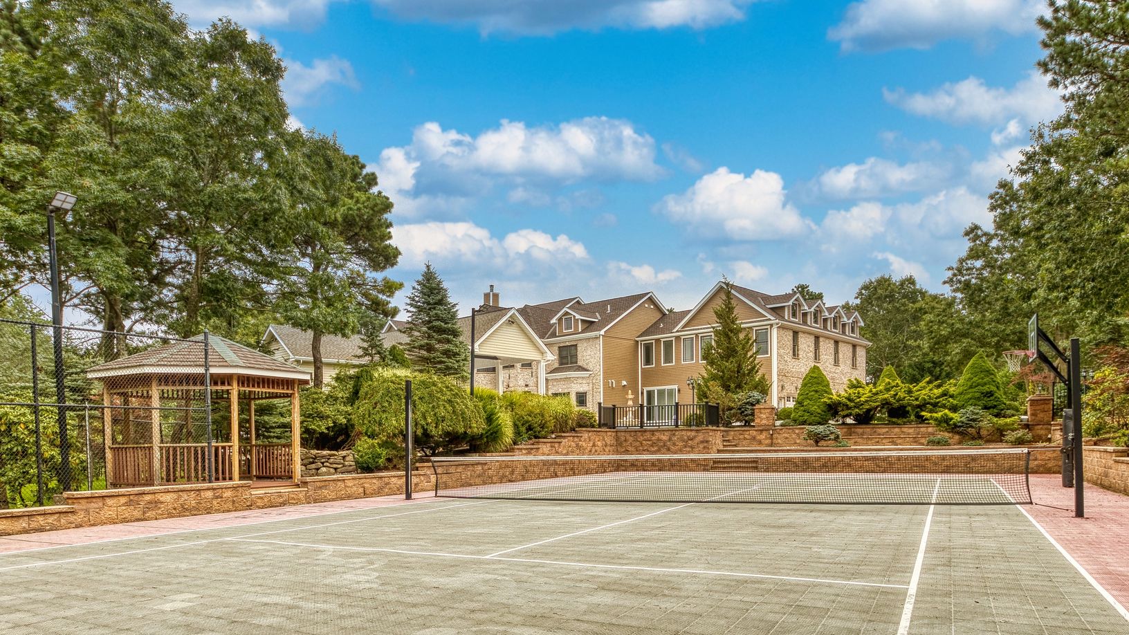 Welcome to this one of a kind 2023 fully renovated palatial Estate just minutes from the Hamptons. Privately set into 1.9 Acres of manicured Lighted Landscape designed for Sporting, Entertainment and Lifestyle. Received by 1/8 Mile Hardscaped Private Driveway with Dual Auto courts and 4 car finished Garage. Highest level of exterior upgraded finishing and Architectural design. Enter into Formal Foyer with Twin Bridal Staircase, Dual Retractabl