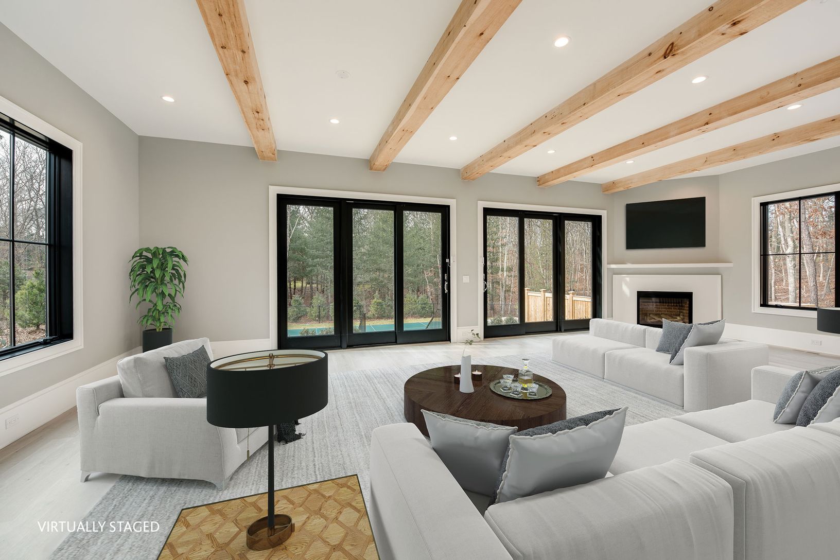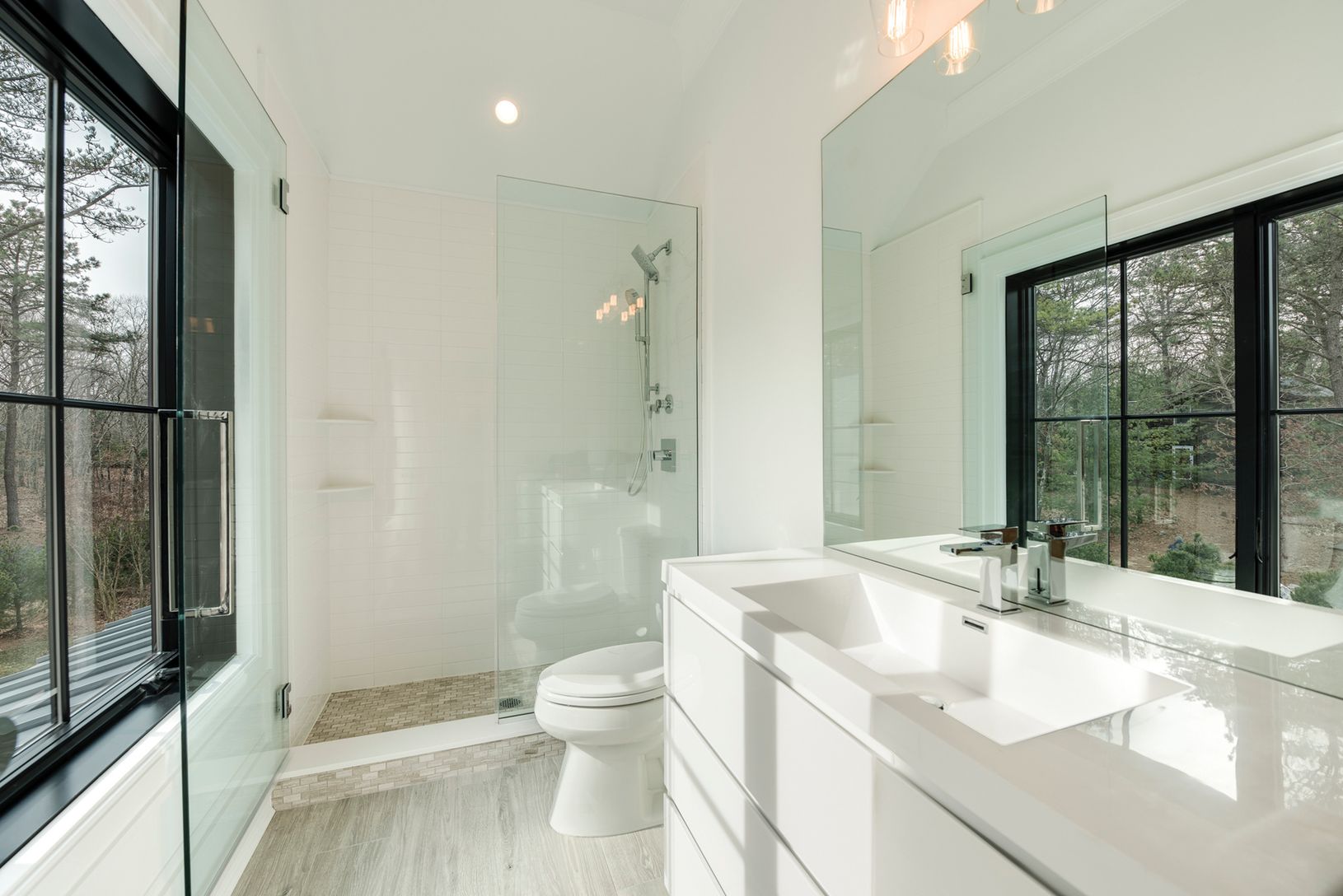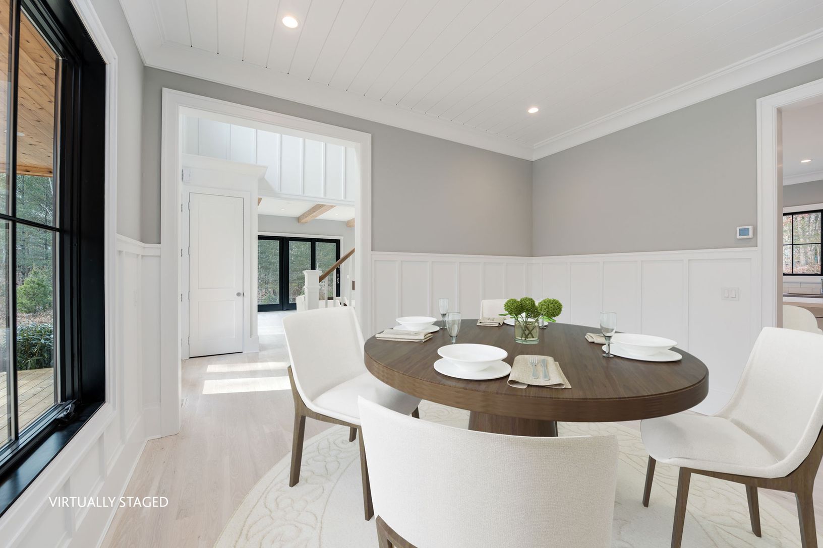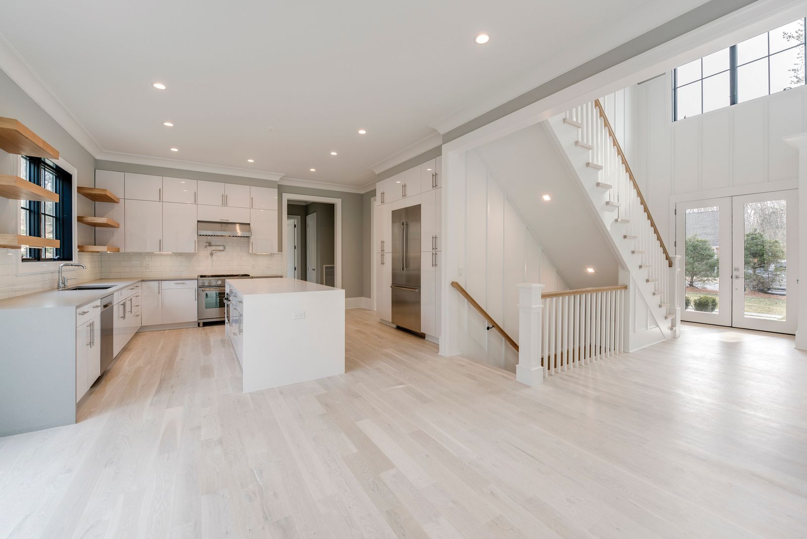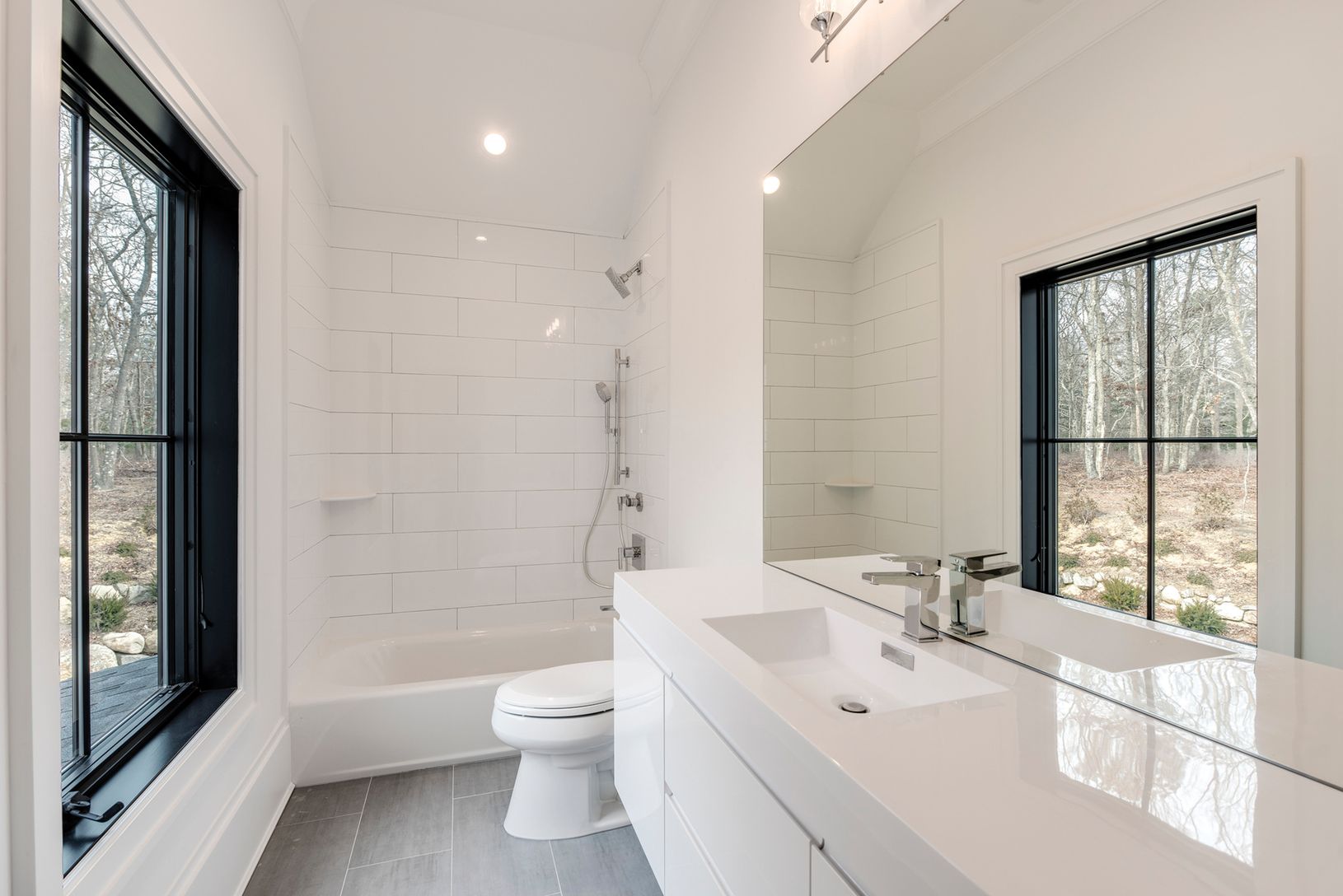 Discover an artfully crafted brand new construction modern barn-style home on a cul-de-sac in the East Hampton Village Fringe by one of the Hamptons' premier builders, Paul Porco. The 3,500+/- sq. ft. home offers five pristine en-suite bedrooms. Enter from the front porch to a double-height entry leading to light-filled open interiors featuring custom white wainscoting on walls and beautiful 5" pickled white oak flooring throughout, with expos