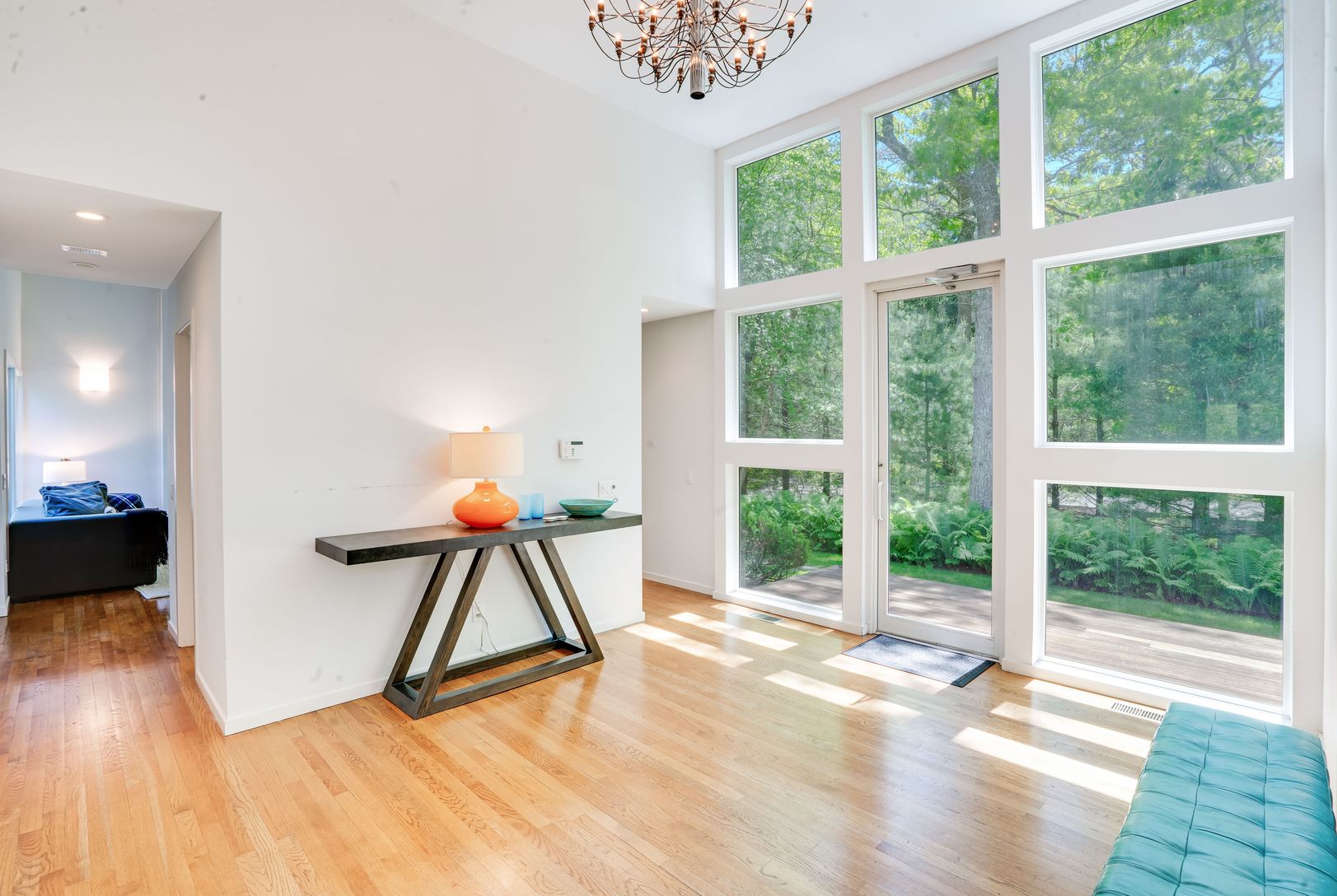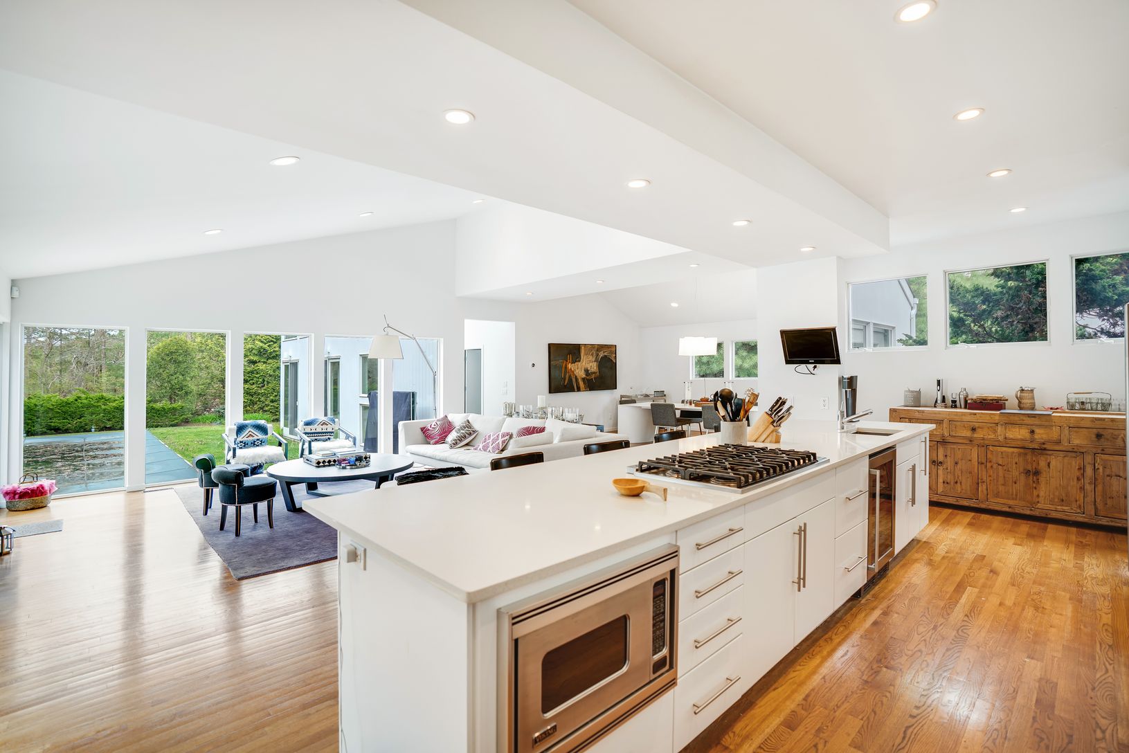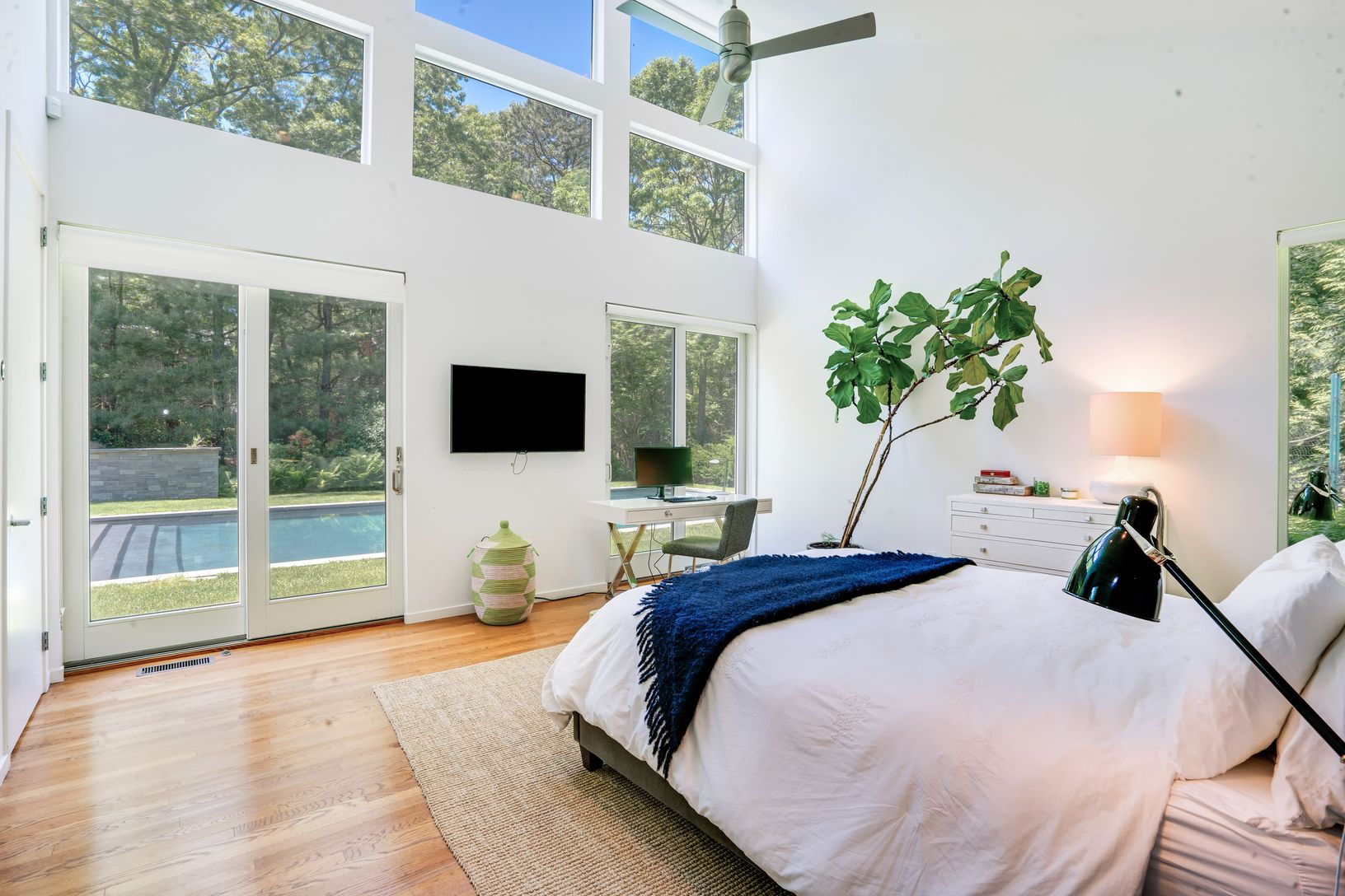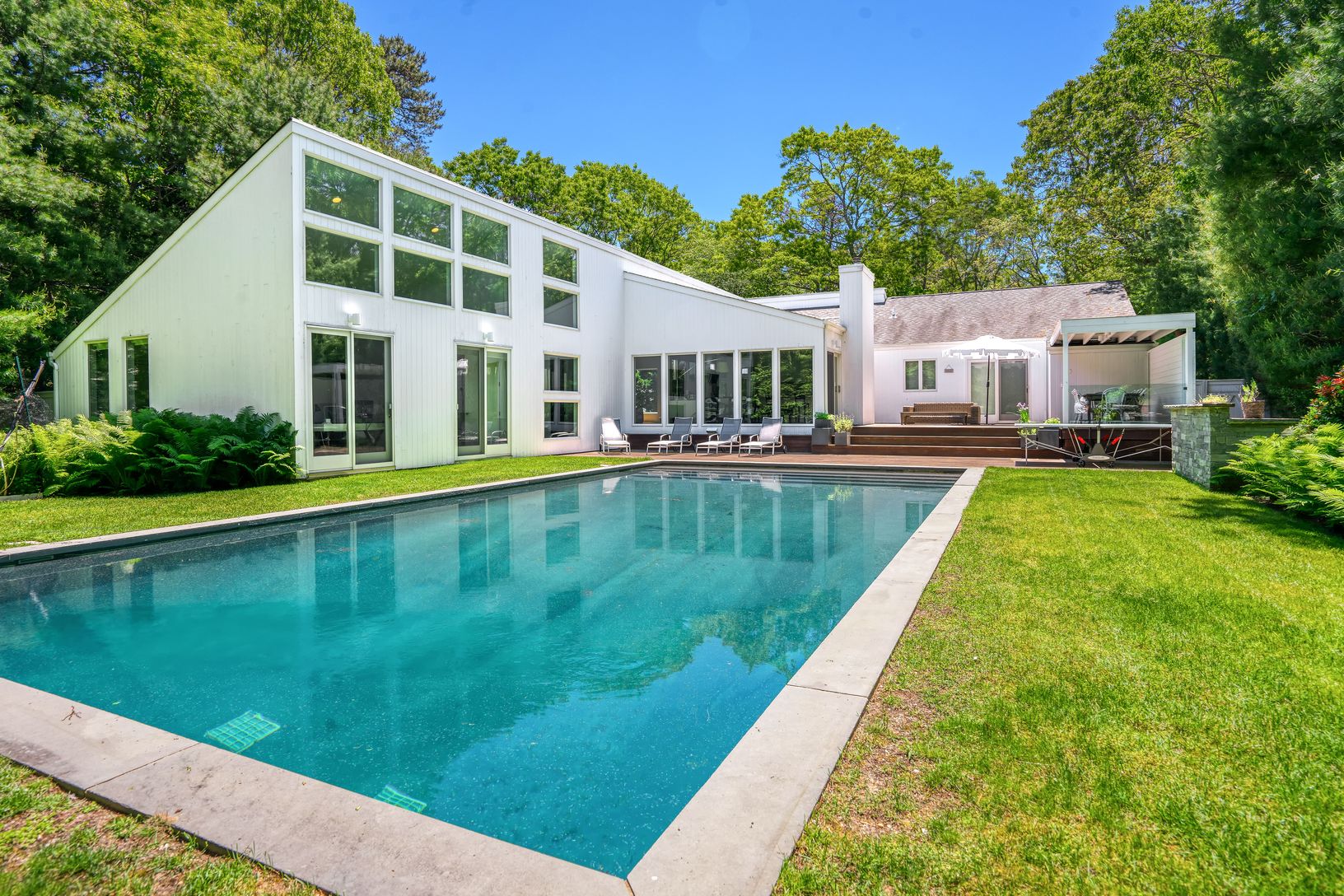 This architect-designed one-level modern home seamlessly integrates indoor and outdoor spaces, boasting soaring ceilings and glass walls that frame the wooded setting. A 40 ft. heated gunite pool, ensconced in lush landscaping, offers panoramic views from every room. The open layout features a sleek cook's kitchen with Viking Double Oven, Sub Zero, Fisher Paykel appliances, two prep sinks, two refrigerators, a walk-in pantry, and a 15 ft. quar