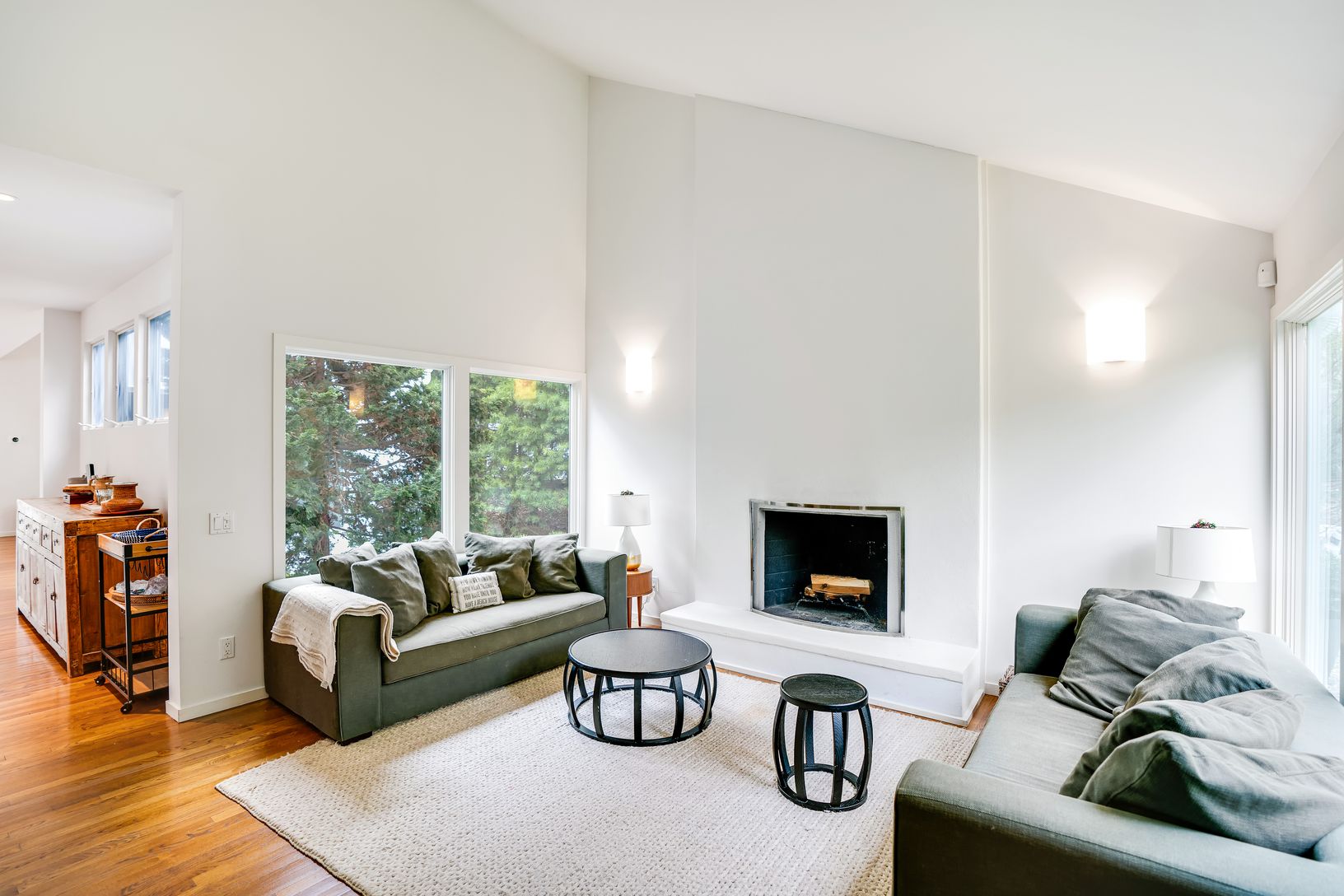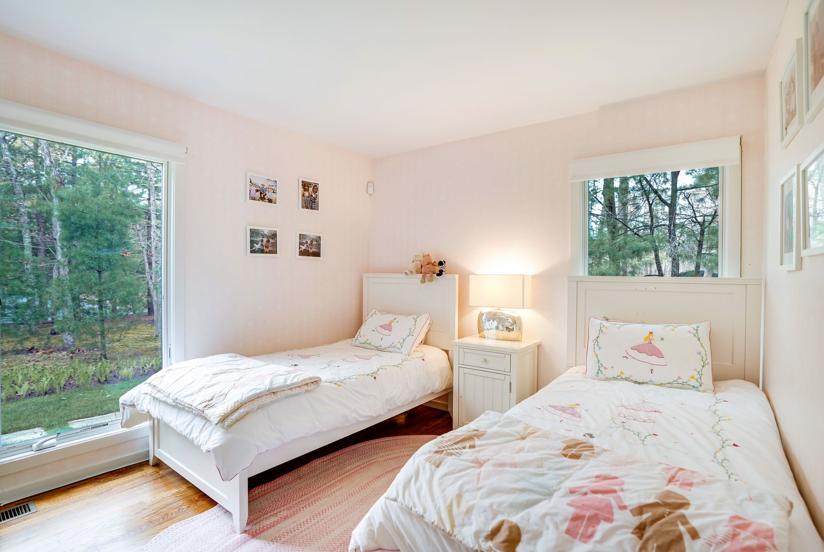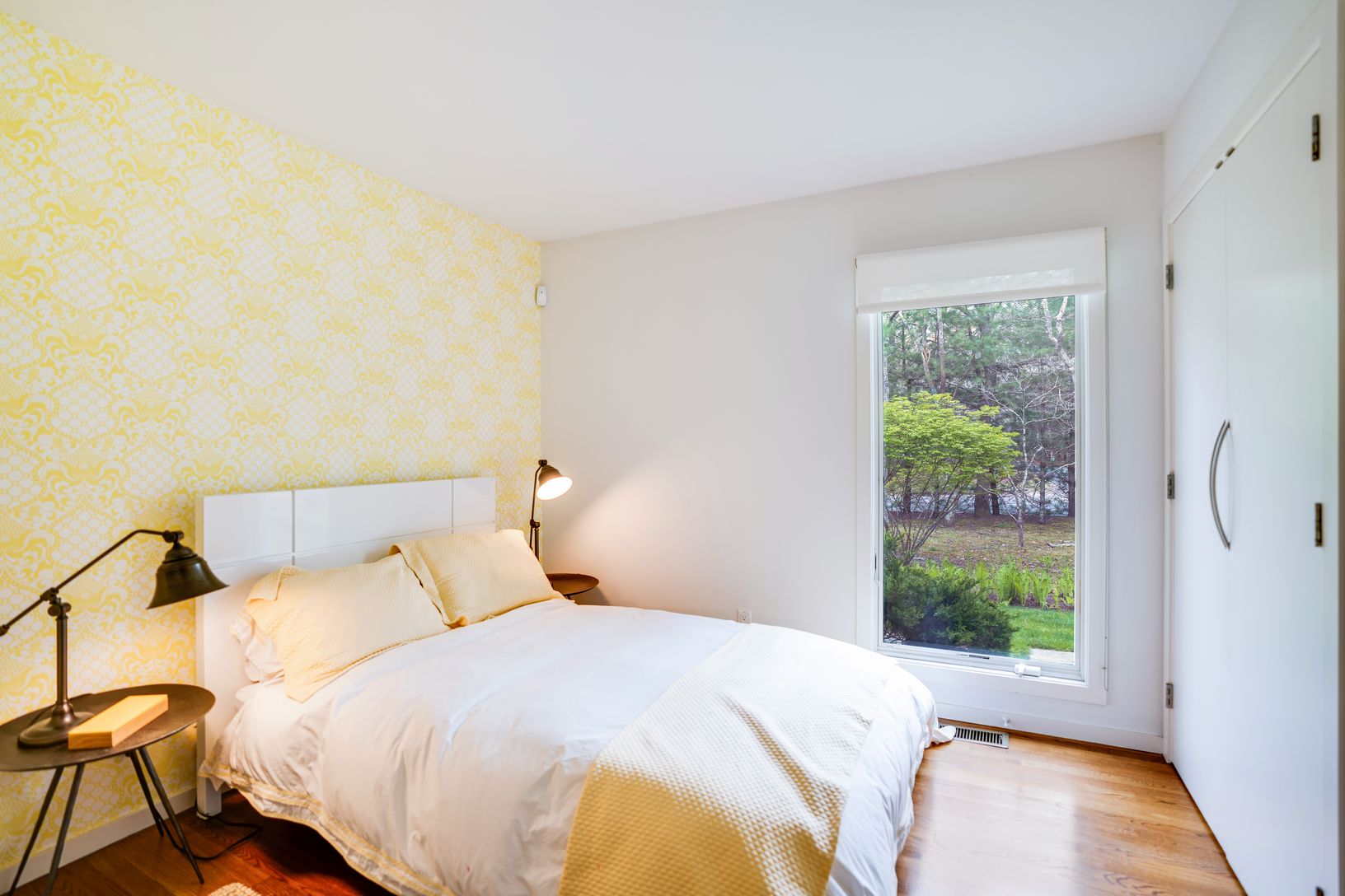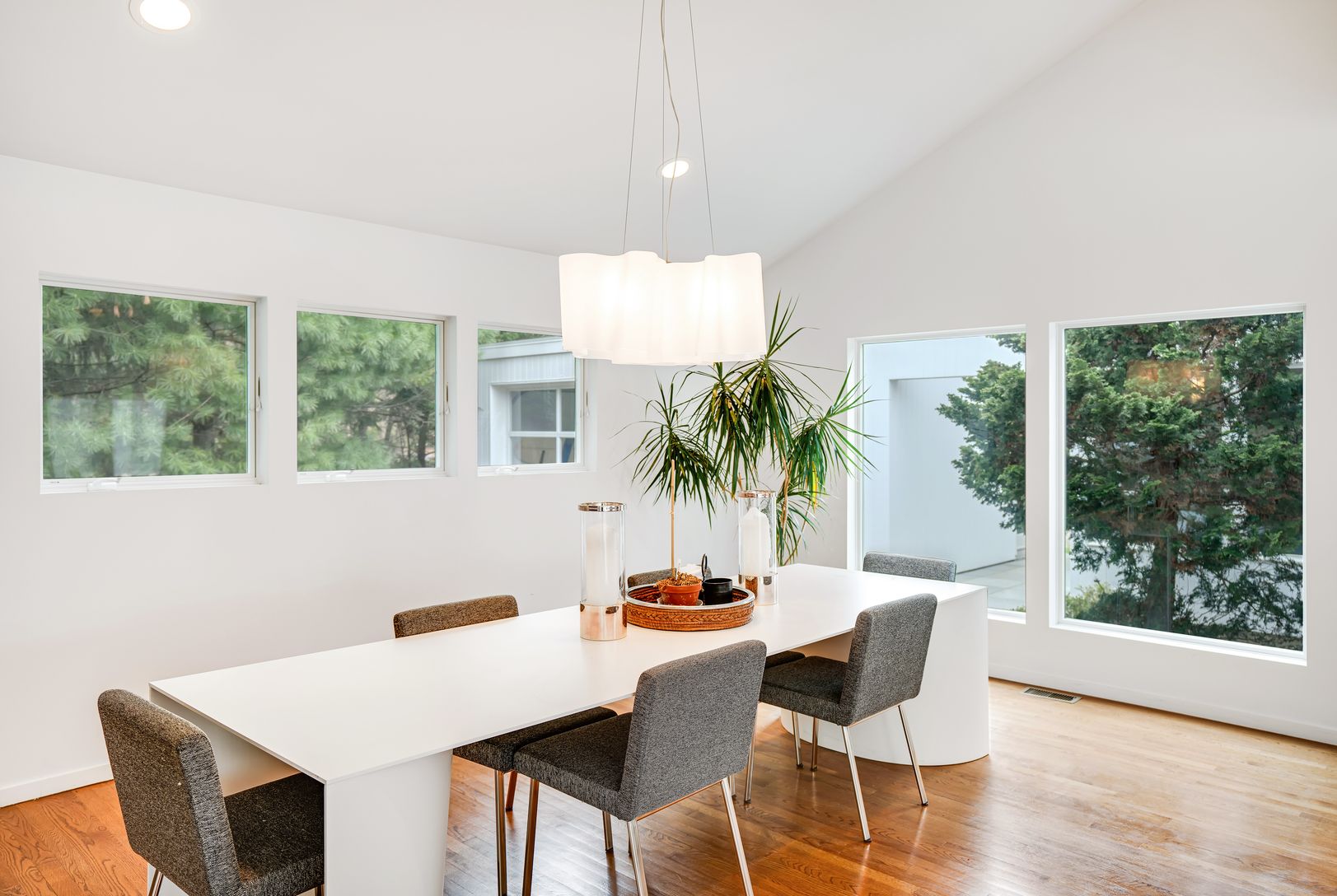 This architect-designed one-level modern home seamlessly integrates indoor and outdoor spaces, boasting soaring ceilings and glass walls that frame the wooded setting. A 40 ft. heated gunite pool, ensconced in lush landscaping, offers panoramic views from every room. The open layout features a sleek cook's kitchen with Viking Double Oven, Sub Zero, Fisher Paykel appliances, two prep sinks, two refrigerators, a walk-in pantry, and a 15 ft. quar